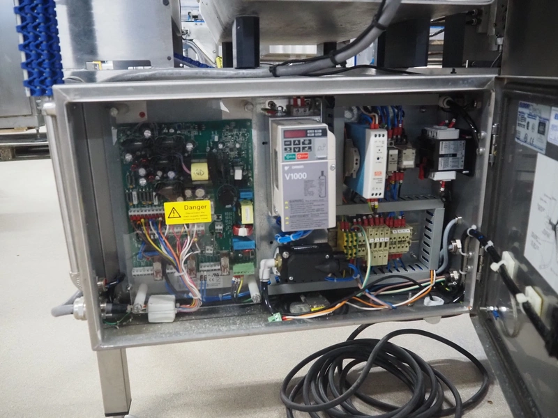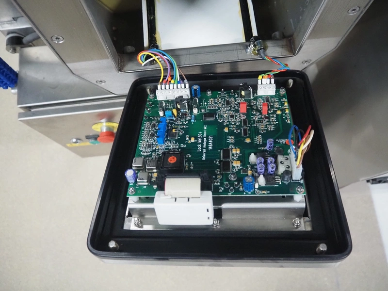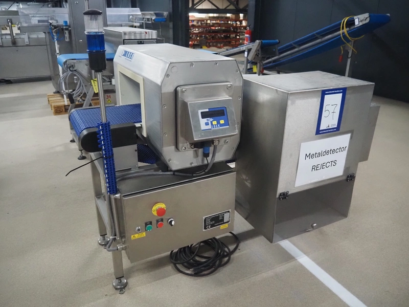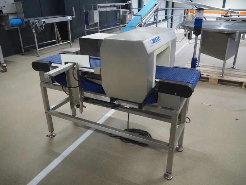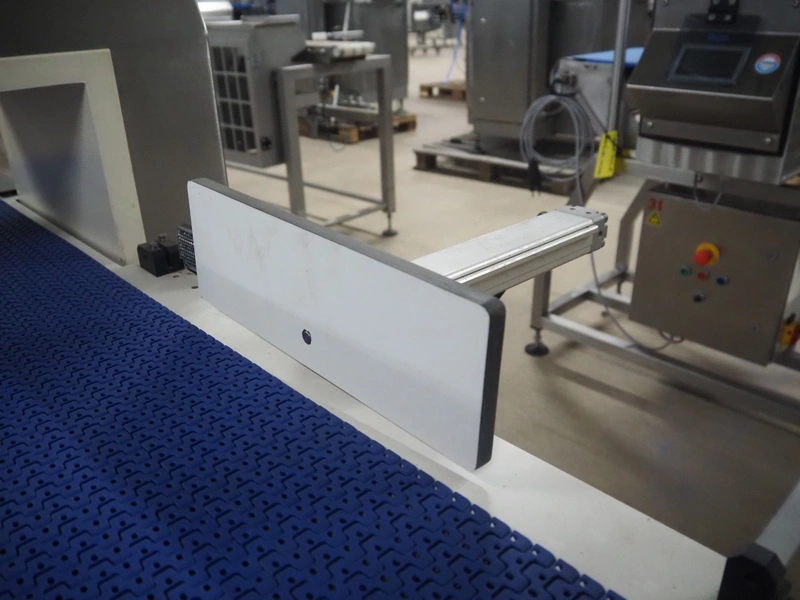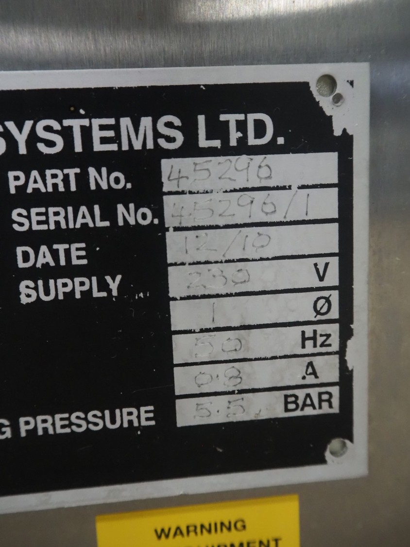 Lock Inspection Systems Ltd metal detector with rejector, serial number: 45296/1, year of construction: 12/10, 230 V, 1 Ph, 50 0.8 A, 5.5 bar, plastic belt, belt width: 300 mm, clearance: 350 mm x 170 mm, total dimensions: 1550 mm x 1100 mm x 1300 mm.