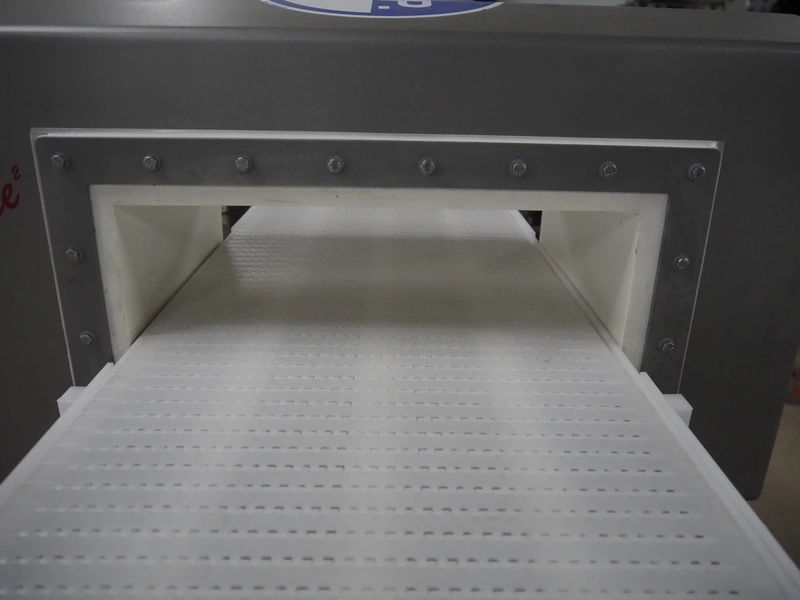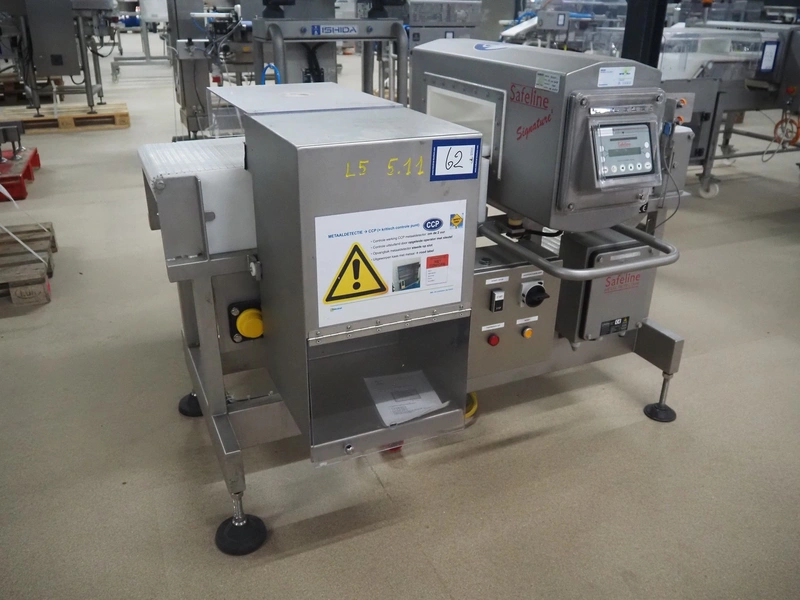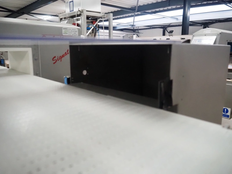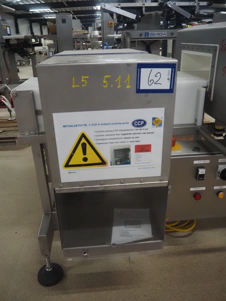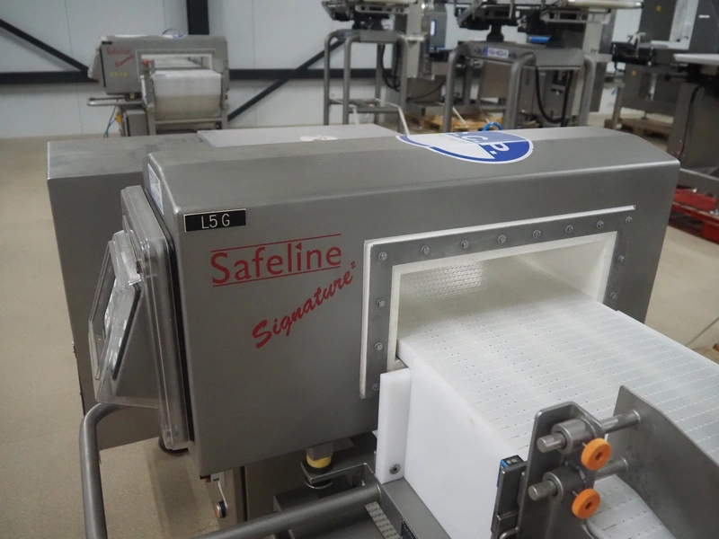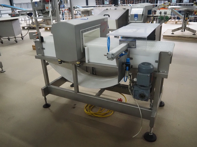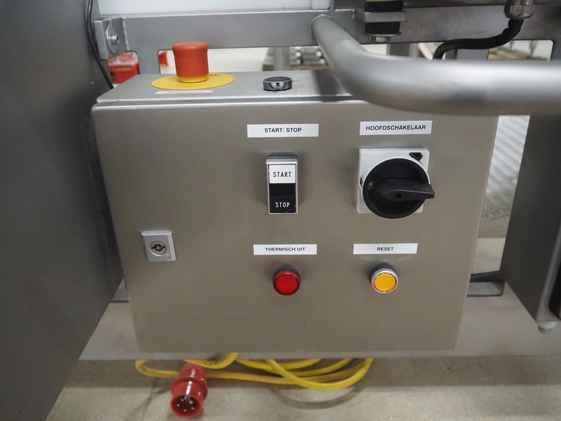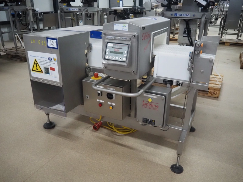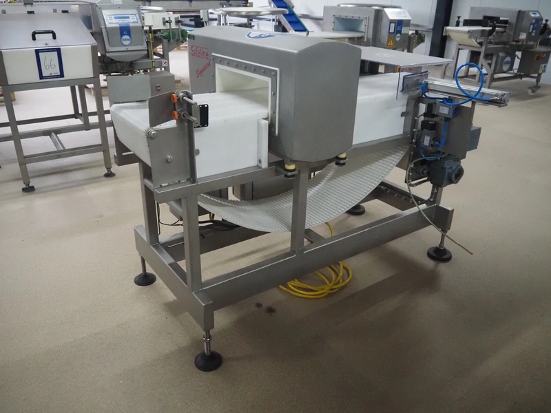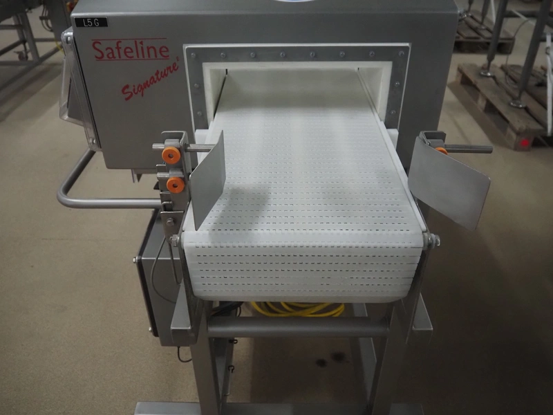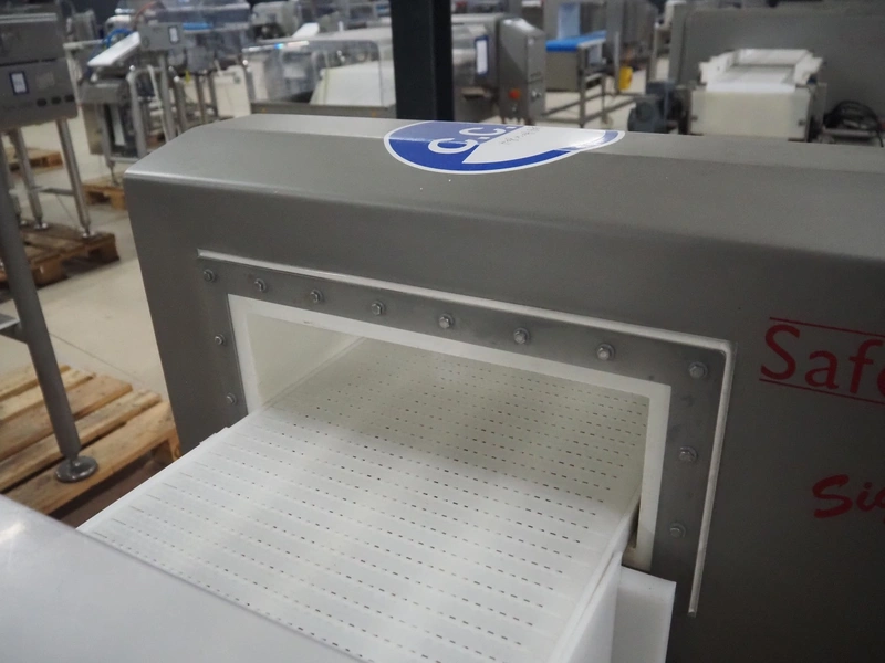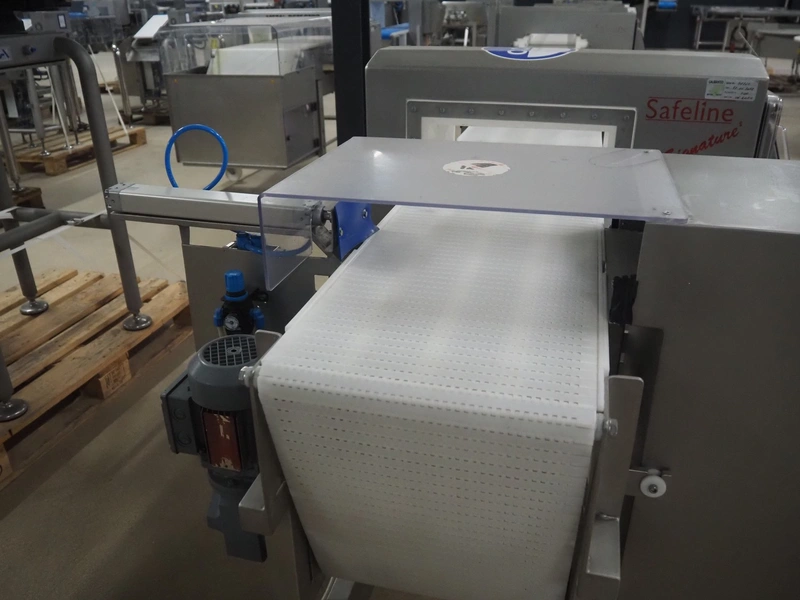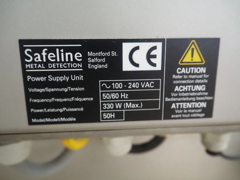 Safeline metal detector with rejector, serial number: 41261, year of construction: 4/2000, 100-240 Vac, 50/60 Hz, 330 W, plastic belt, belt width: 327 mm, clearance: 350 mm x 95 mm, total dimensions: 1550 mm x 1180 mm x 1130 mm.