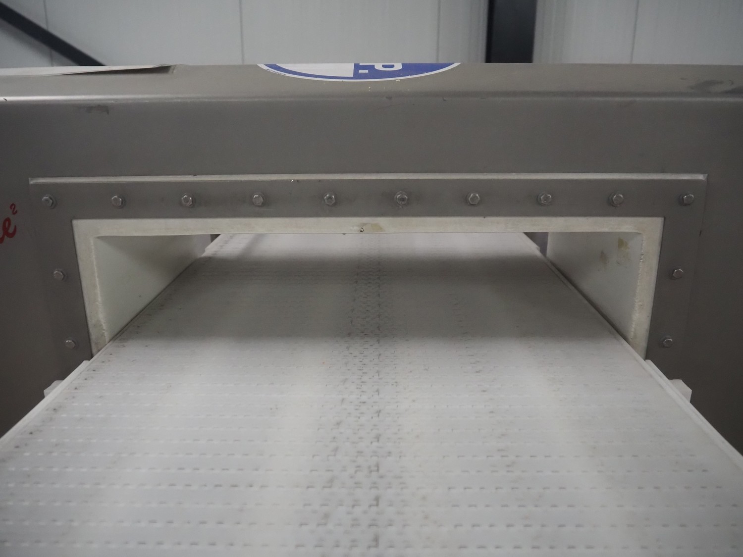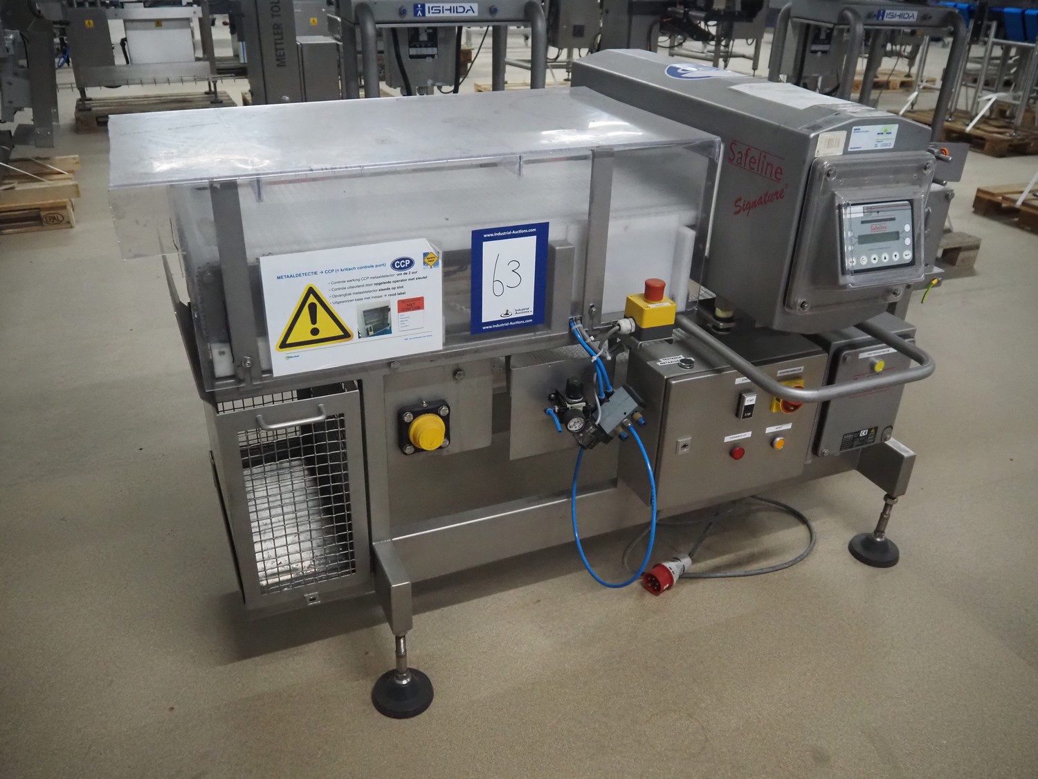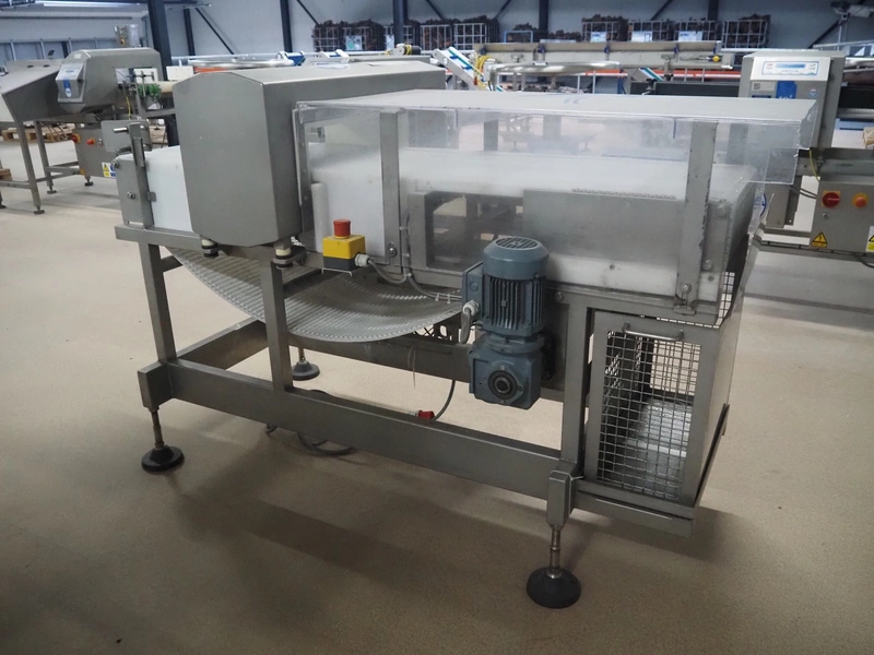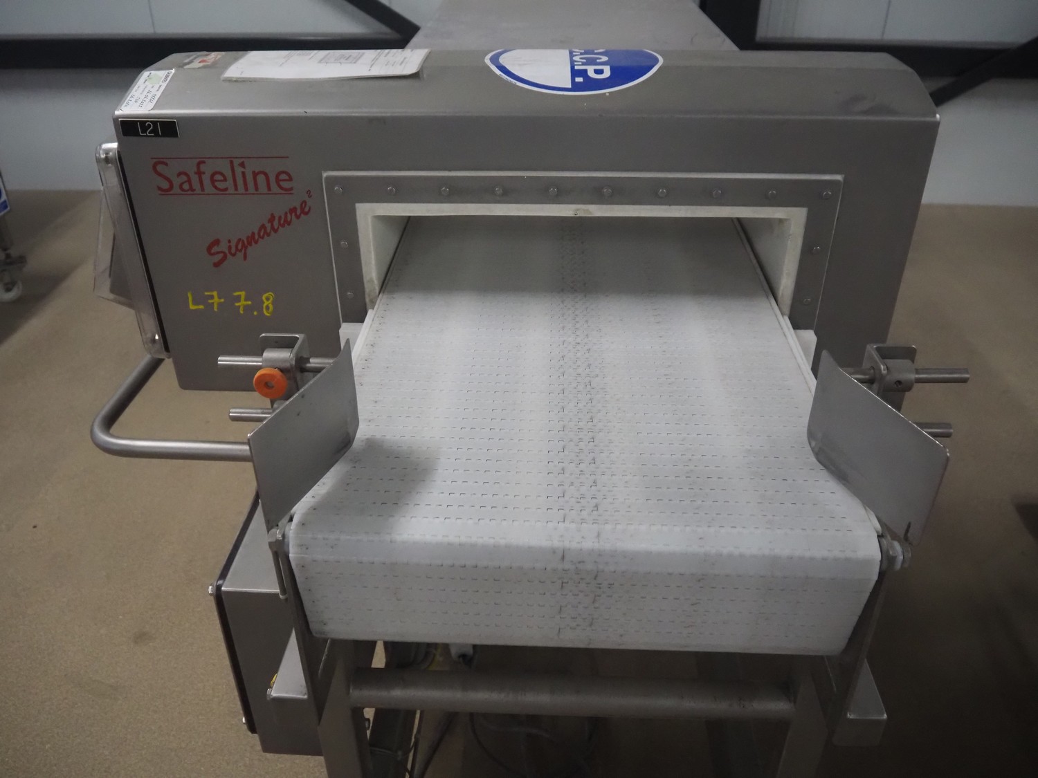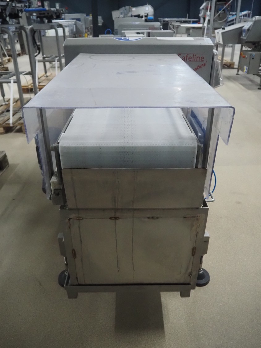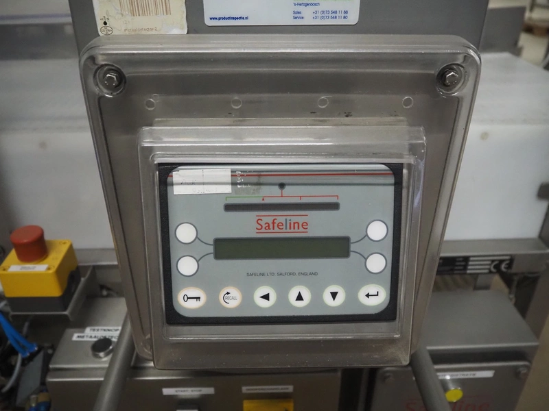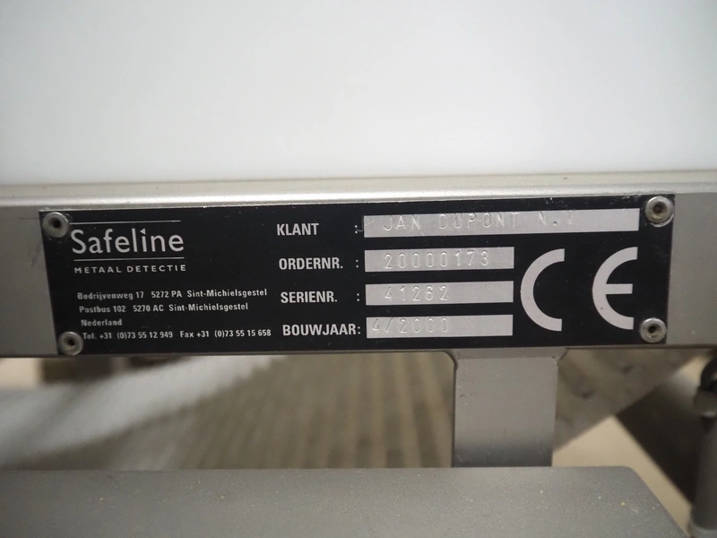 Safeline metal detector, serial number: 41262, year of construction: 4/2000, 100-240 Vac, 50/60 Hz, 330 W, plastic belt, belt width: 430 mm, clearance: 450 mm x 95 mm, total dimensions: 1750 mm x 1050 mm x 1130 mm.