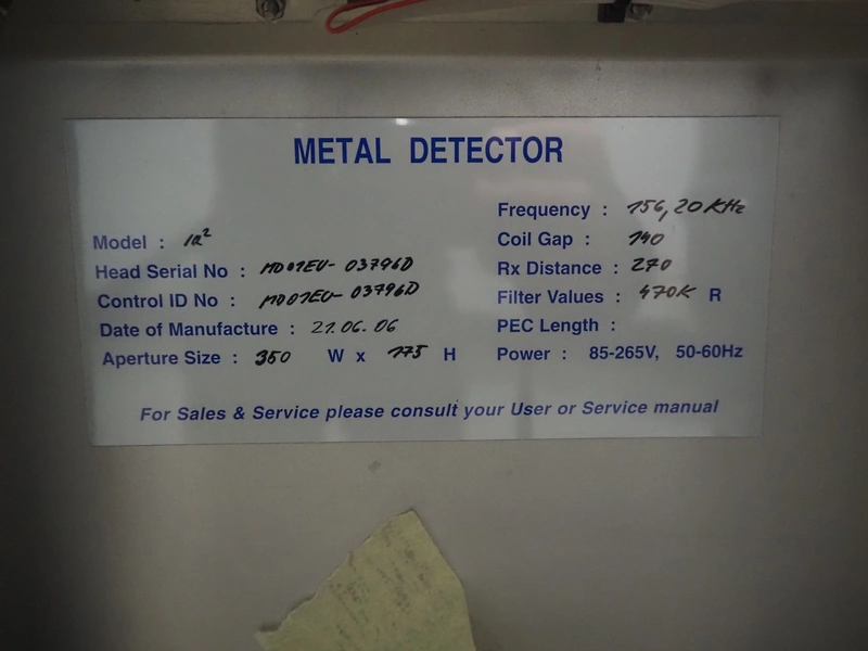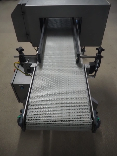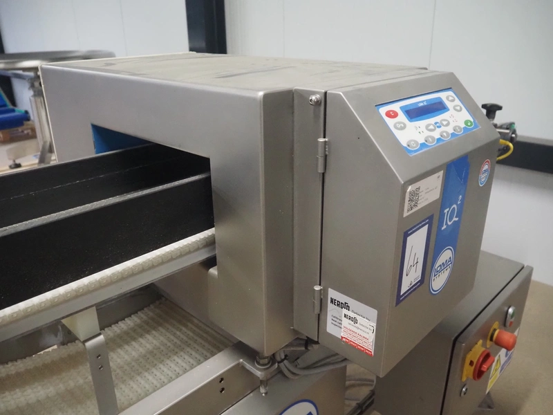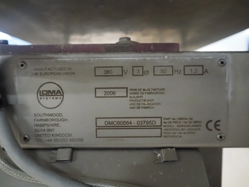 Loma Systems mobile metal detector, model: IQ2, serial number: DMC60564-03795D, year of construction: 2006, 380 V, 3 Ph, 50 Hz, 1.2 A, plastic mesh belt, belt width: 300 mm, clearance: 250 mm x 130 mm, total dimensions: 2100 mm x 850 mm x 1150 mm.
