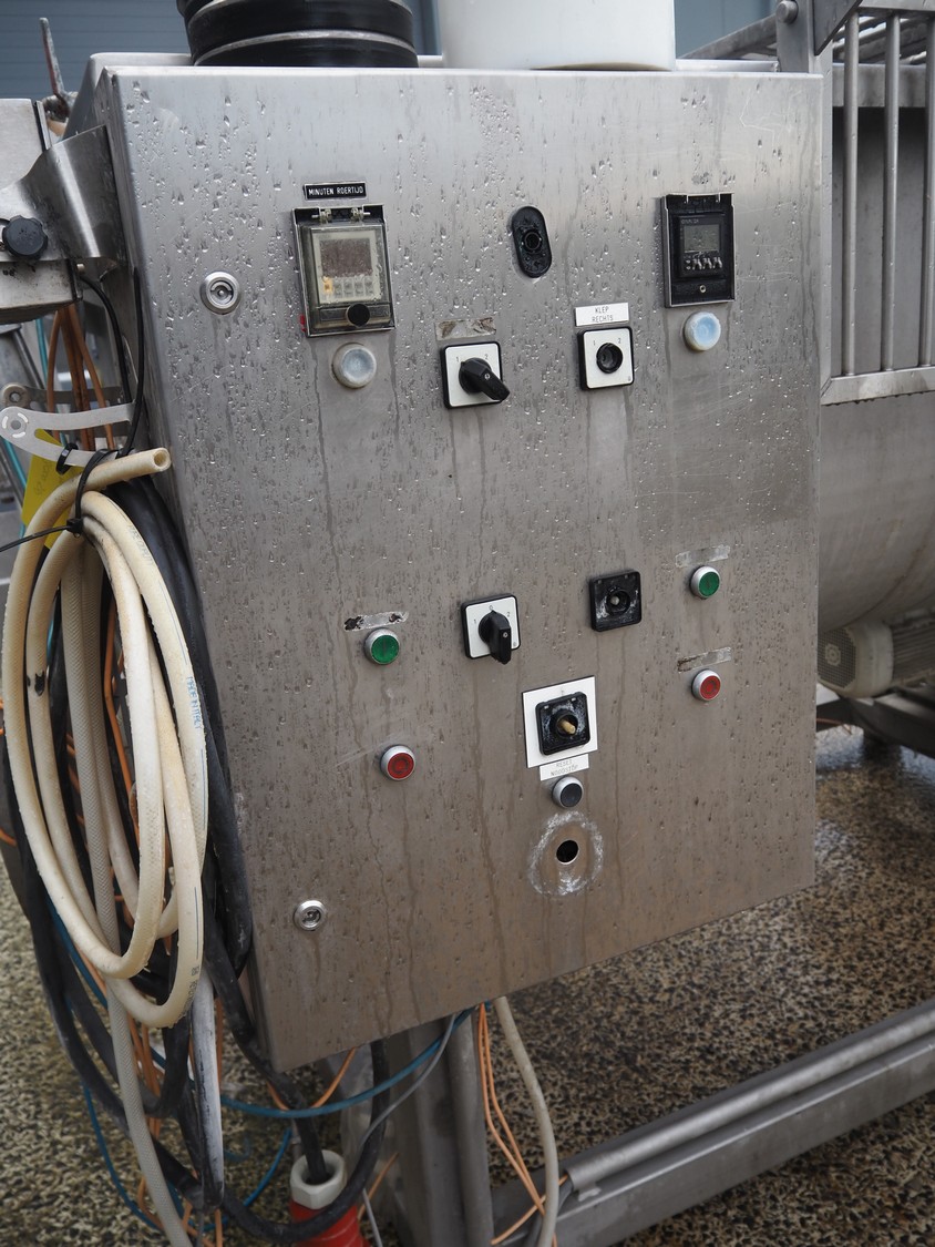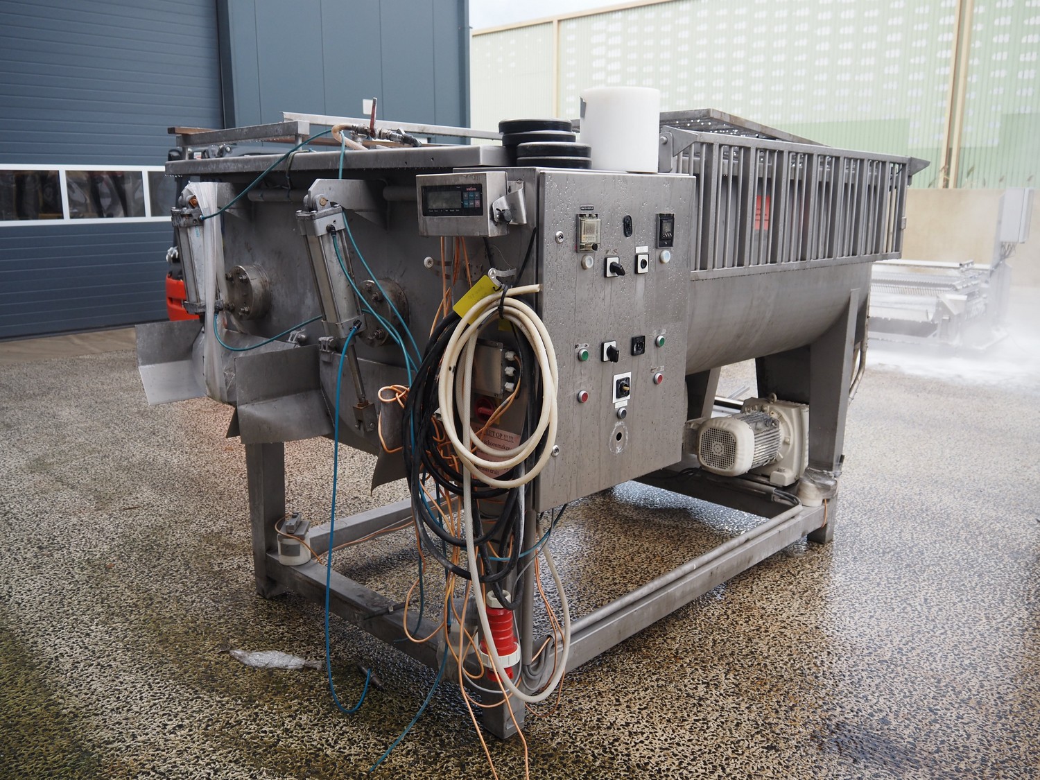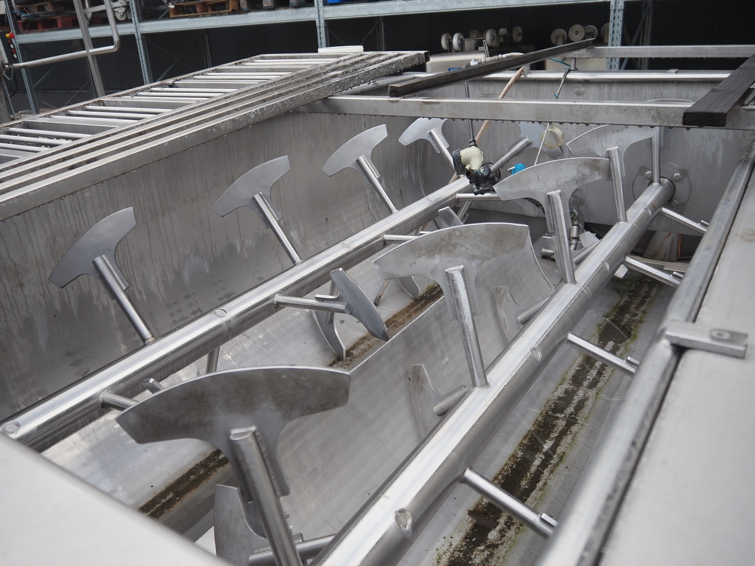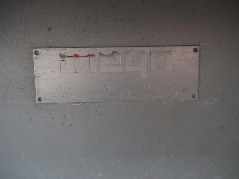 Meyn double shaft paddle mixer on weighing cells, machine number: 49433, year of construction: 1992, inside dimensions drum: 2500 mm x 1500 mm x 700 mm, total dimensions: 3100 mm x 1800 mm x 1850 mm.