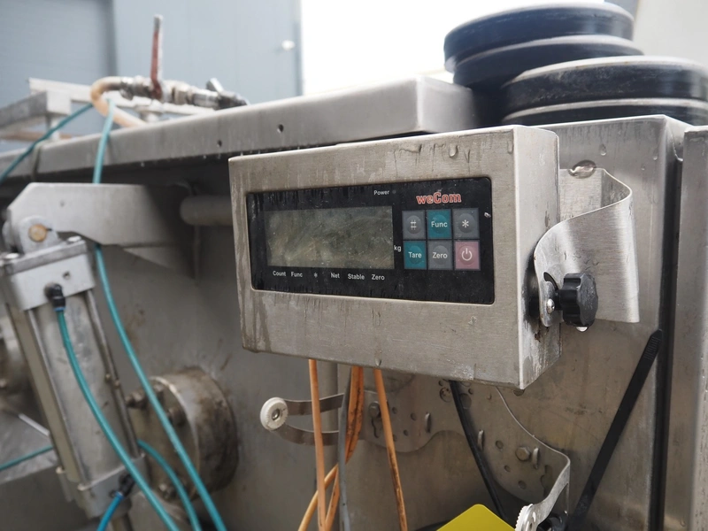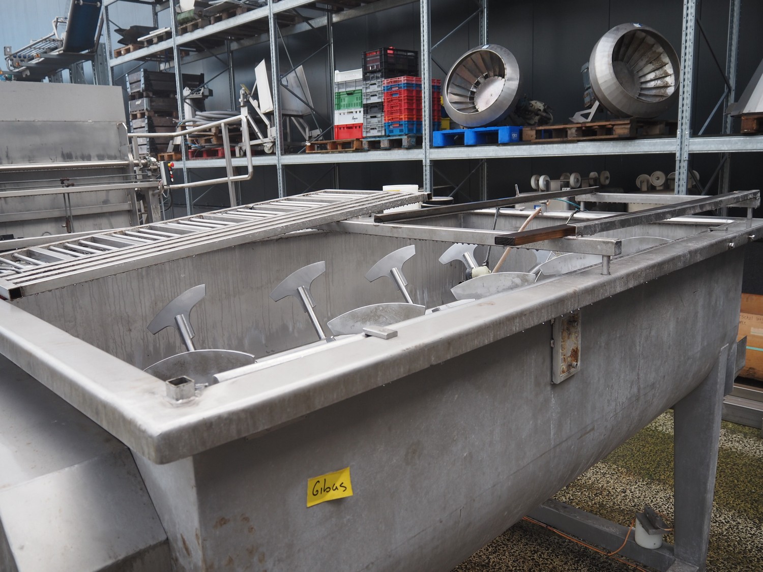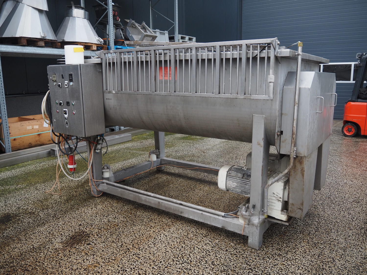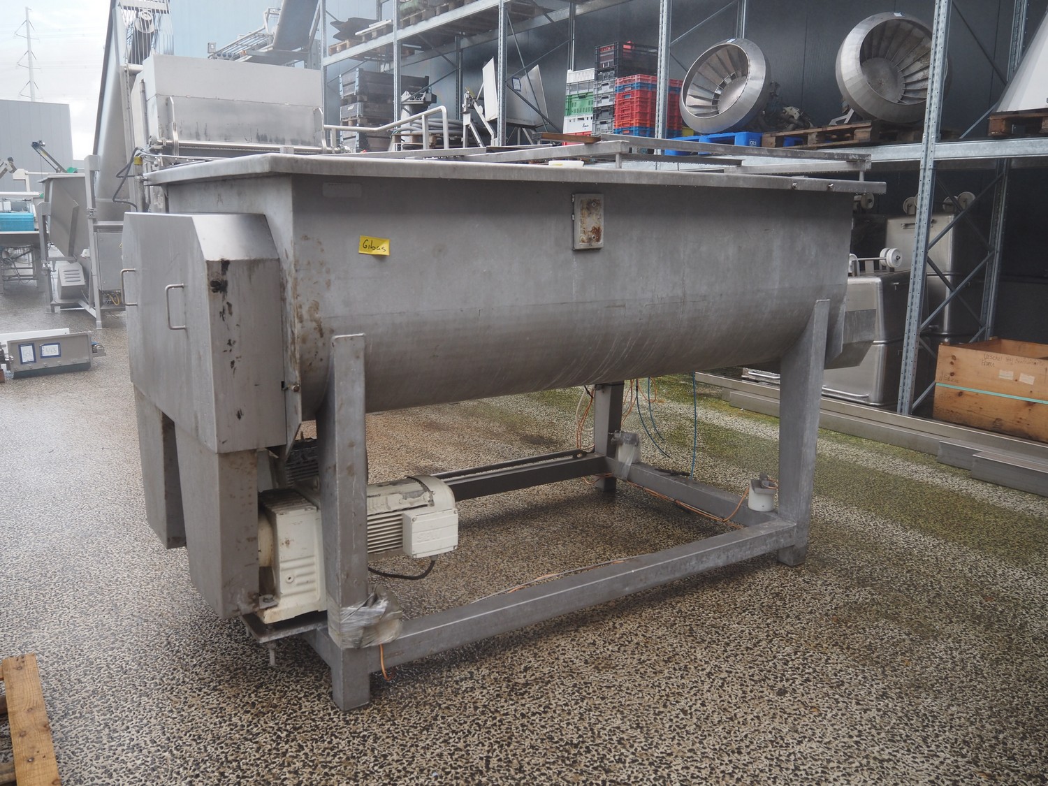 Meyn double shaft paddle mixer on weighing cells, machine number: 49433, year of construction: 1992, inside dimensions drum: 2500 mm x 1500 mm x 700 mm, total dimensions: 3100 mm x 1800 mm x 1850 mm.