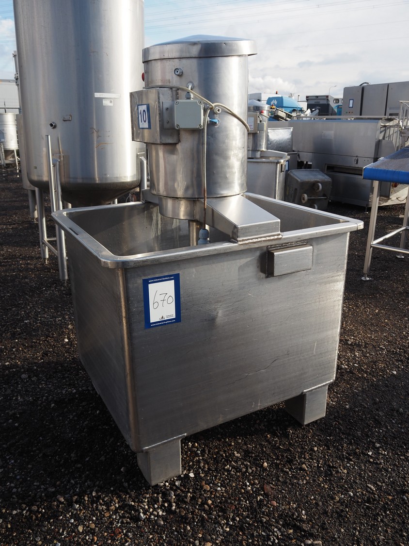 S/s mixing tub, inside dimensions: 1110 mm x 920 mm x 850 mm, total dimensions: 1230 mm x 1050 mm x 1850 mm.