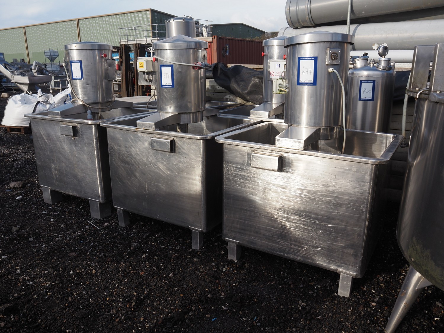 5 s/s mixing tubs, inside dimensions: (5x) 1110 mm x 920 mm x 850 mm, total dimensions: (5x) 1230 mm x 1050 mm x 1850 mm.