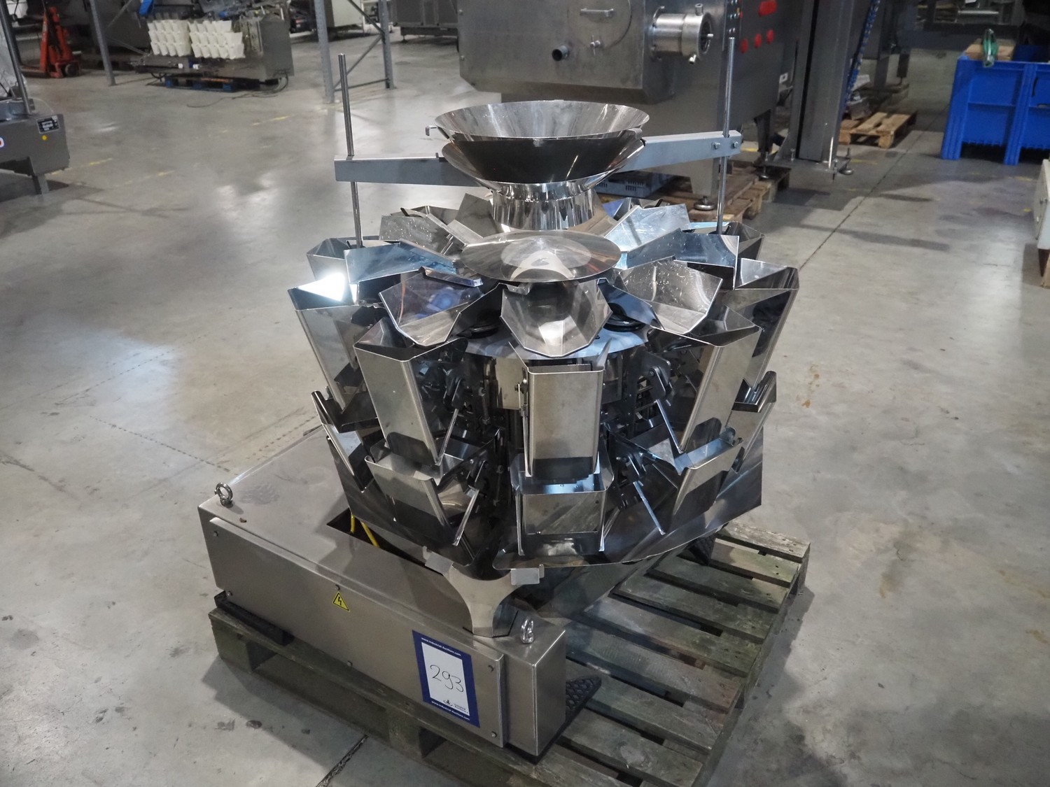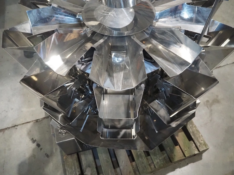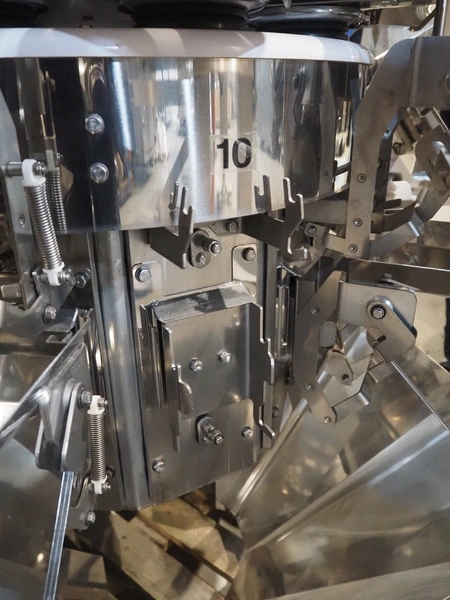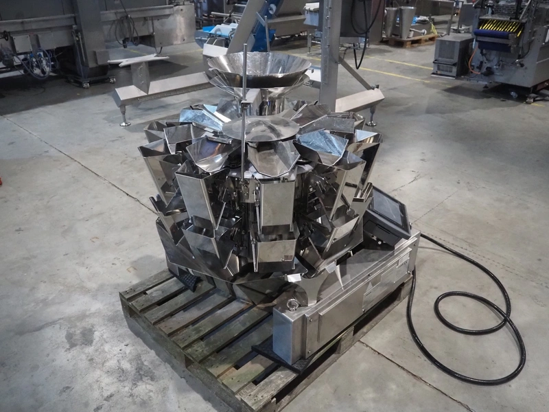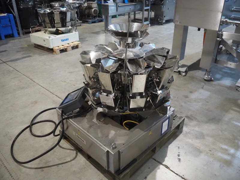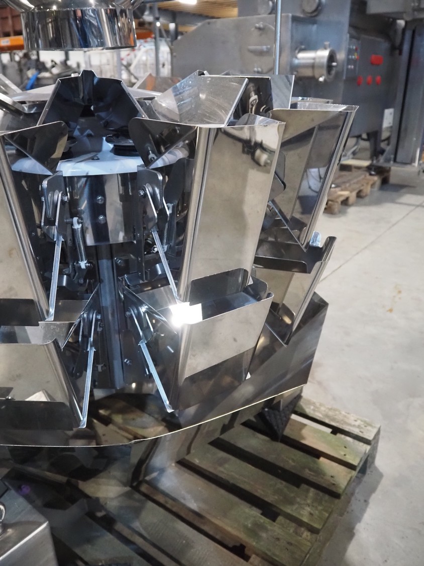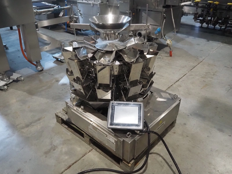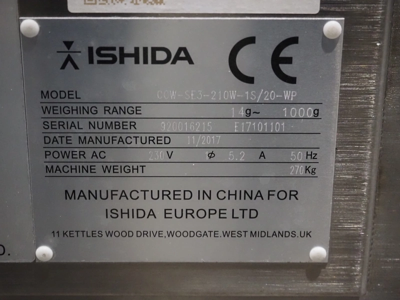 Ishida 10 head multihead weigher, model: CCW-SE3-210W-1S/20-WP, serial number: 920016215 E17101101, year of construction: 11/2017, 230 V, 1 Ph, 50 Hz, 5.2 A, minimum capacity: 14 g, maximum capacity: 1000 g, total dimensions: 1100 mm x 1000 mm x 1300 mm.