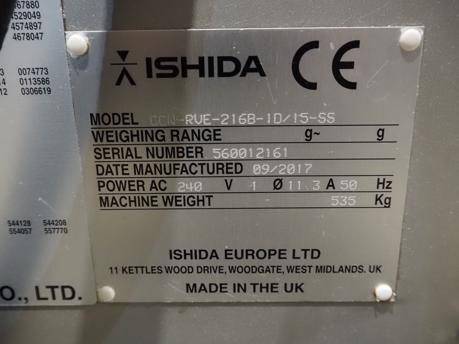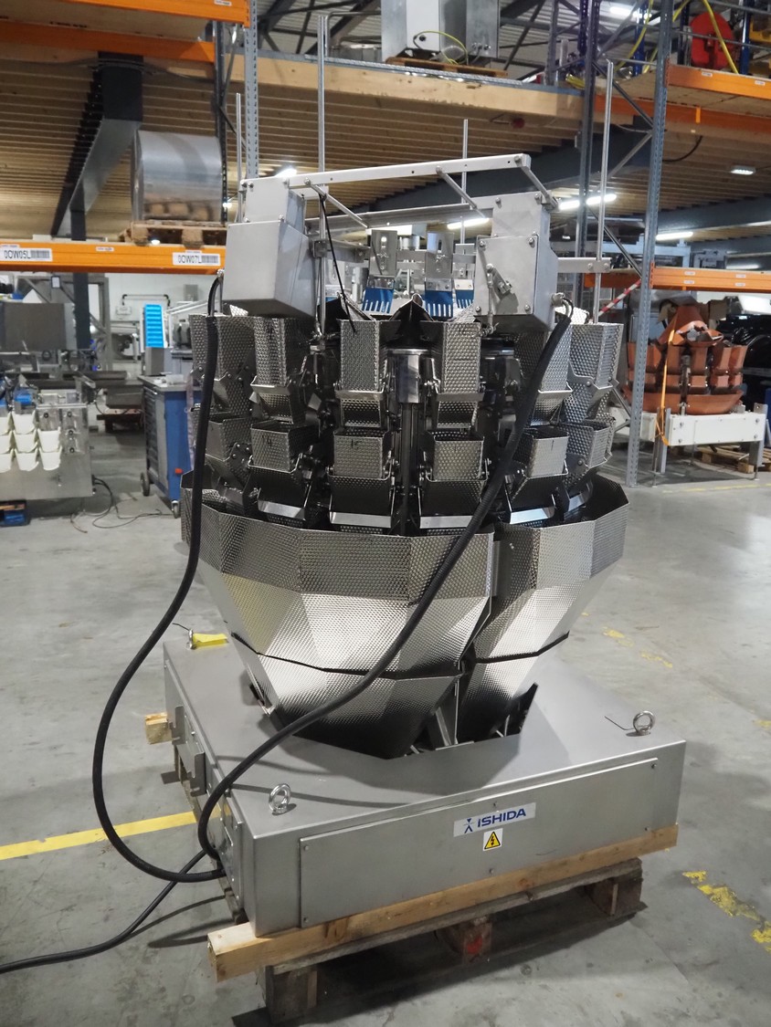 Ishida 16-heads multihead weigher, model: CCW-RVE-216B1D/15-SS, serial number: 560012161, year of construction: 08/2017, 240 V, 1 Ph, 50 Hz, 11.3 A, weight: 535 kg, dimensions: 1750 mm x 1600 mm x 2850 mm.