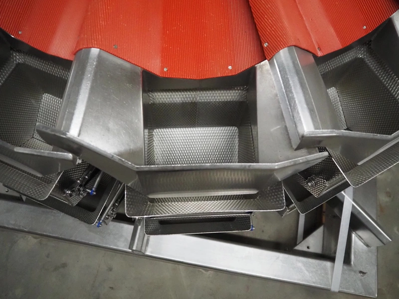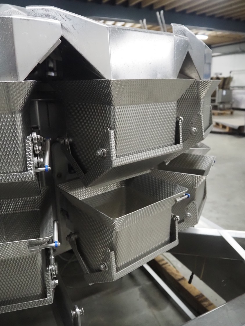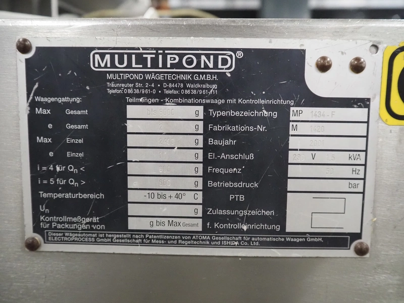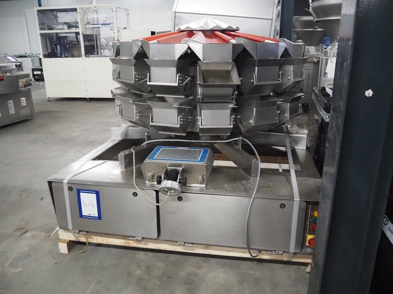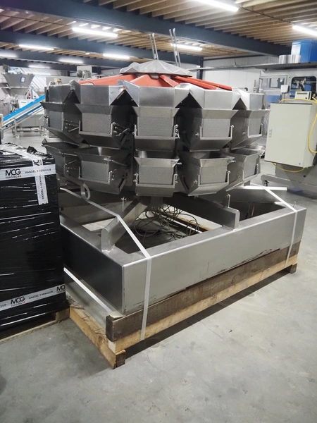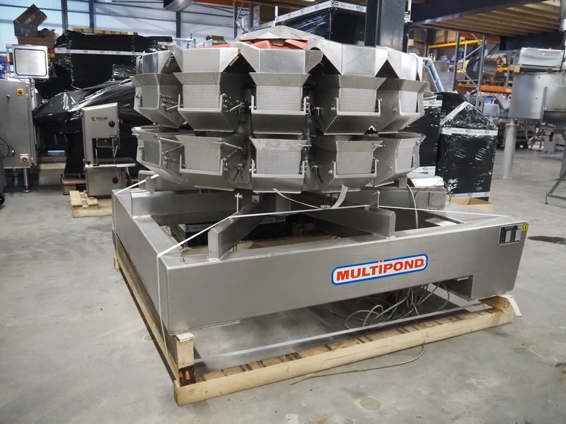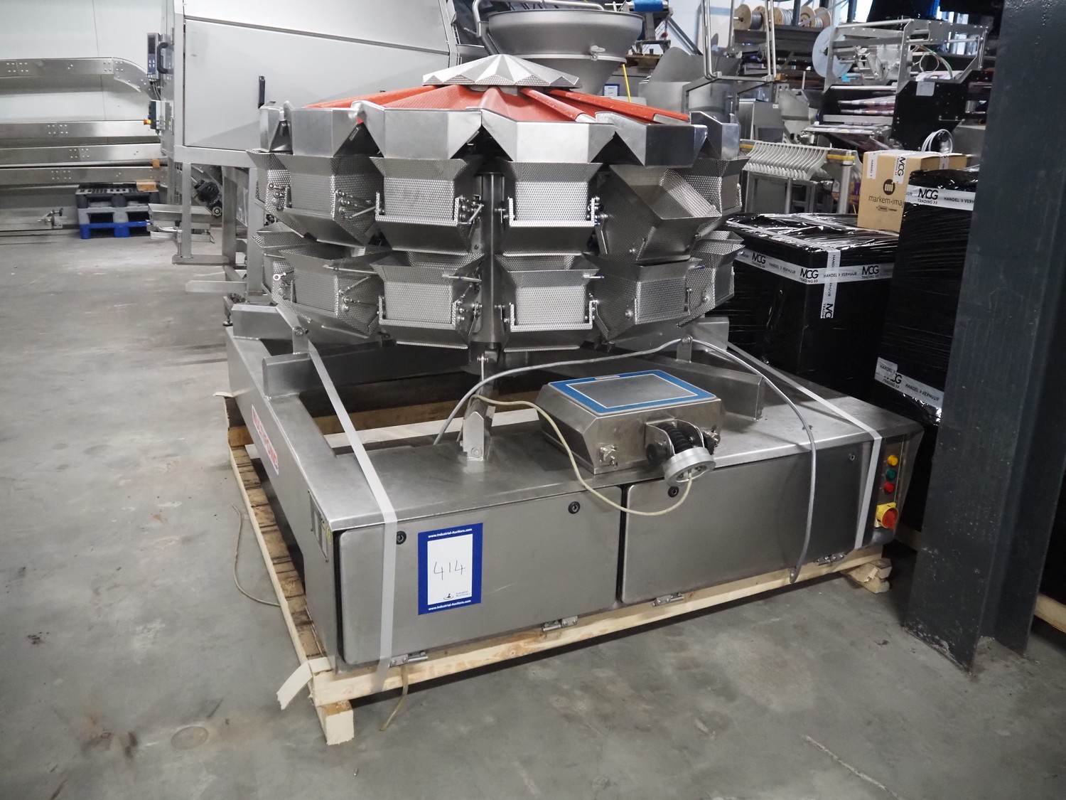 Multipond 14-heads multihead weigher, type: MP 1434-F, fabrication number: M 1420, year of construction: 2001, 230 V, 50 Hz, maximum weight: 2400/6000 gram, e=: 1/2 gram, dimensions: 1550 mm x 1900 mm x 1300 mm.