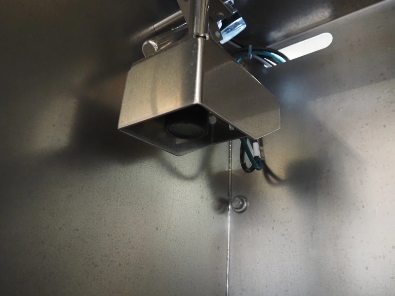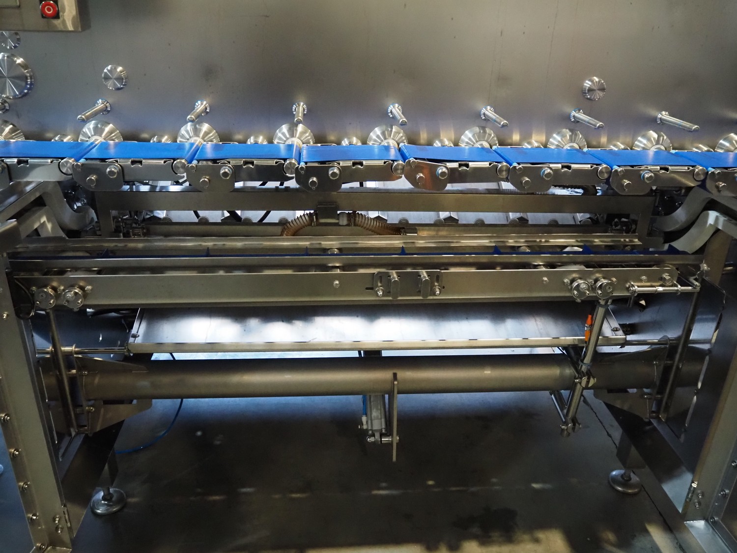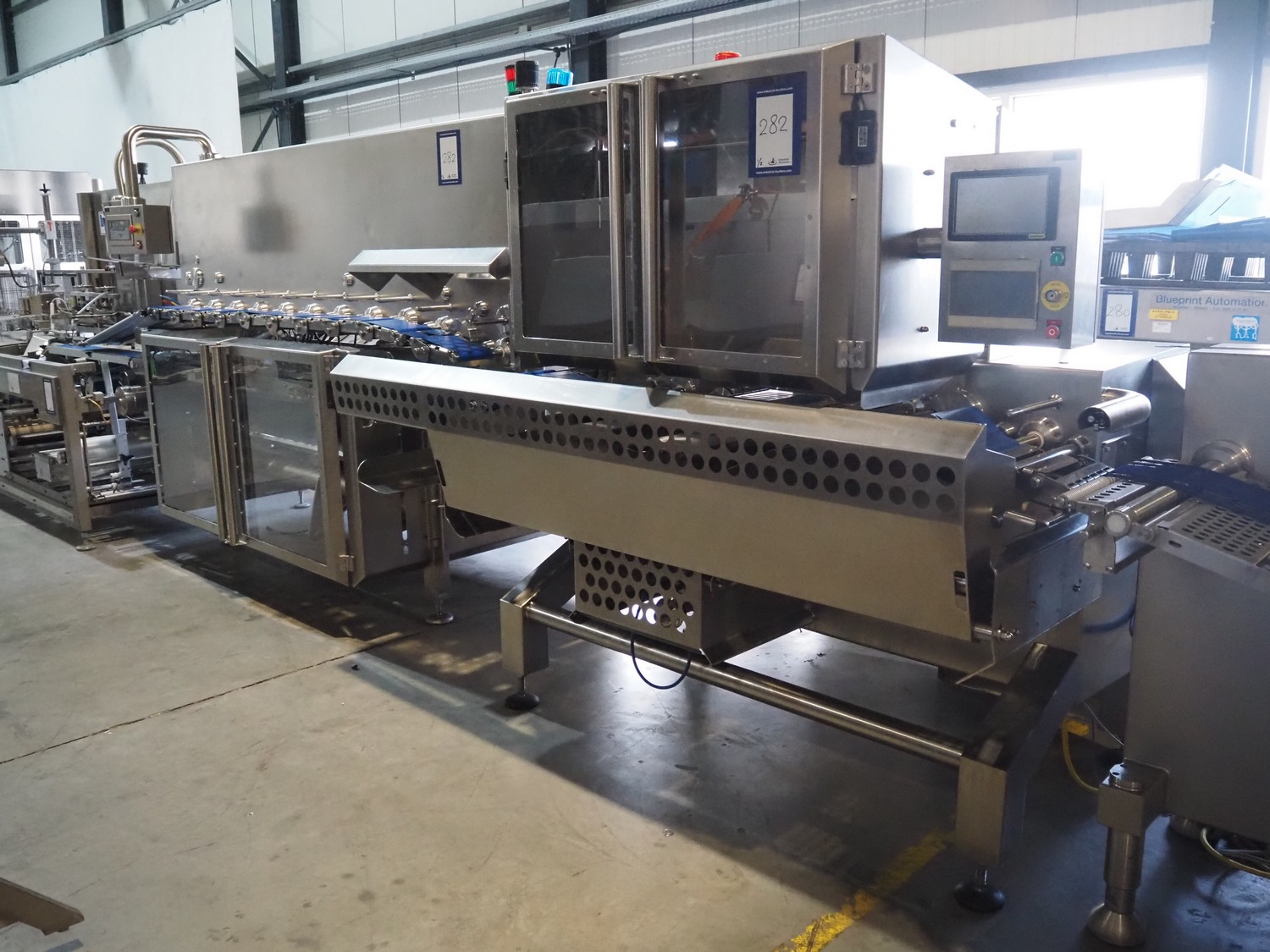 Automation Systems outfeed belt inliner for flowpacker, type: DNT101, year of construction: 2015, 400 V, 3 Ph, 18 A, 7 KW, plastic belt, belt width: 190 mm, 405 and 50 mm, tray dimensions: 175 mm x 125 mm, distance between dividers: 245 mm, total dimensions: 5750 mm x 2000 mm x 2150 mm.