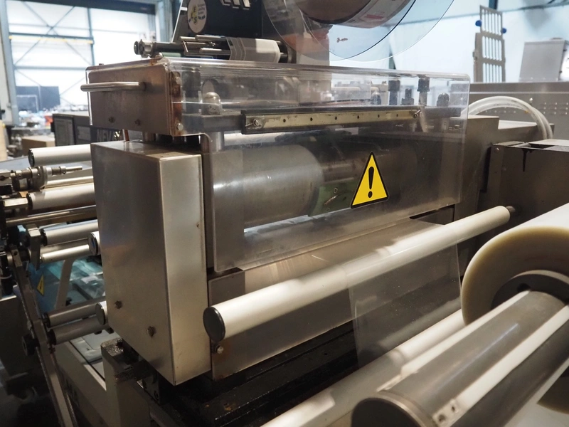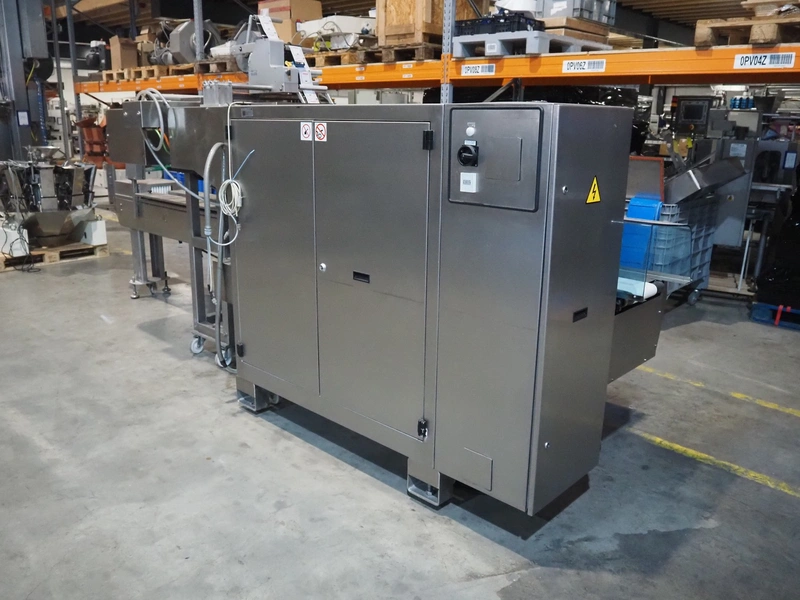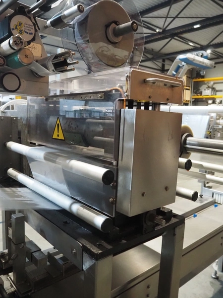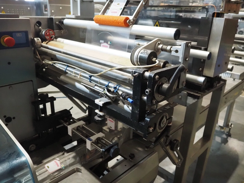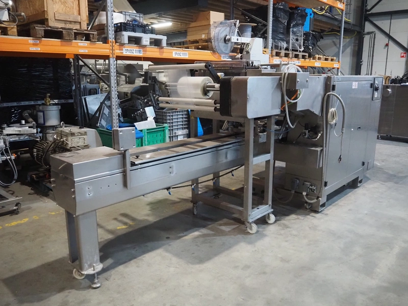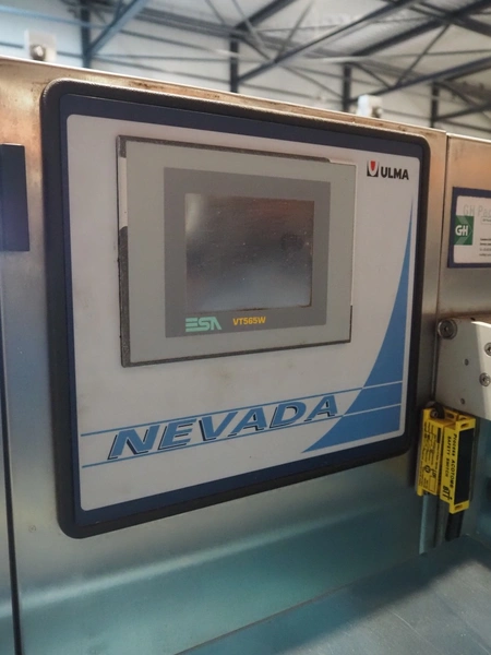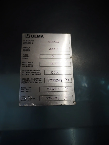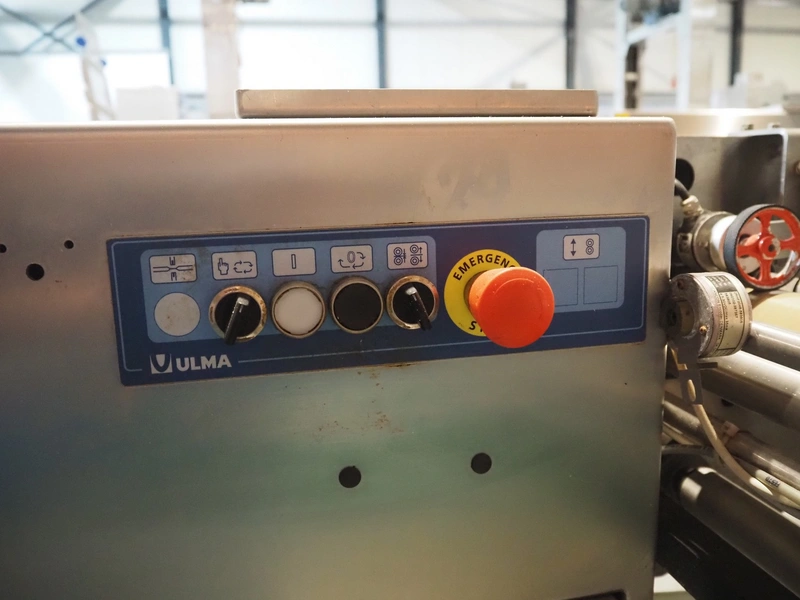 Ulma mobile flowpacker, model: Nevada BS, number: 130052, year of construction: 2003, 380 V, 50 Hz, 23 A, 5 kW, ELS labelling machine, infeed belt with dividers, belt width: 150 mm, distance between dividers: 300 mm, divider height: 30 mm, seal width: 300 mm, plastic outfeed belt, belt width: 200 mm, total dimensions: 4500 mm x 1300 mm x 1150 mm.