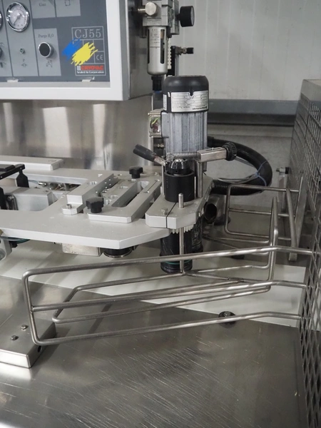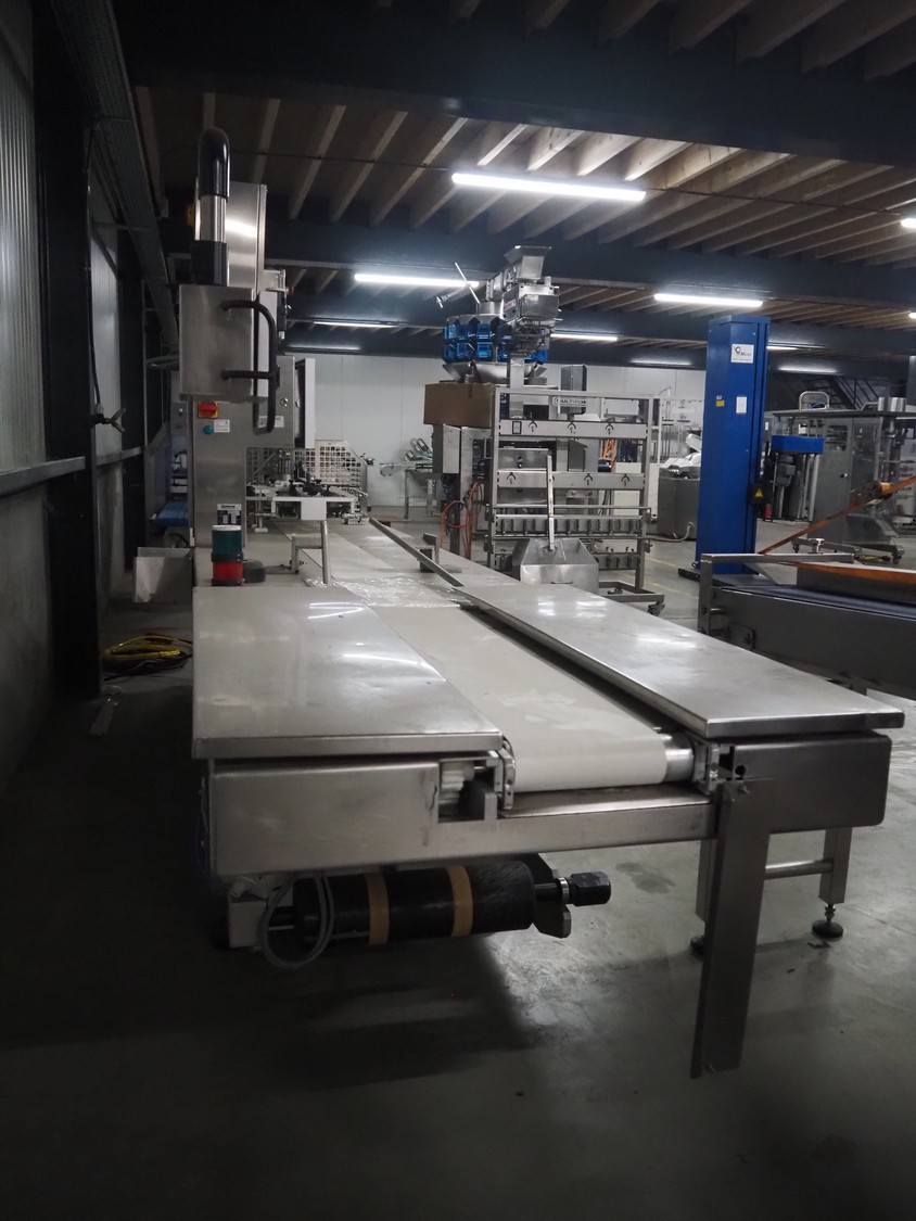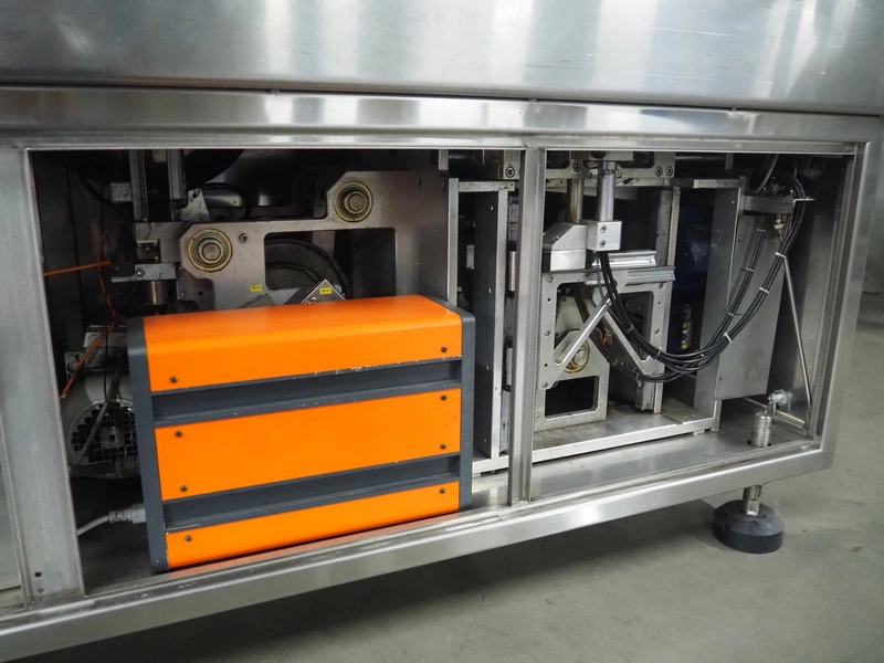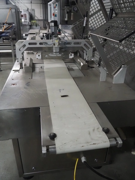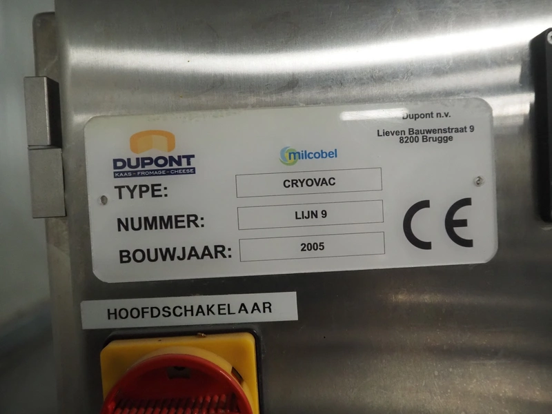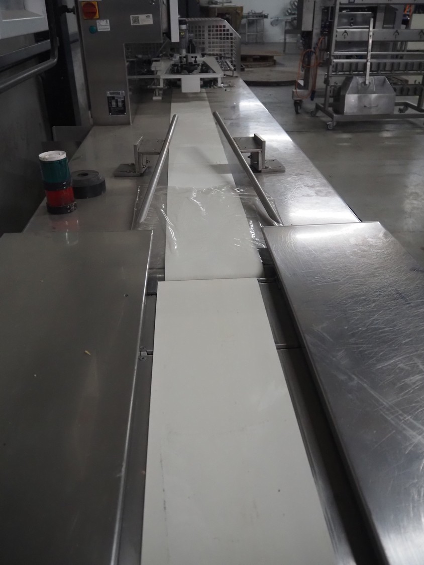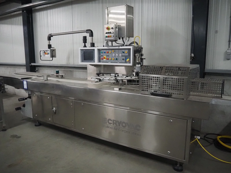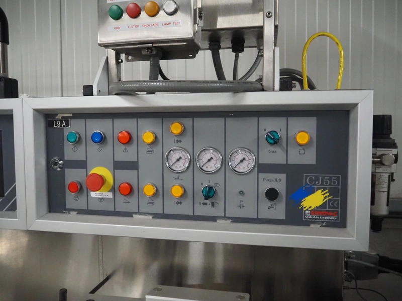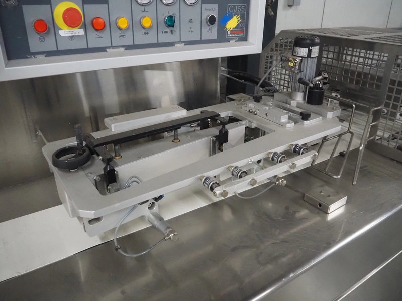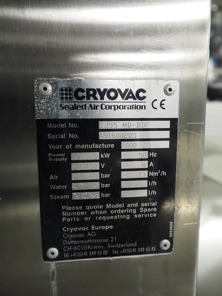 Cryovac horizontal form, fill and seal machine, type: CJ55 MD-BDF, serial number: A91600205, year of construction: 2000, 400 V, 50 Hz, 8 A, 5 kW, plastic belt, belt width: (2x) 200 mm, seal width: 250 mm, clearance: 200 mm x 60 mm, total dimensions: 5000 mm x 1100 mm x 2300 mm.
