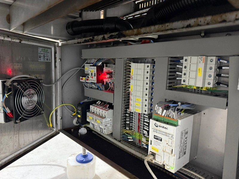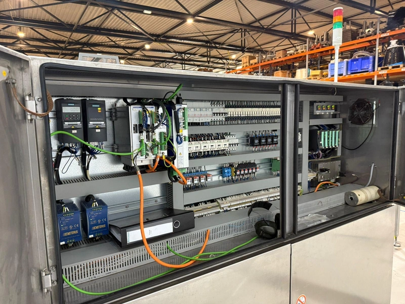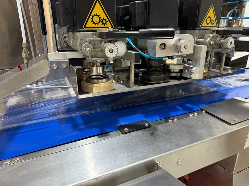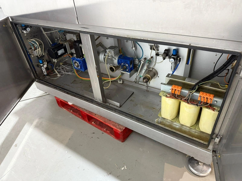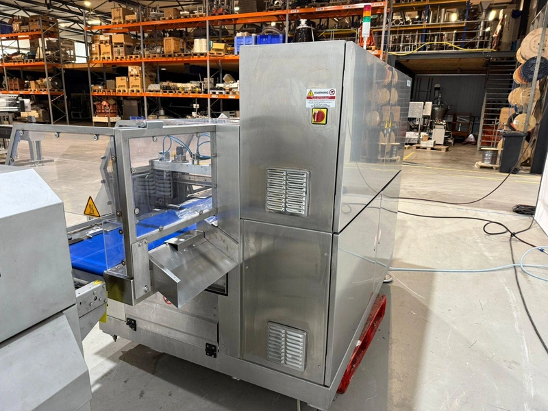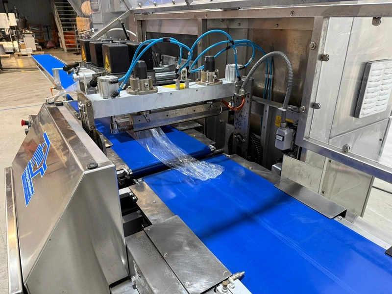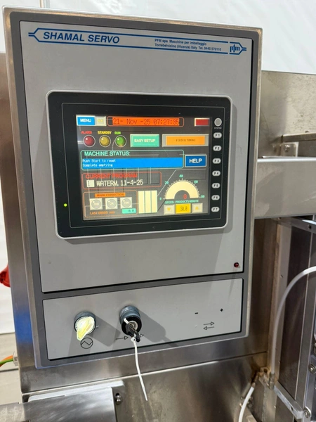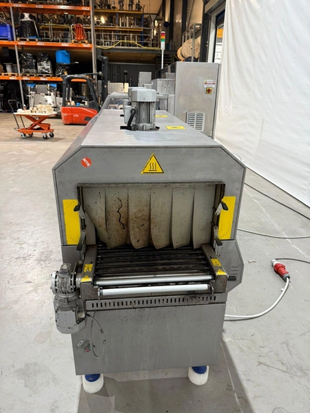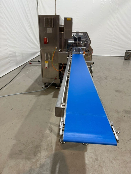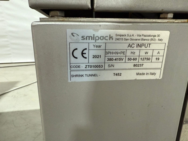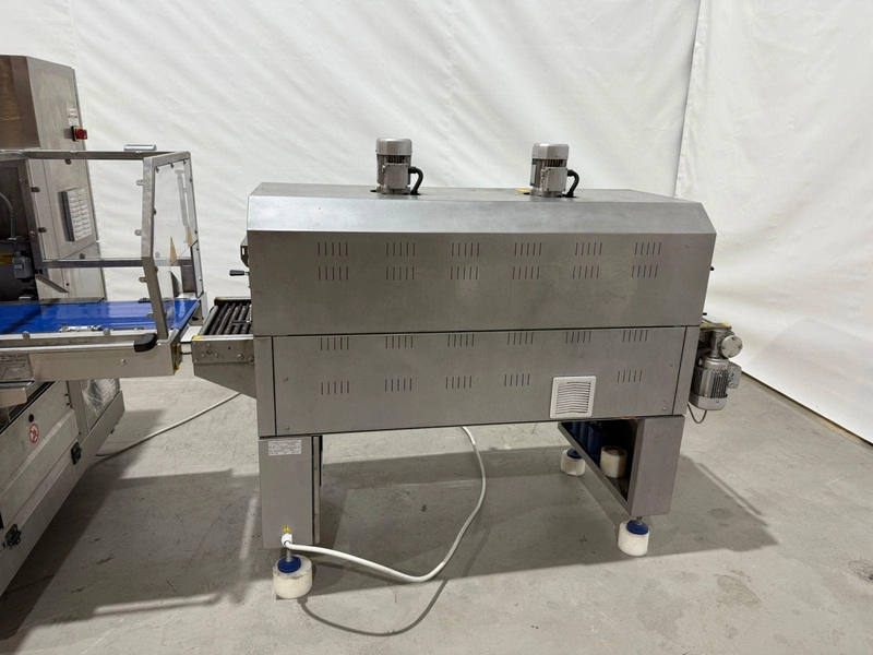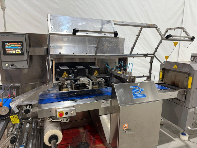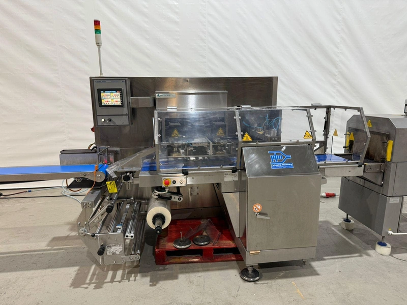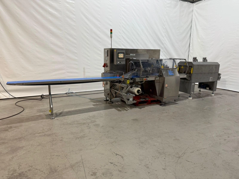 PFM flowpacker with Smipack shrink tunnel, model: Shamal, serial number: D.1624, year of construction: 2012, 400 V, 50 Hz, 12 A, 8 kW, 1100 kg, plastic belt, belt width: 250 mm, seal width: 340 mm, total dimensions flowpacker: 5400 mm x 1500 mm x 1600 mm, type Smipack: T452, serial number: 80237, year of construction: 2021, 380-415 V, 50-60 Hz, 19 A, 12750 W, total dimensions shrink tunnel: 1800 mm x 800 mm x 1500 mm.