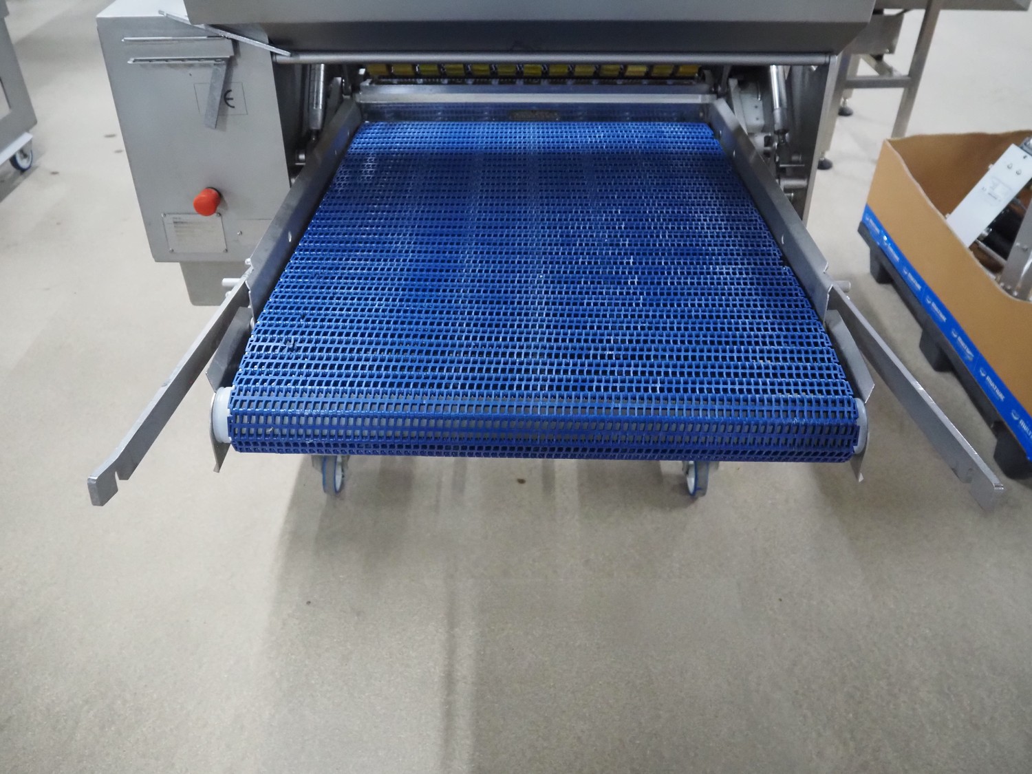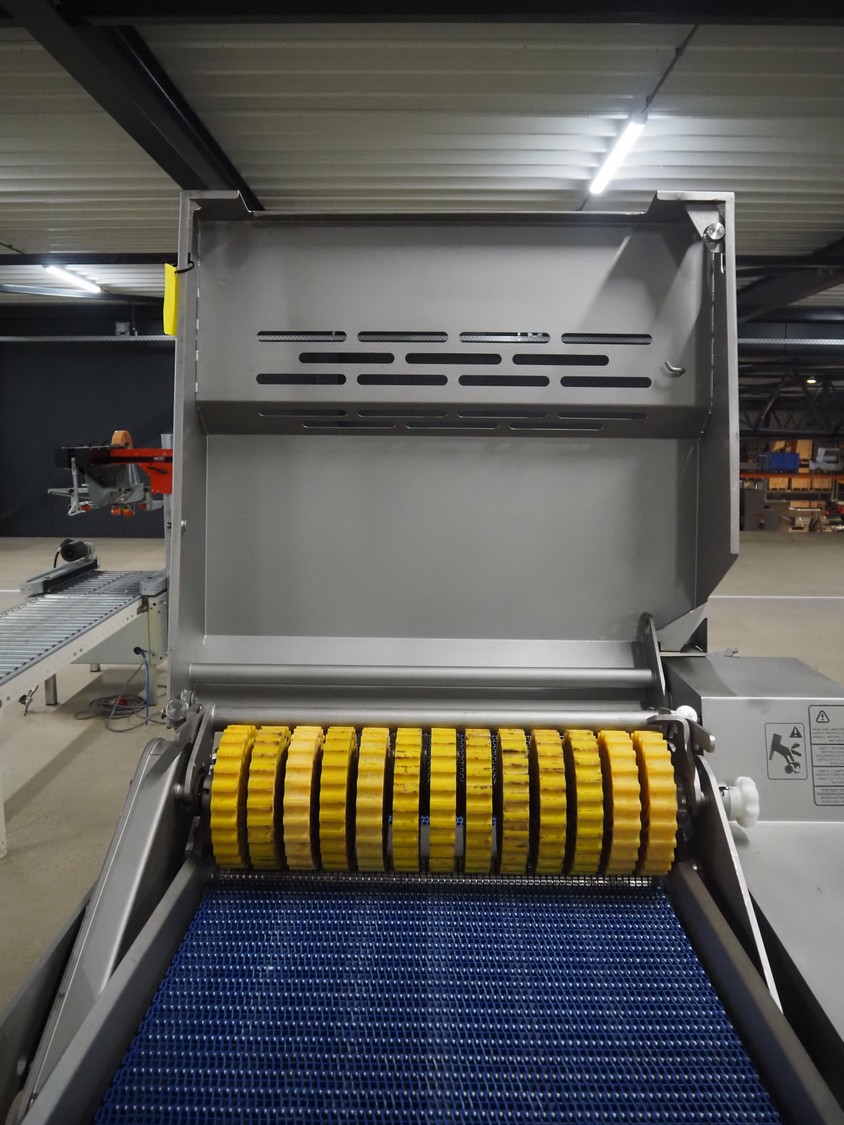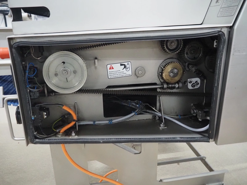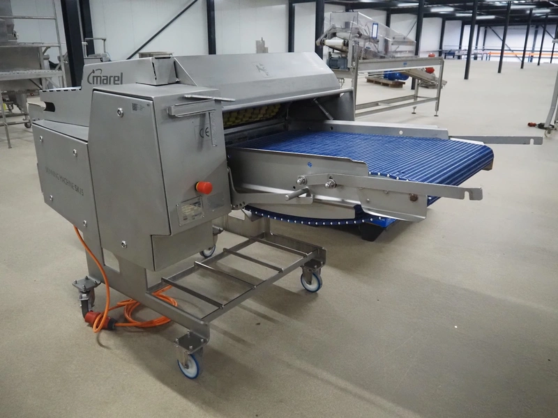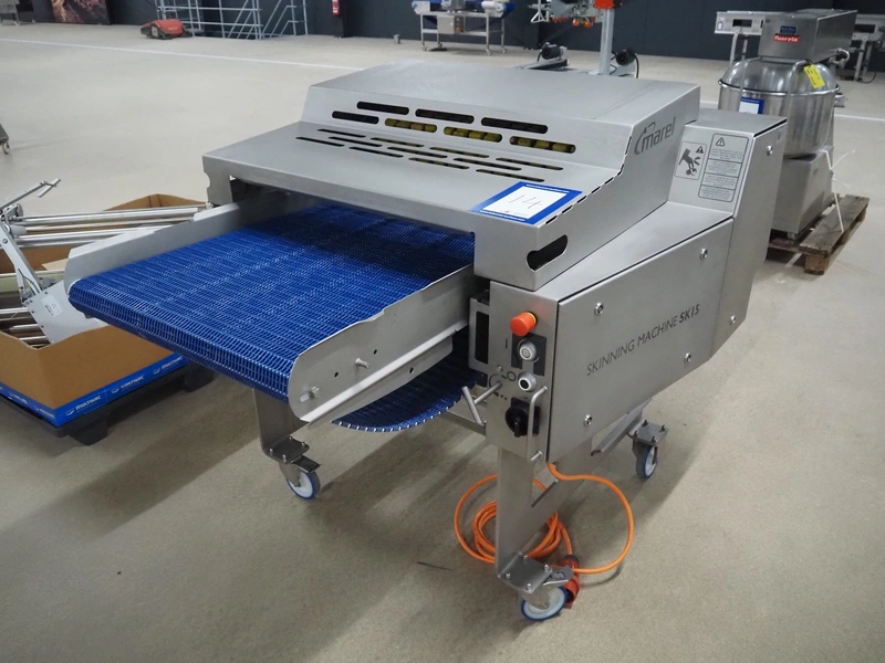 Marel mobile skinning and derinding machine, model: SK 15-320 26 INCH, type: 9838645, serial number: 10421952, year of construction: 2019, 400 V, 3 Ph, 50 Hz, 3.5 A, weight: 447 kg, working width: 640 mm, plastic mesh belt, belt width: 650 mm, total dimensions: 2350 mm x 1150 mm x 1250 mm.