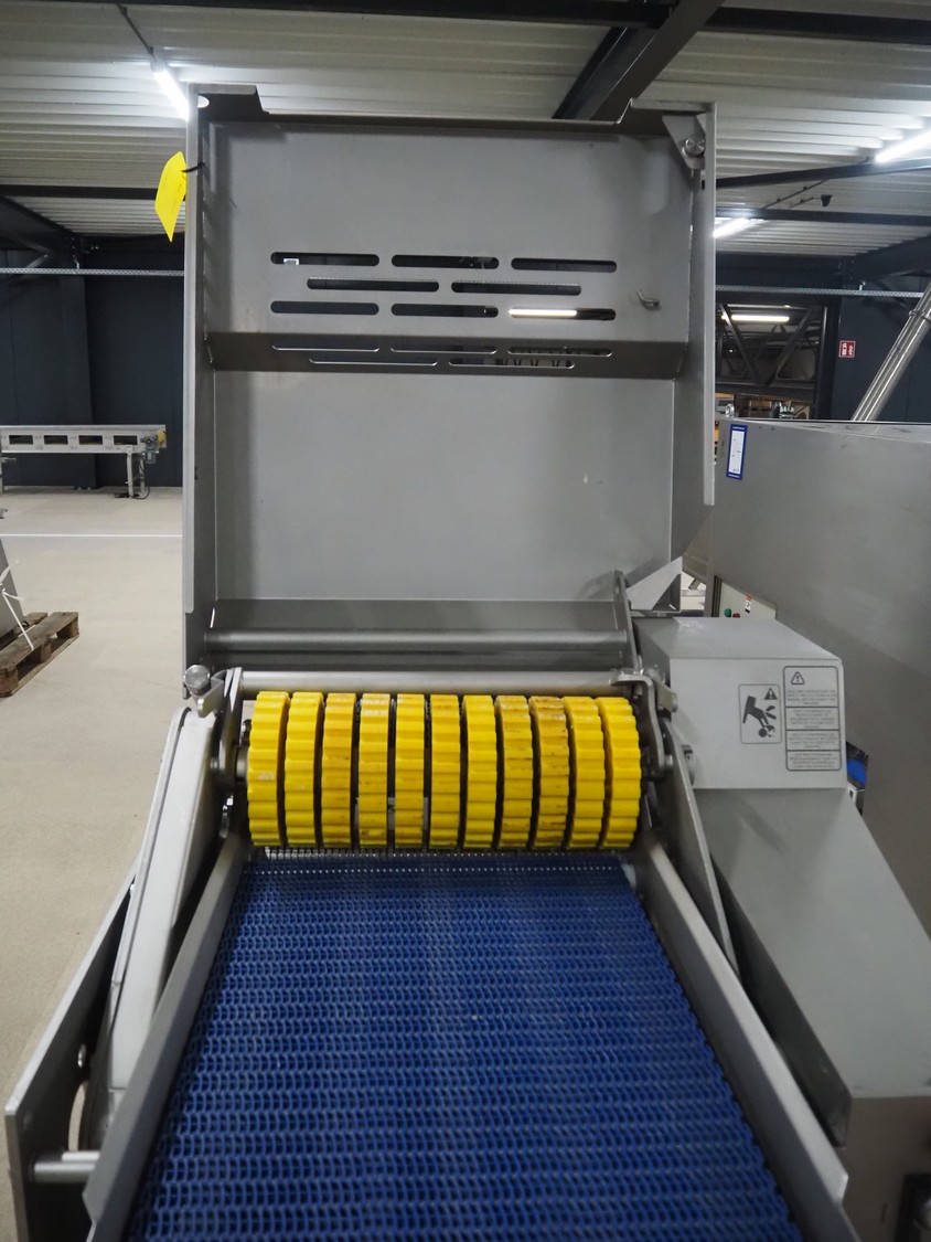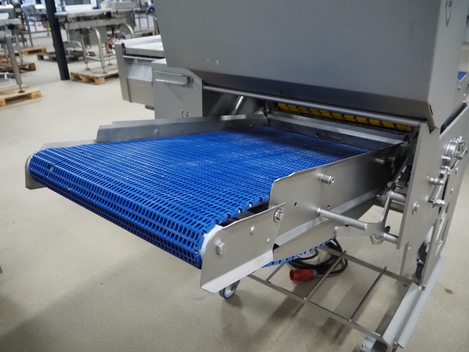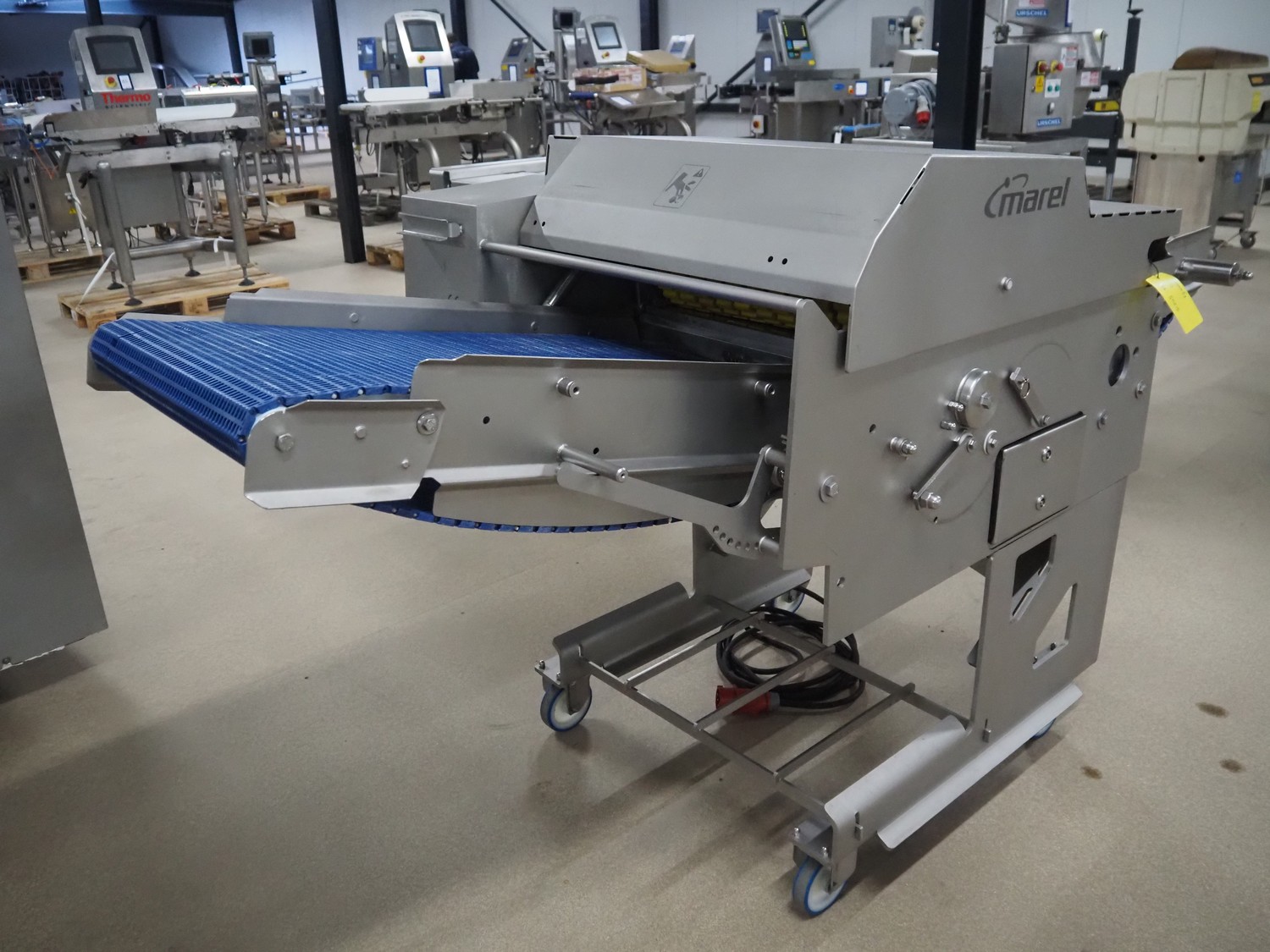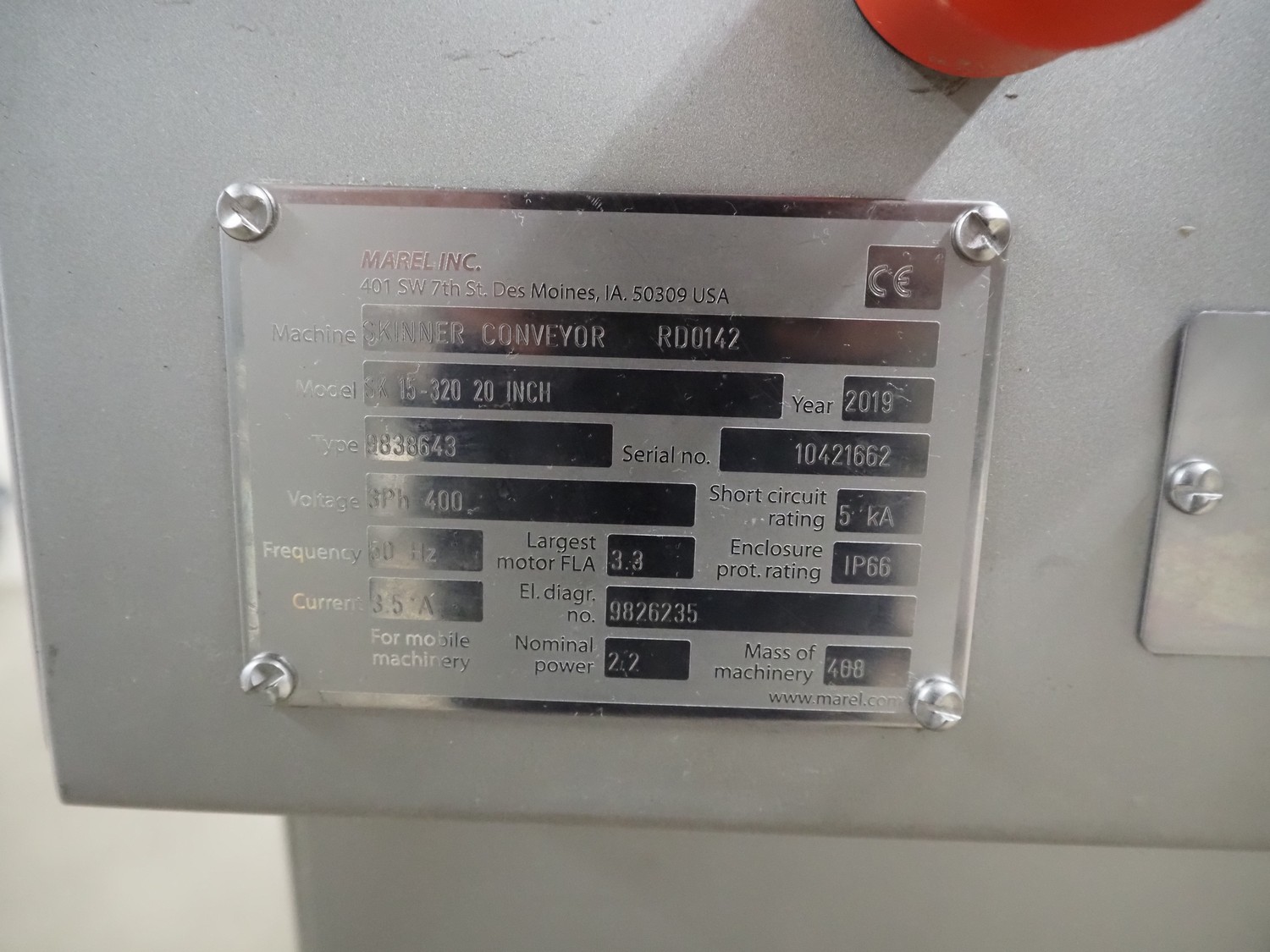 Marel mobile skinning and derinding machine, model: SK 15-320 20 INCH, type: 9838643, serial number: 10421662, year of construction: 2019, 400 V, 3 Ph, 50 Hz, 3.5 A, weight: 408 kg, working width: 500 mm, plastic mesh belt, belt width: 500 mm, total dimensions: 2200 mm x 1000 mm x 1300 mm.
