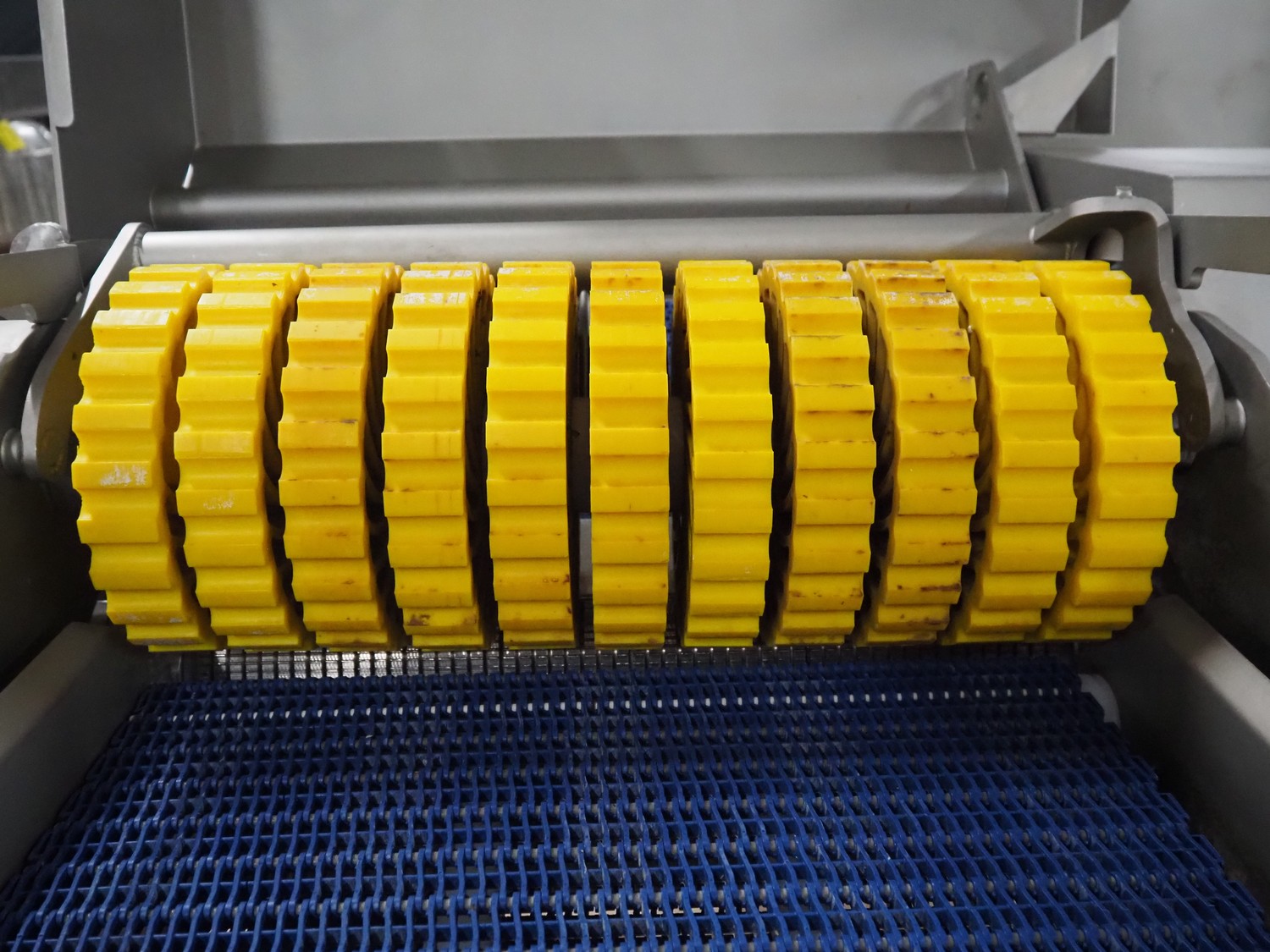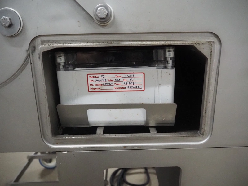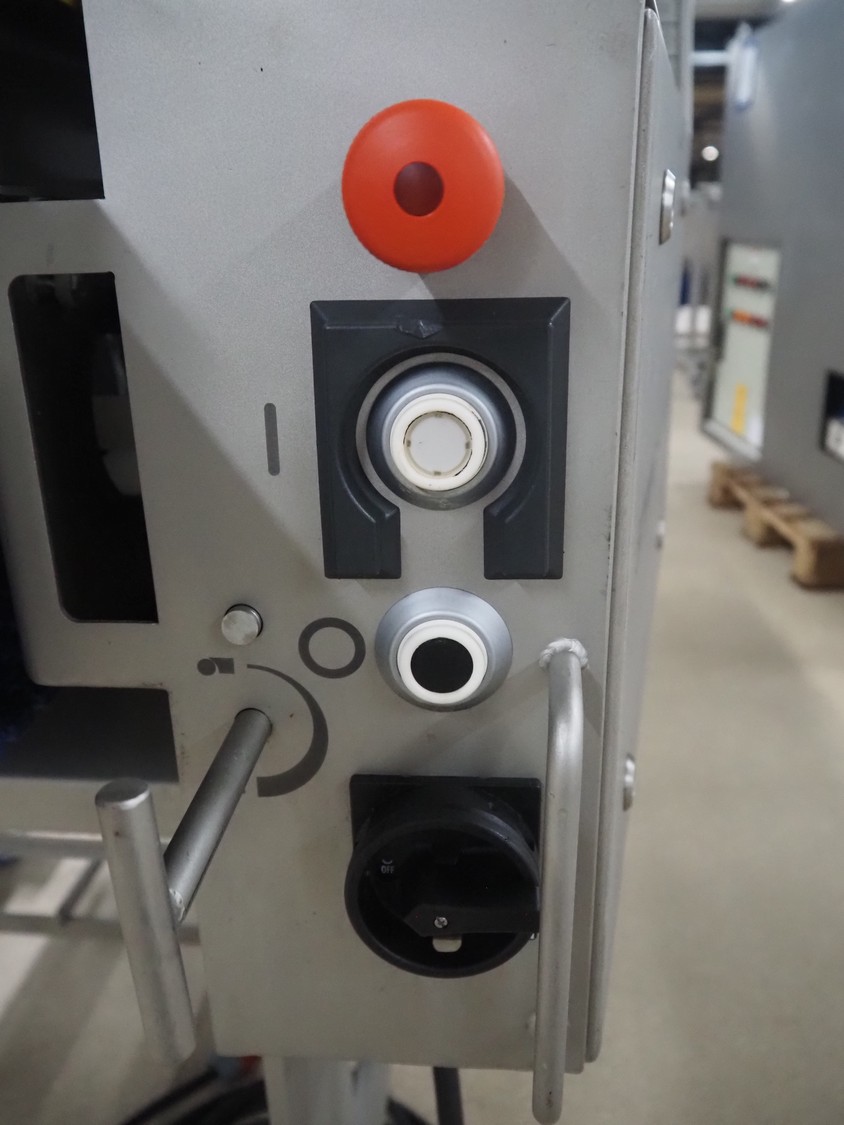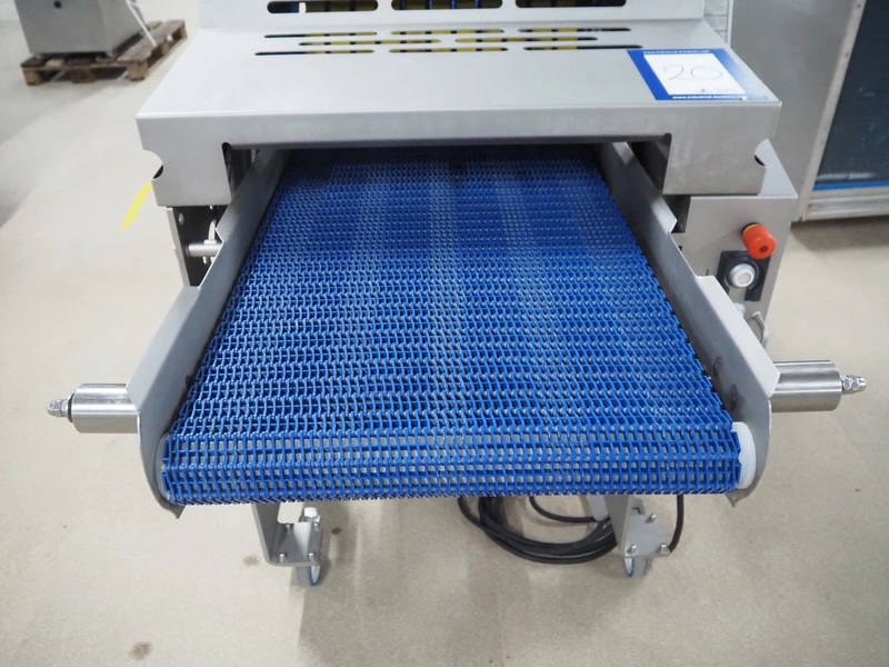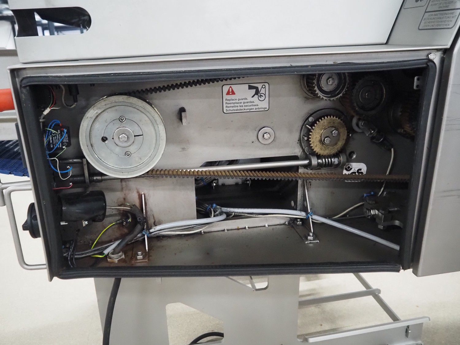 Marel mobile skinning and derinding machine, model: SK 15-320 20 INCH, type: 9838643, serial number: 10421662, year of construction: 2019, 400 V, 3 Ph, 50 Hz, 3.5 A, weight: 408 kg, working width: 500 mm, plastic mesh belt, belt width: 500 mm, total dimensions: 2200 mm x 1000 mm x 1300 mm.