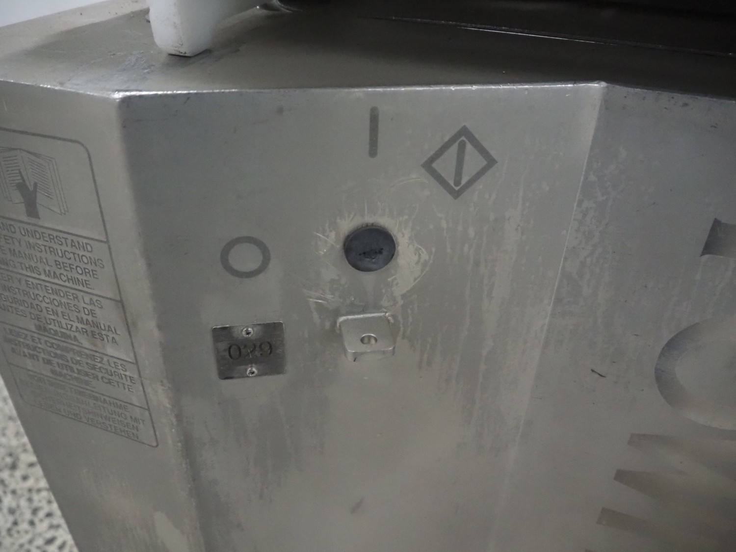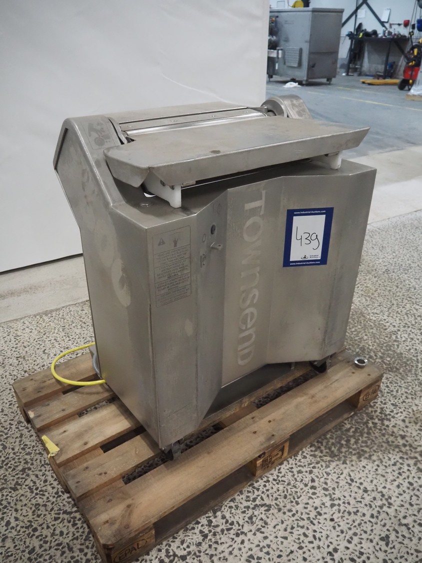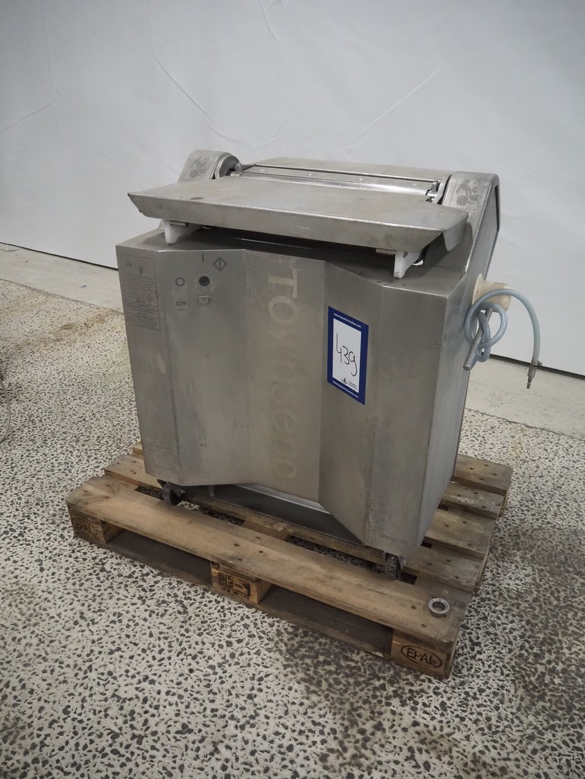 Townsend mobile skinning machine, model: 7620, serial number: 569, year of construction: 1995, 380 V, 3 Ph, 50 Hz, 2.0 A, working width: 210 mm, foot control, total dimensions: 260 mm x 950 mm x 1000 mm.
