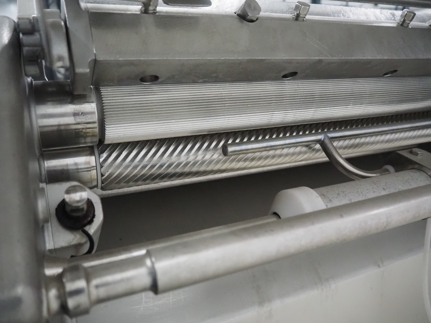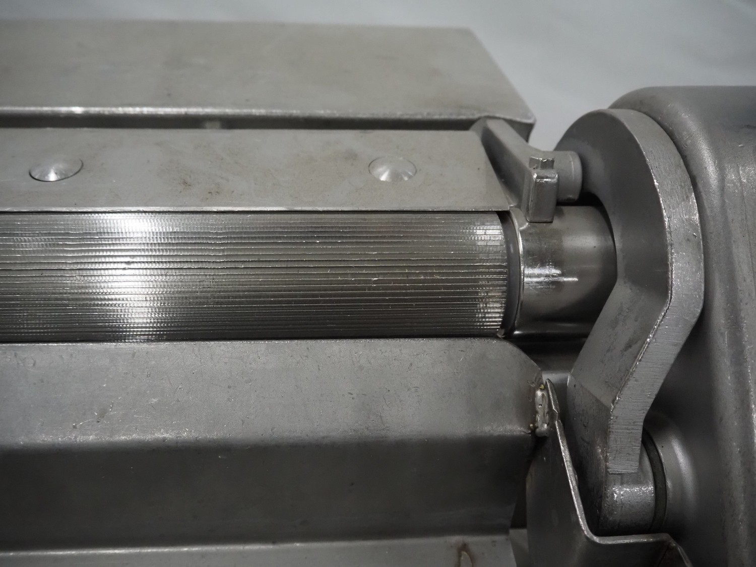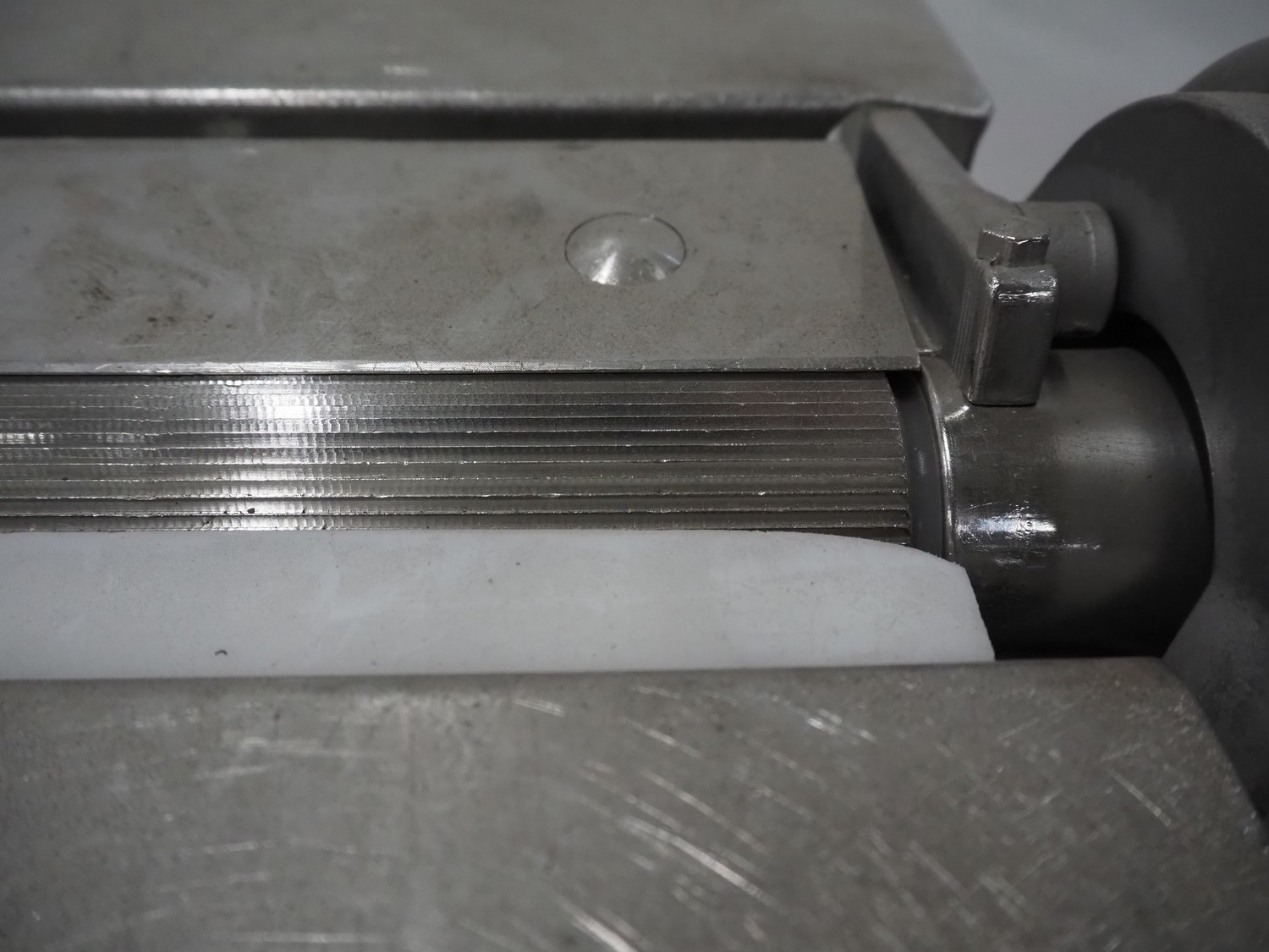 Townsend mobile skinning machine, model: 7620, serial number: 569, year of construction: 1995, 380 V, 3 Ph, 50 Hz, 2.0 A, working width: 210 mm, foot control, total dimensions: 260 mm x 950 mm x 1000 mm.