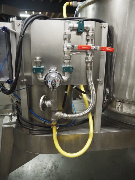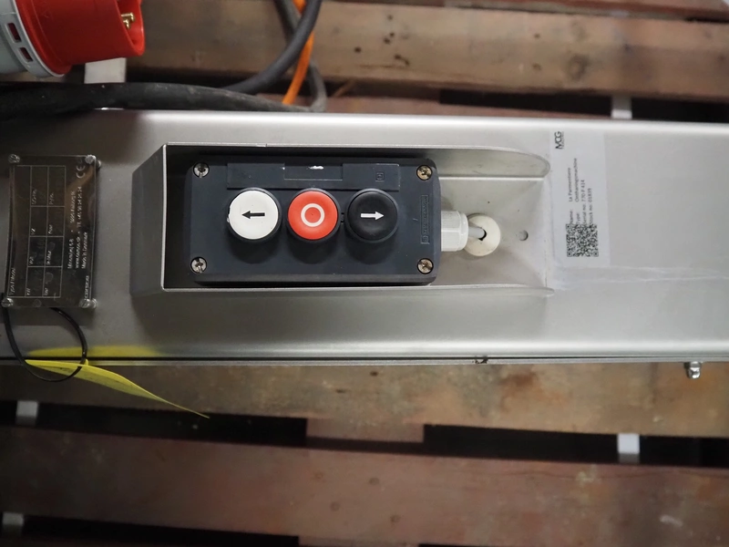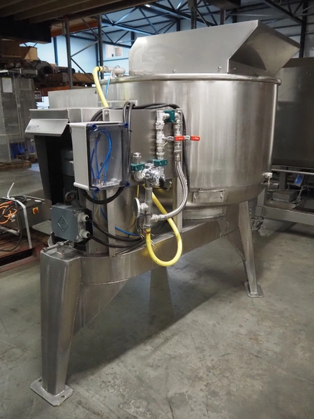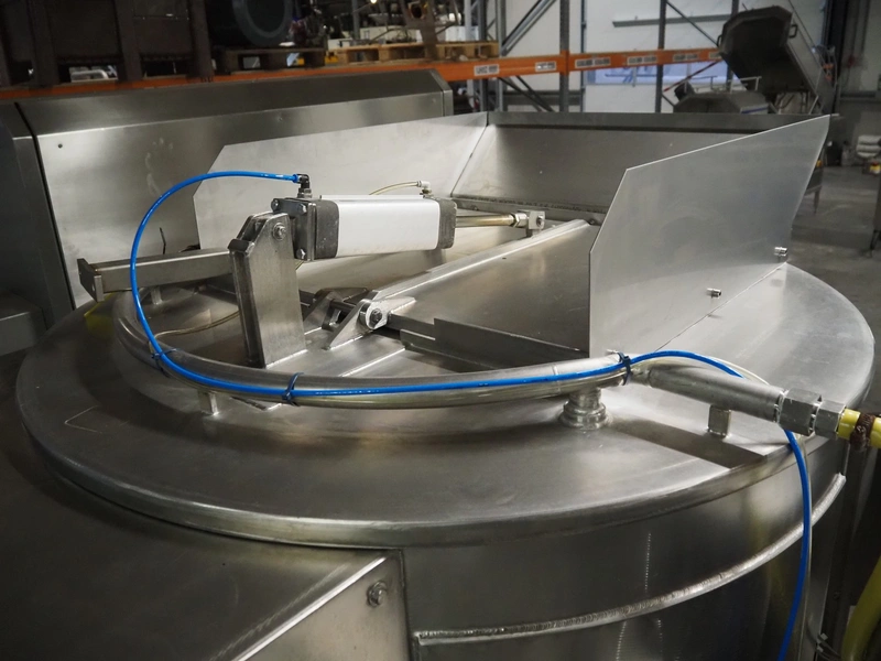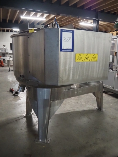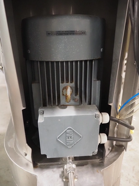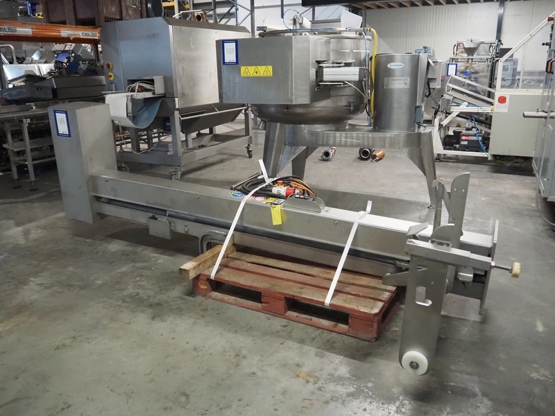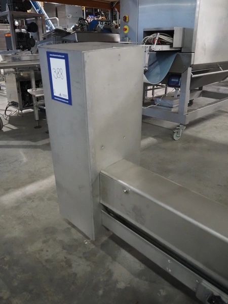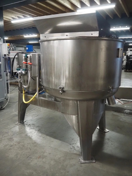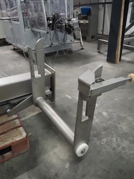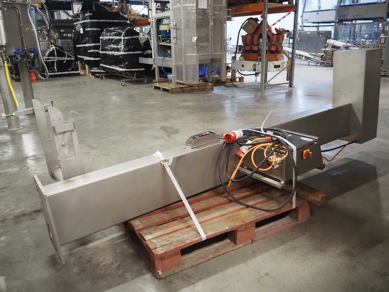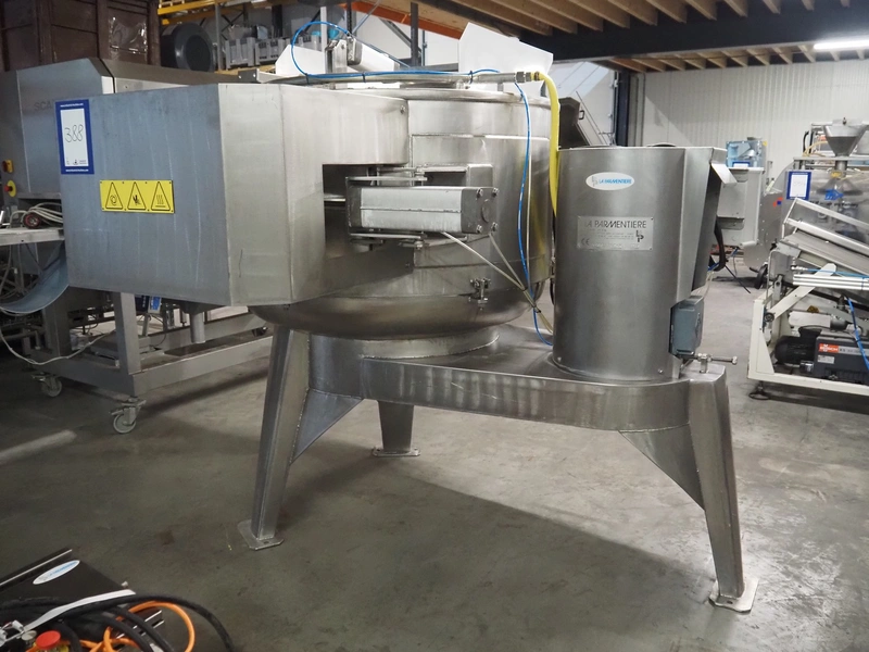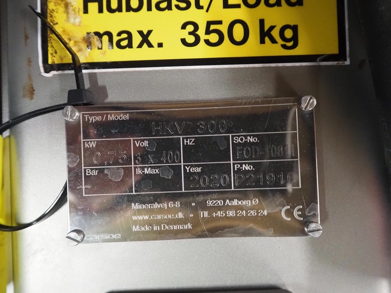La Parmentiere dehairing machine with Carsoe lifter for meat bins, type: 770P, machine number: 770P414, year of construction: 06.2020, type lifter: HKV 300, serial number: FOD-10811, year of construction: 2020, 400 V, 3 Ph, 0.75 kW, dimensions: 2050 mm x 1800 mm x 1870 mm, dimensions lifter: 3150 mm x 1500 mm x 900 mm.