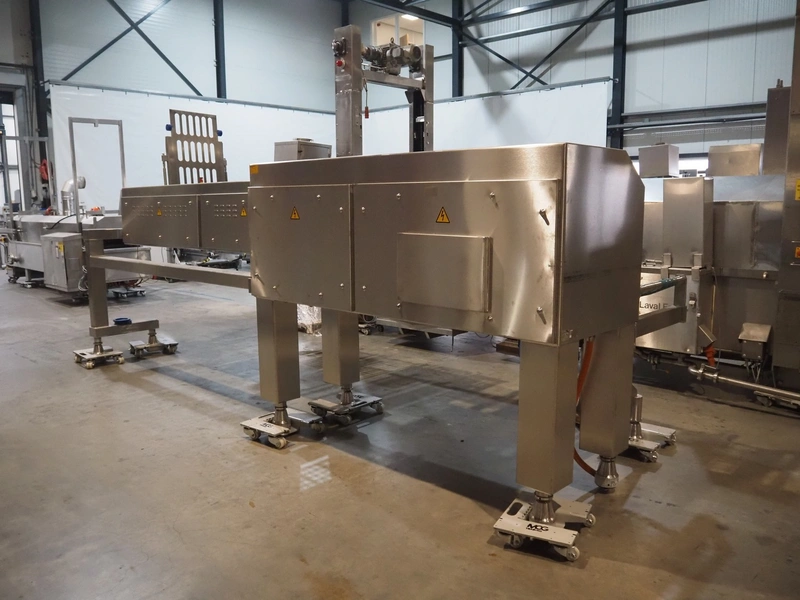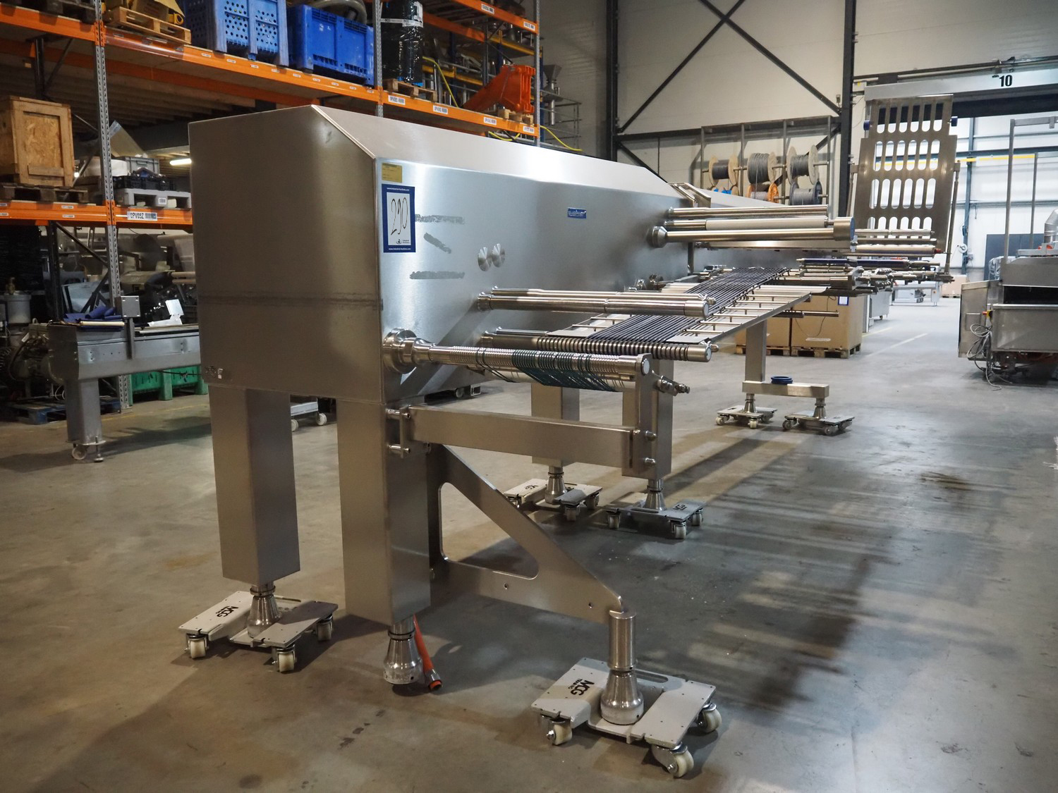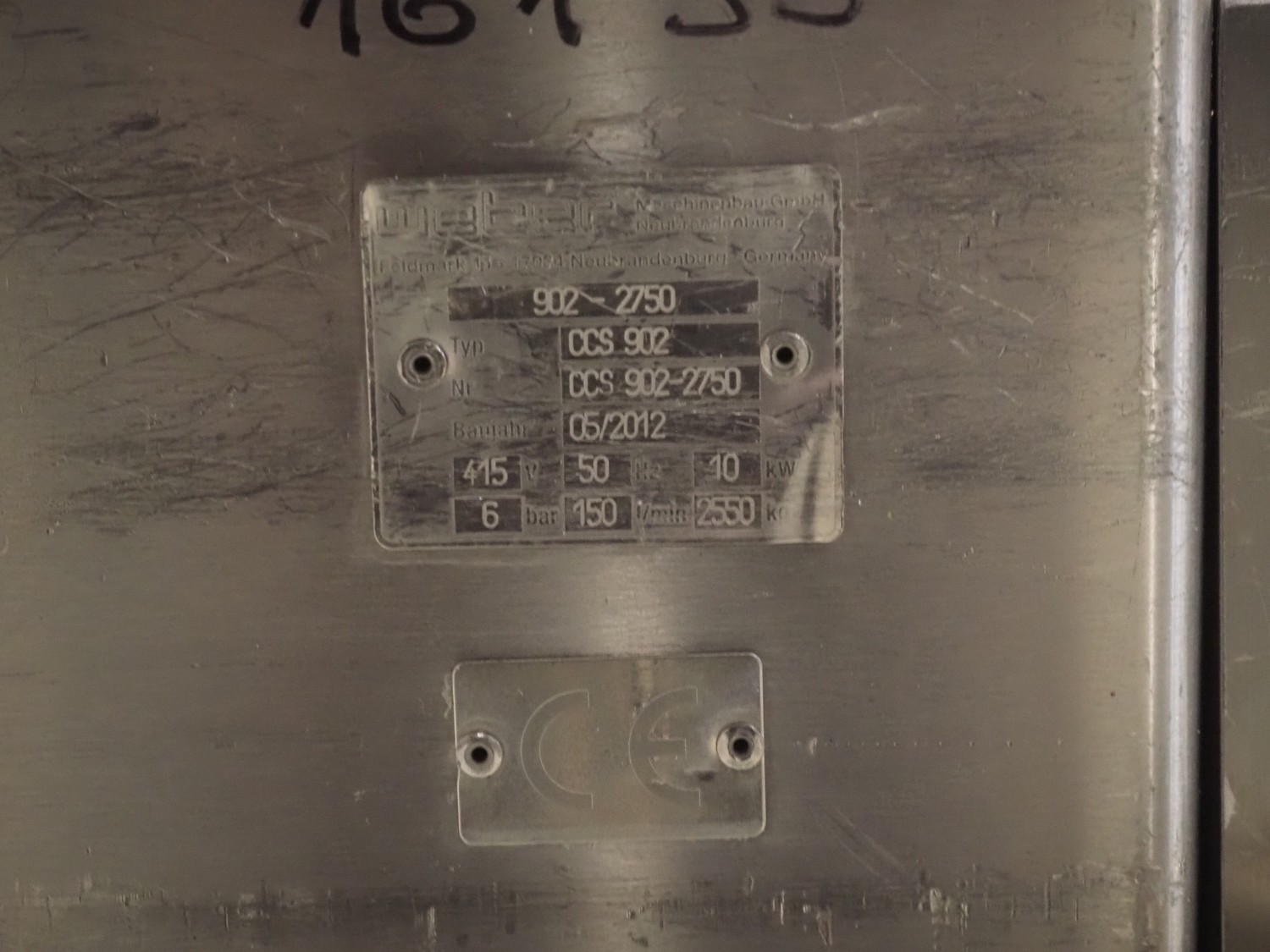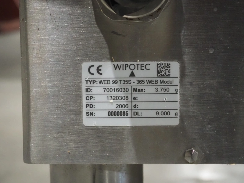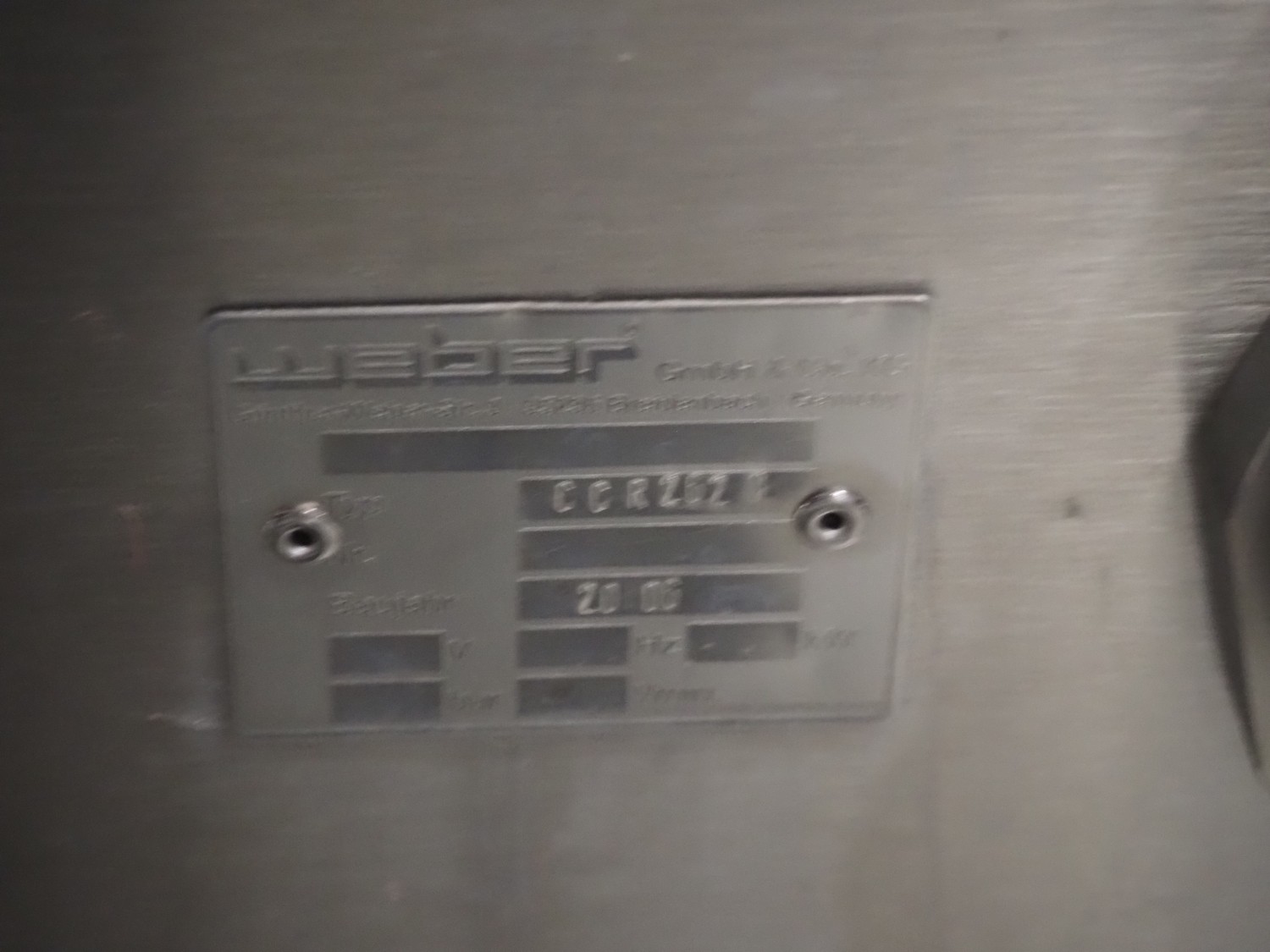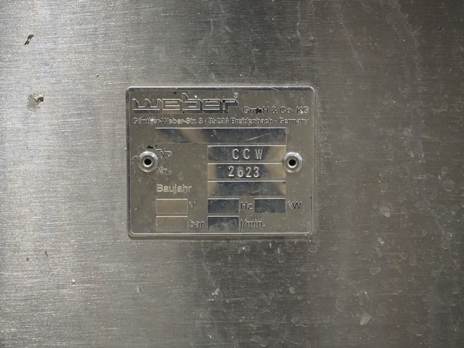 Weber slicer with checkweigher, rejecting belt and outfeed belt, type slicer: CCS 902, number: CCS 902-2750, year of construction: 05/2012, 415 V, 50 Hz, 10 kW, plastic infeed belt, belt width: 340 mm, plastic outfeed belt, belt width: 420 mm, total dimensions: 3100 mm x 1850 mm x 2600 mm. Wipotec checkweigher type: WEB 99 T35S, plastic wire belt, belt width: 360 mm, total dimensions: 500 mm x 900 mm x 1100 mm. Type weber rejecting belt: CCW, number: 2623, plastic wire belt, belt width: 360 mm, total dimensions: 500 mm x 900 mm x 1100 mm. Weber outfeed belt, type: CCA, number: 2622, year of construction: 2006, 400 V, 50 Hz, 7 kW, plastic wired belt, belt width: 520 mm, total dimensions: 5370 mm x 1800 mm x 1800 mm. Without rollies.