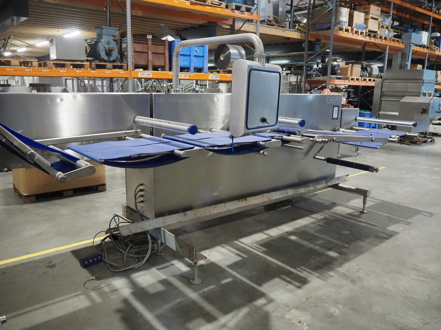 Outfeed belt for GEA slicer, type: Shingle Loader 600, serial number: 4040860453, year of construction: 2015, 400 V, 3 Ph, 15.0 A, plastic belts, belt width: (2x) 250 mm, (3x) 120 mm, (2x) 300 mm and (1x) 380 mm, plastic string conveyor, belt width: 360 mm, total dimensions: 5400 mm x 1700 mm x 2050 mm.