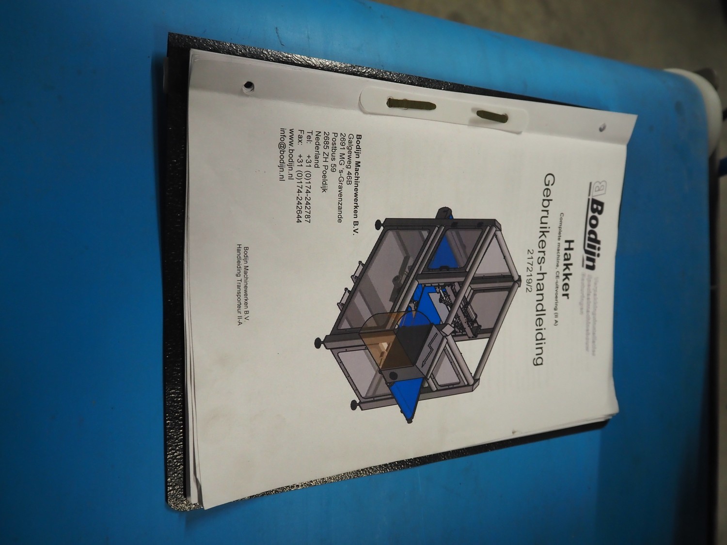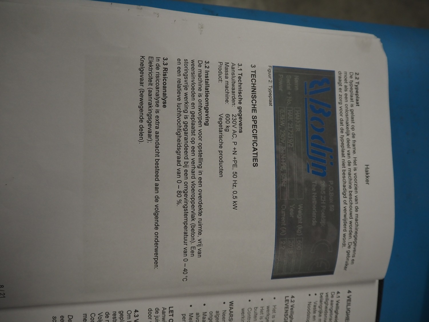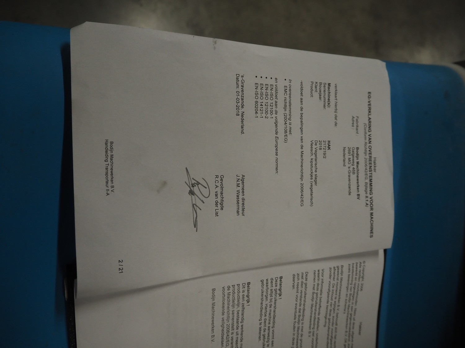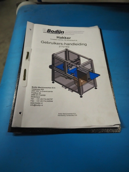 Bodijn slicer used for meat, serial number: HAK 217219/2, year of construction: 2018, 230 V, 50 Hz, 2.2 A, 0.5 kW, weight: 600 kg, belt width: 545 mm, working width: 500 mm, total dimensions: 2700 mm x 1200 mm x 2100 mm.