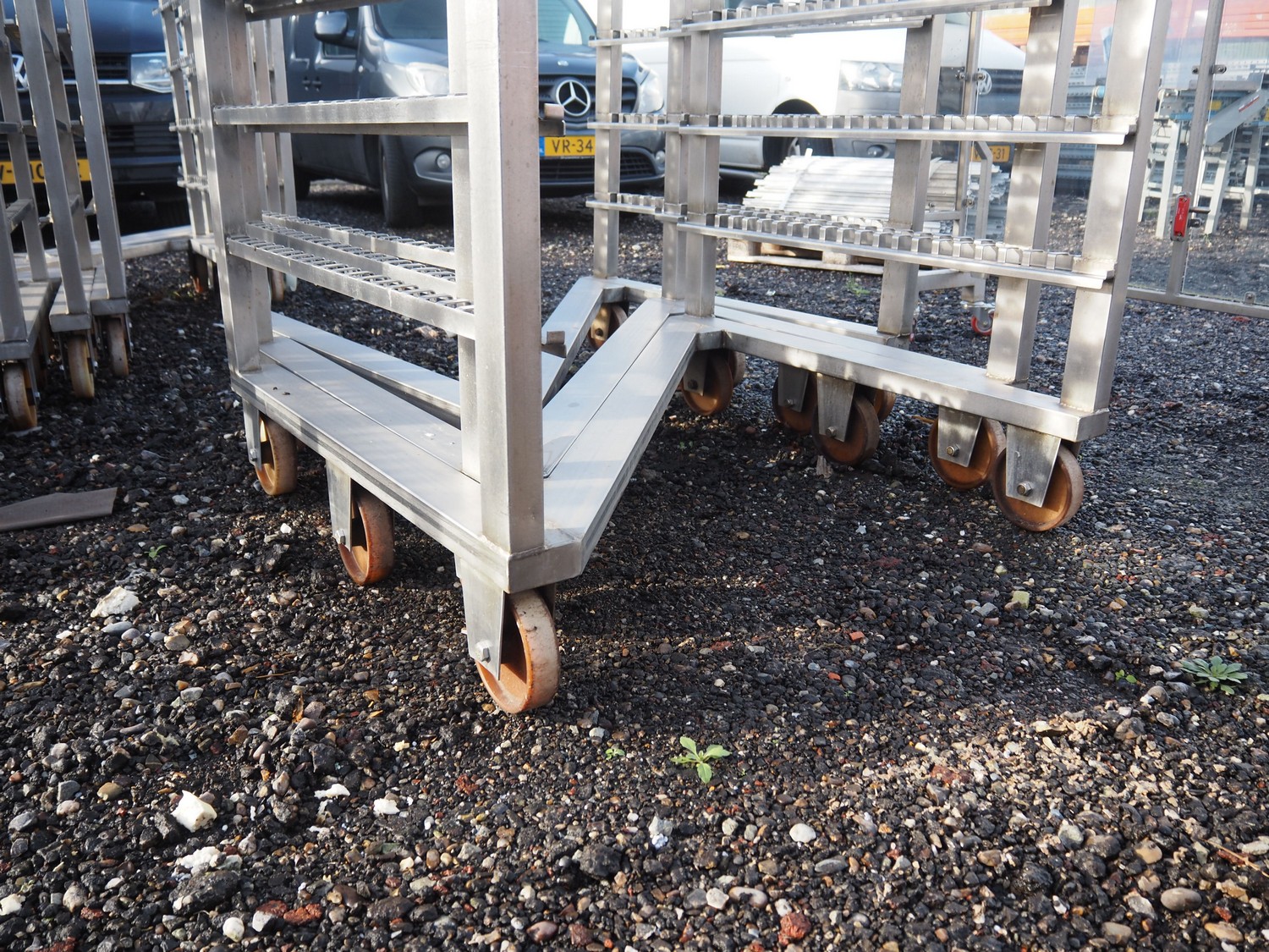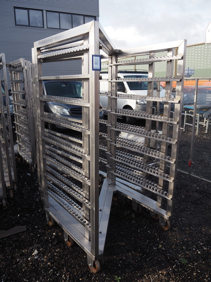 3 s/s Z-shaped smoke trolleys, 8 floors, dimensions each floor: 1000 mm x 900 mm, total dimensions: (3x) 1080 mm x 1040 mm x 2000 mm.