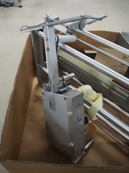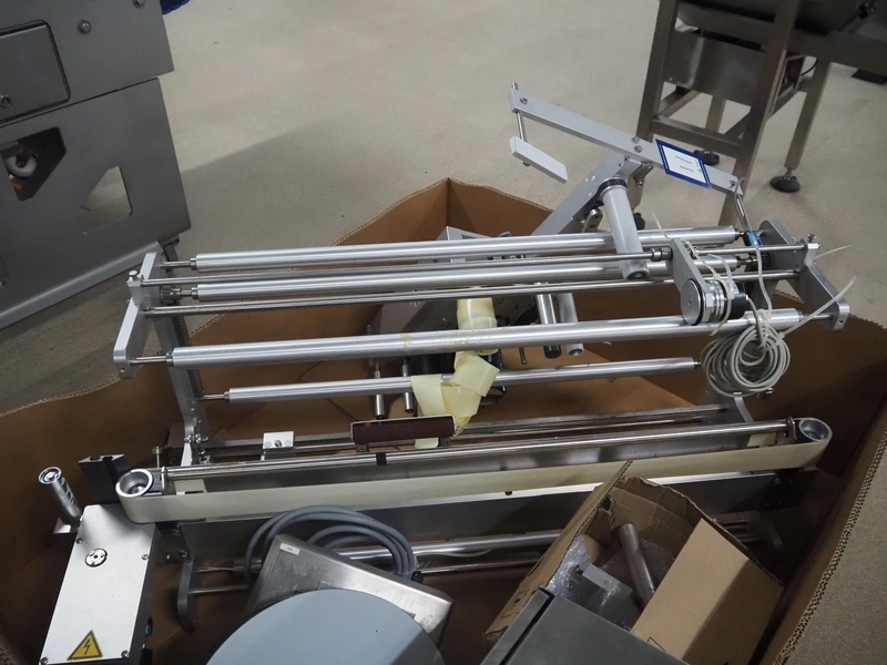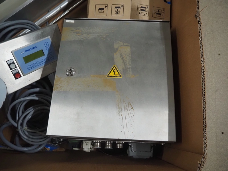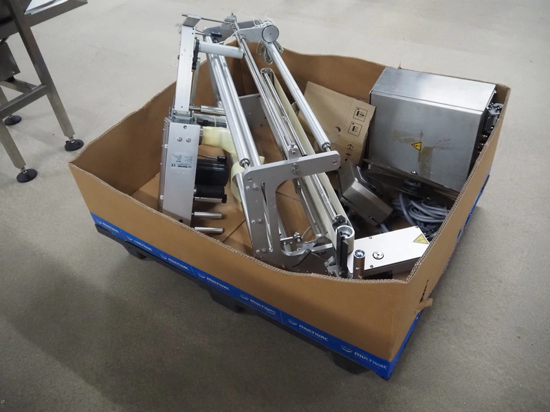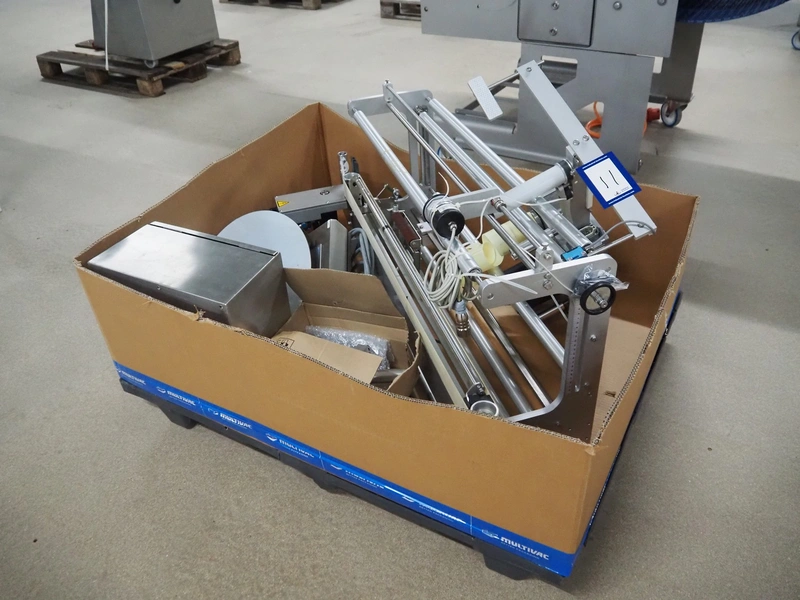 Pallet with Multivac labelling parts for thermoformer, type: MR233 & MR 4212, dimensions: 1200 mm x 1000 mm x 500 mm.