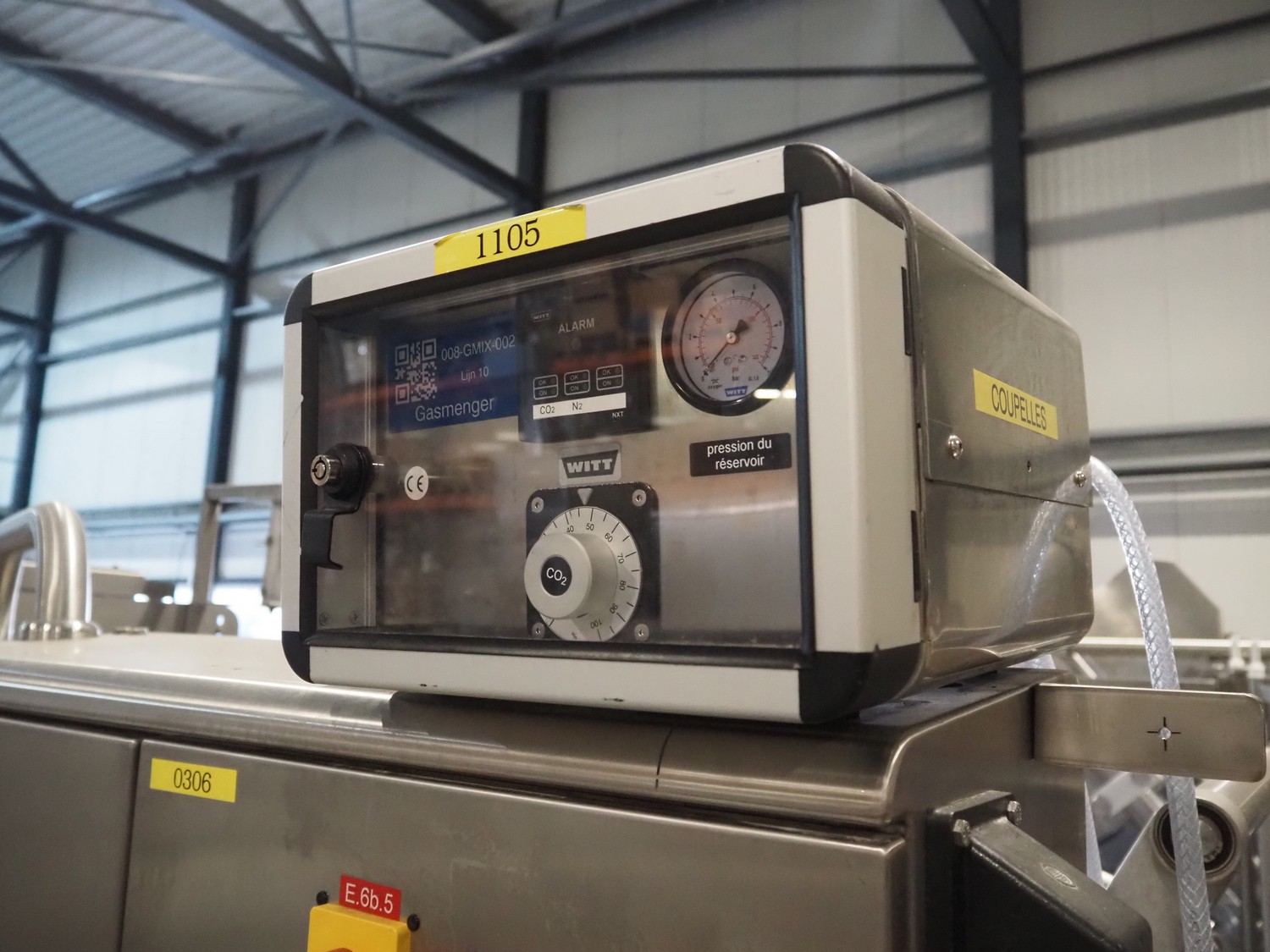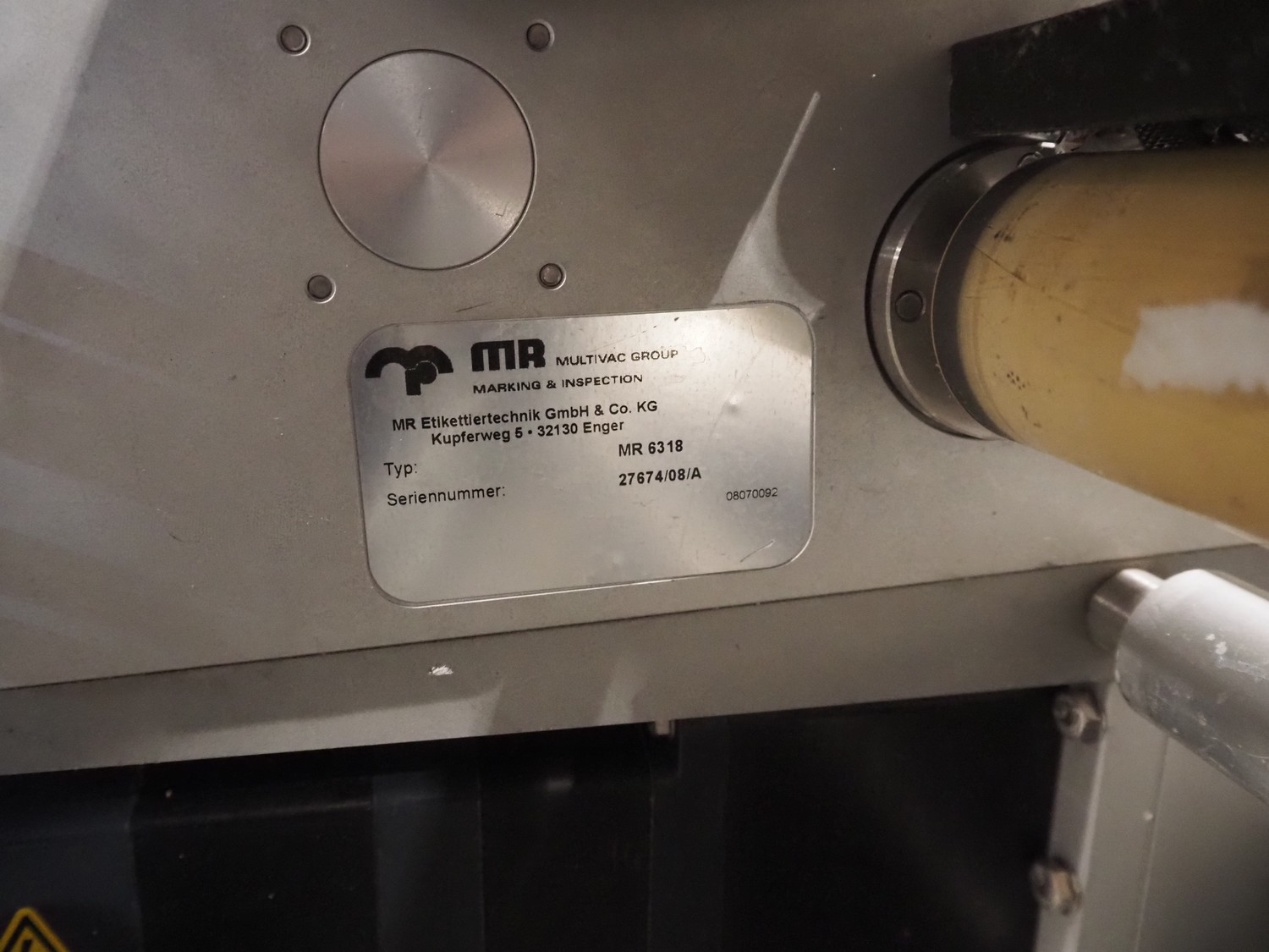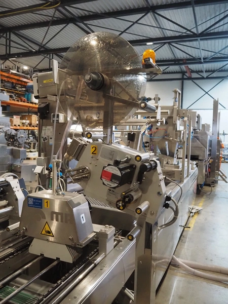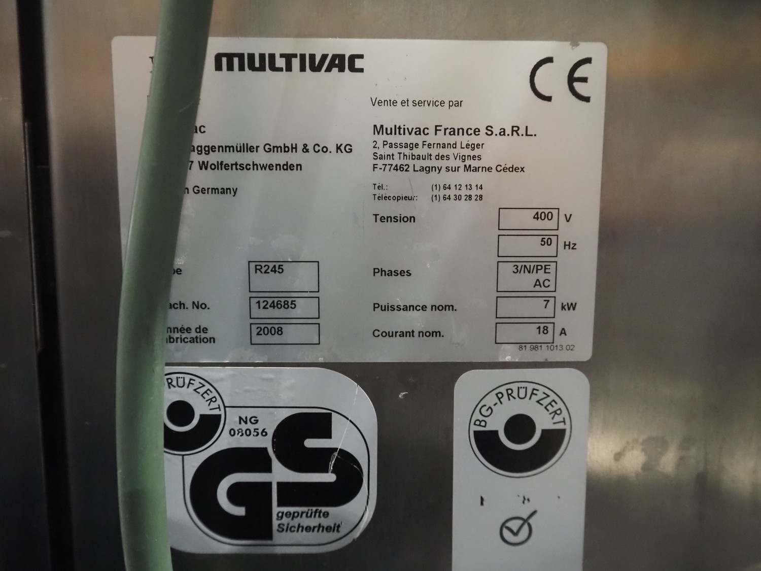 Multivac thermoformer with MR Etikettiertechnik GmbH labelling unit, model: R245, machine number: 124685, year of construction: 2008, 400 V, 3 Ph, 50 Hz, 18 A, 7 kW, type labelling unit: MR 6318, type Witt-Gasetechnik gas mixing station: KM 100-2 MEM, dye: (6x) 103 mm x 90 mm, total dimensions: 8300 mm x 1600 mm x 2250 mm. Including Multivac inliner, belt width: (3x) 70 mm, (1x) 315 mm, total dimensions: 2050 mm x 600 mm x 1050 mm, and pallet with parts, dimensions: 1200 mm x 800 mm x 500 mm. Without rollies.