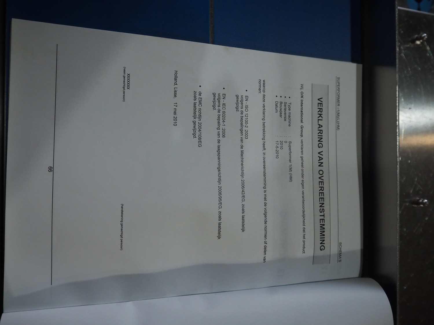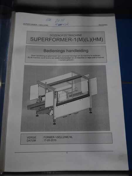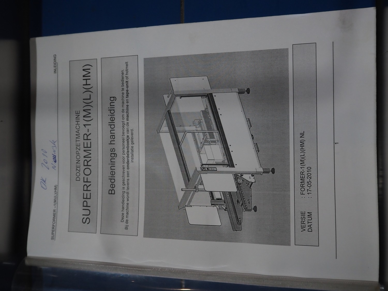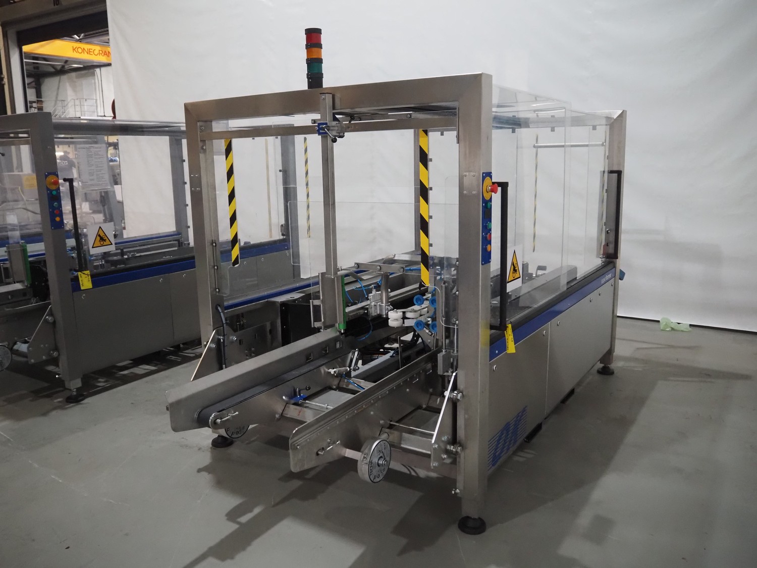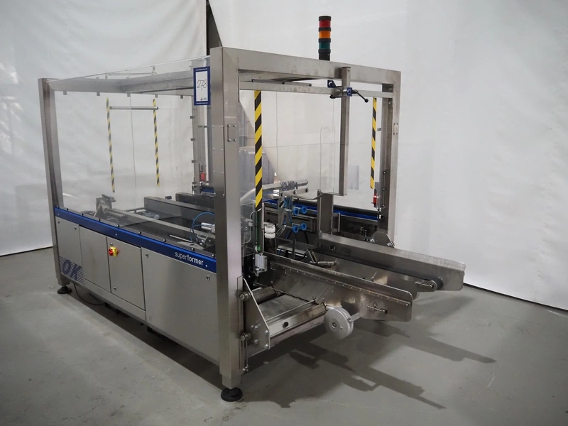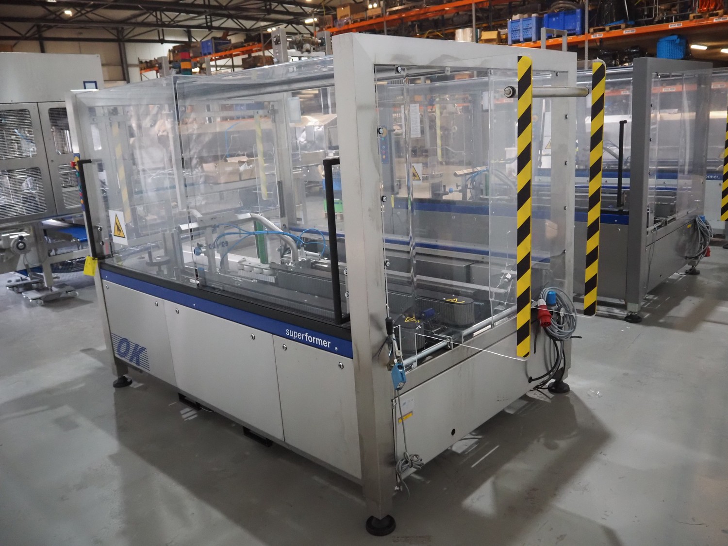 O/K Packaging Systems bv case erector, type: Superformer-1, serial number: 16-22018, year of construction: 2016, 400 V, 3 Ph, 50 Hz, 10 A, weight: 1200 kg, plastic belts, belt width: (2x) 95 mm, total dimensions: 3750 mm x 1700 mm x 2130 mm.