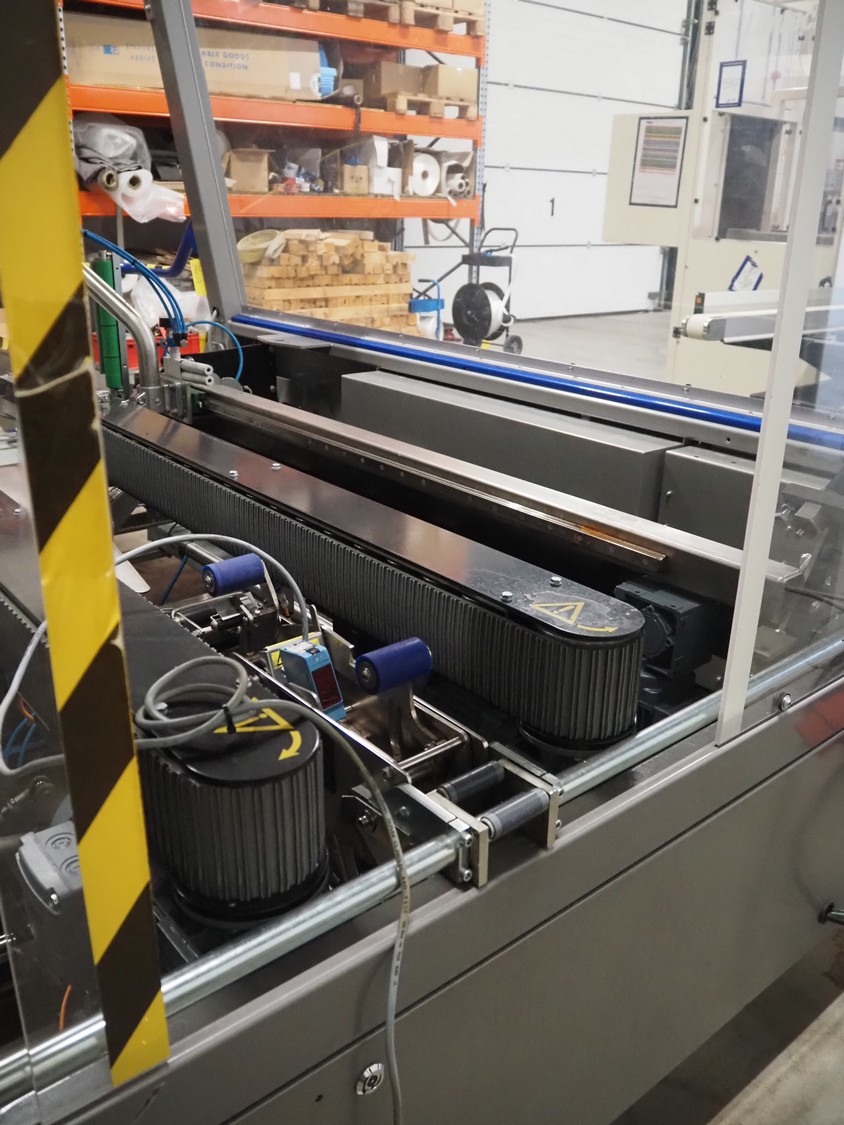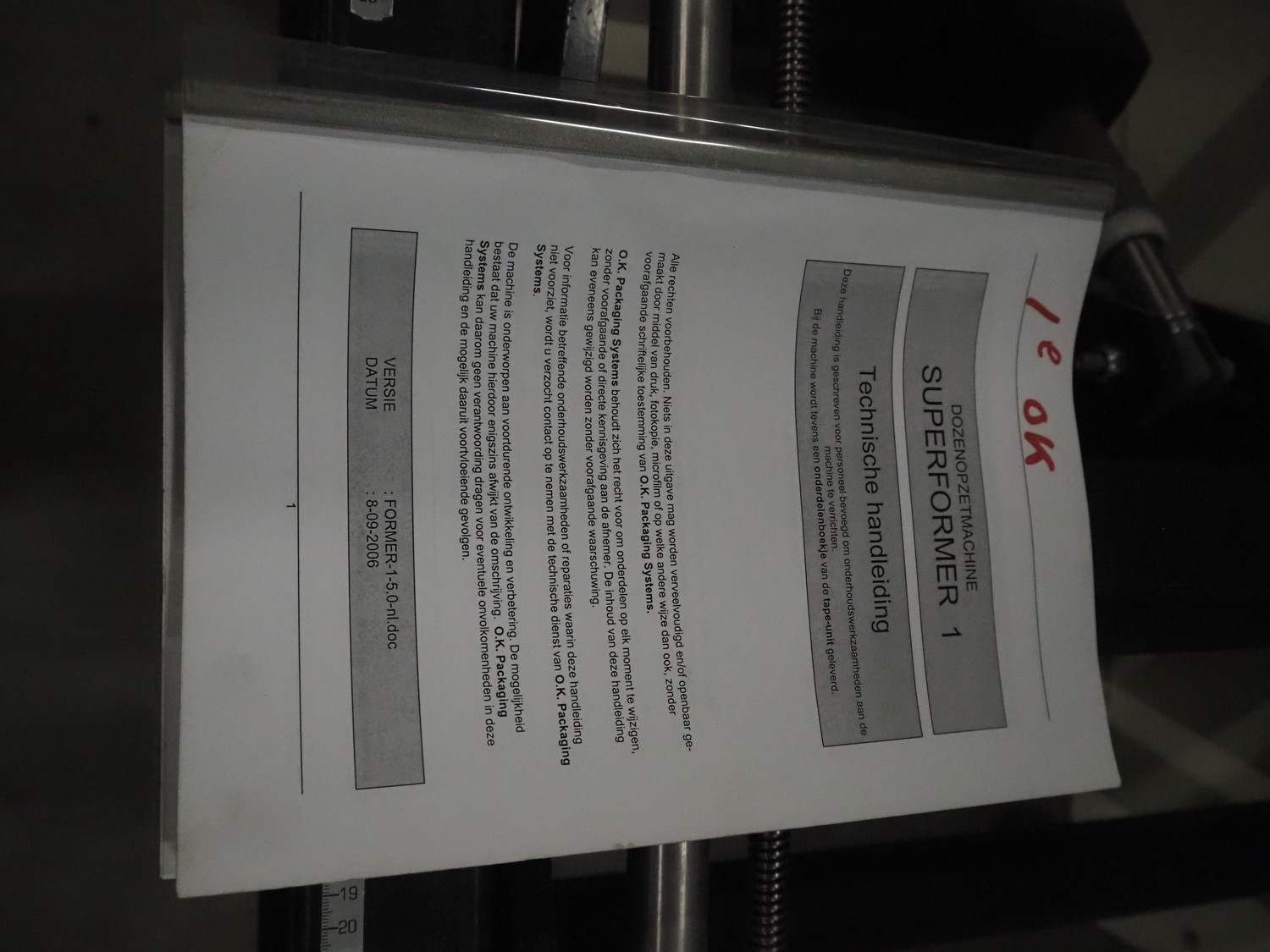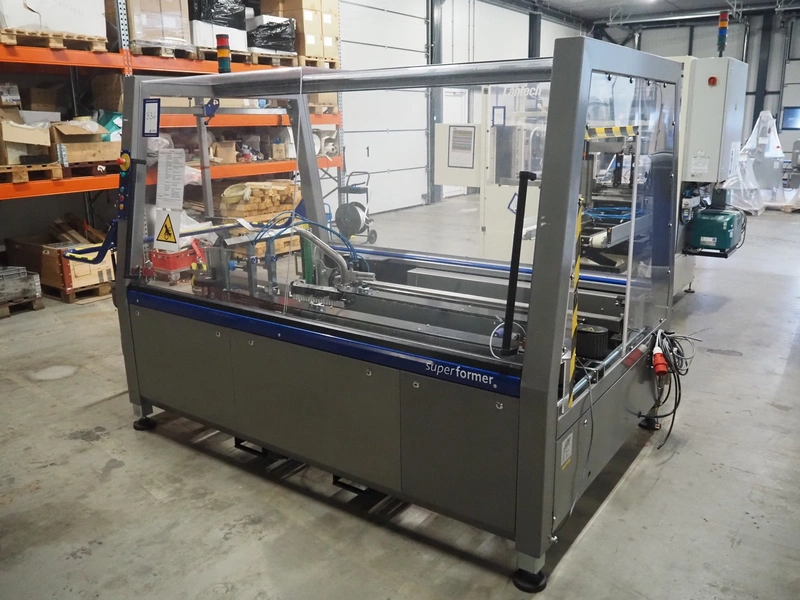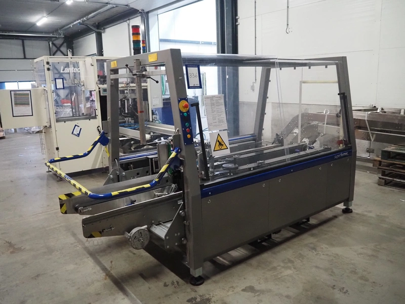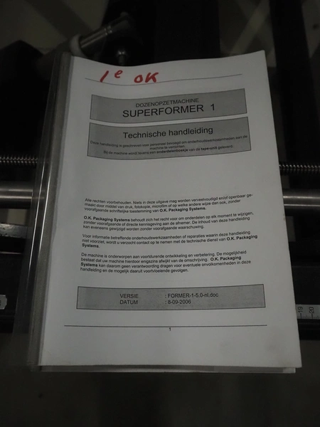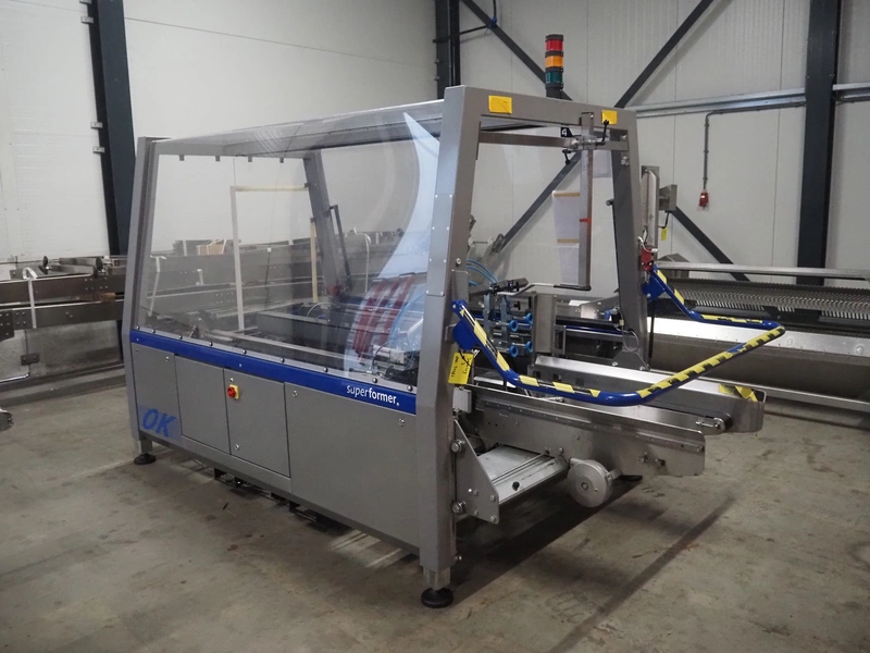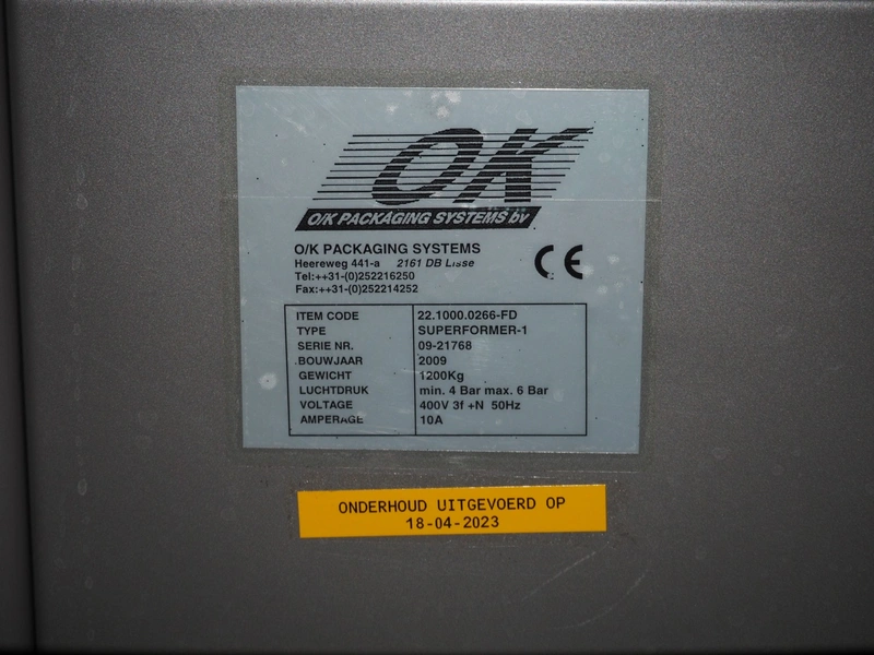 O/K Packaging Systems bv case erector, type: Superformer-1, serial number: 09-21768, year of construction: 2009, 400 V, 3 Ph, 50 Hz, 10 A, weight: 1200 kg, maximum box width: 350 mm, plastic belts, belt width: (2x) 95 mm, total dimensions: 3250 mm x 1700 mm x 2130 mm.