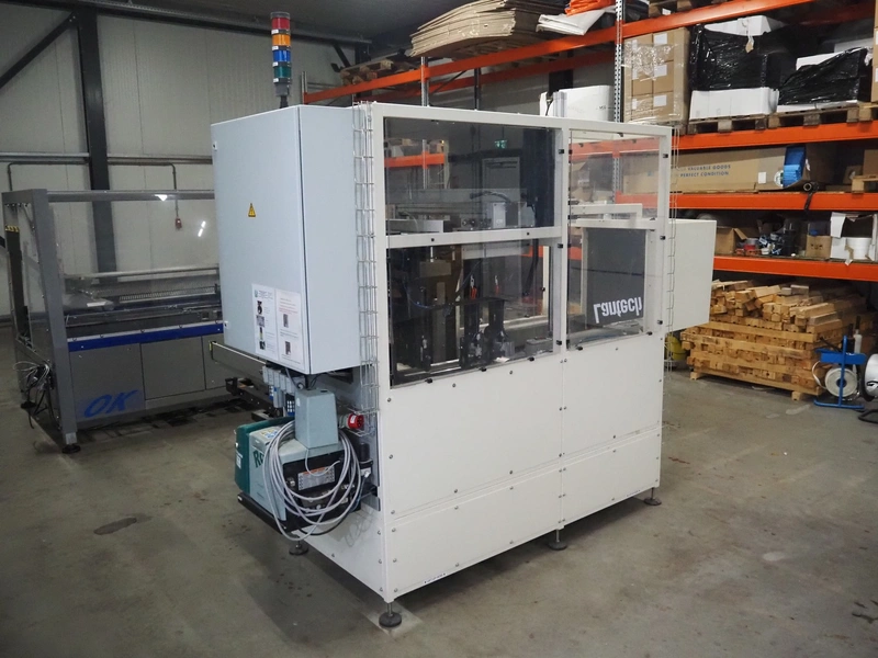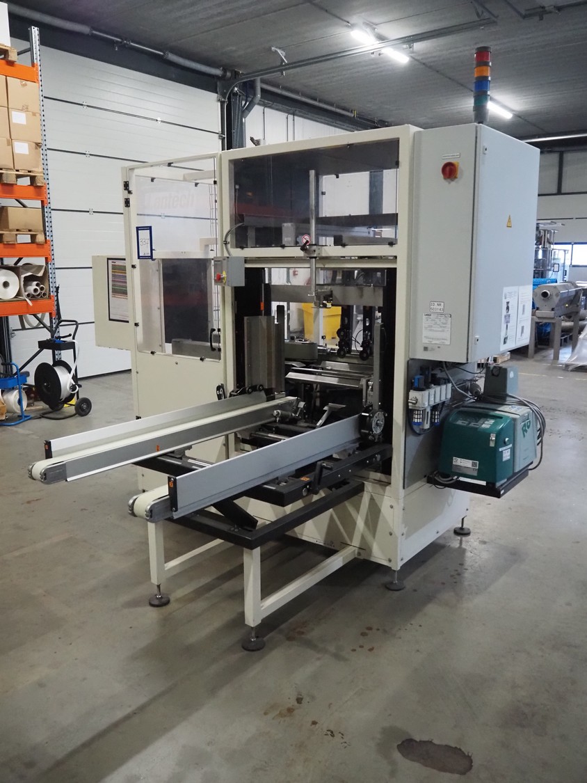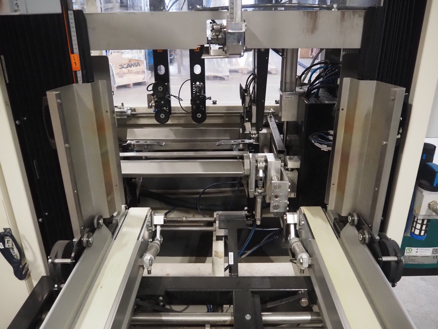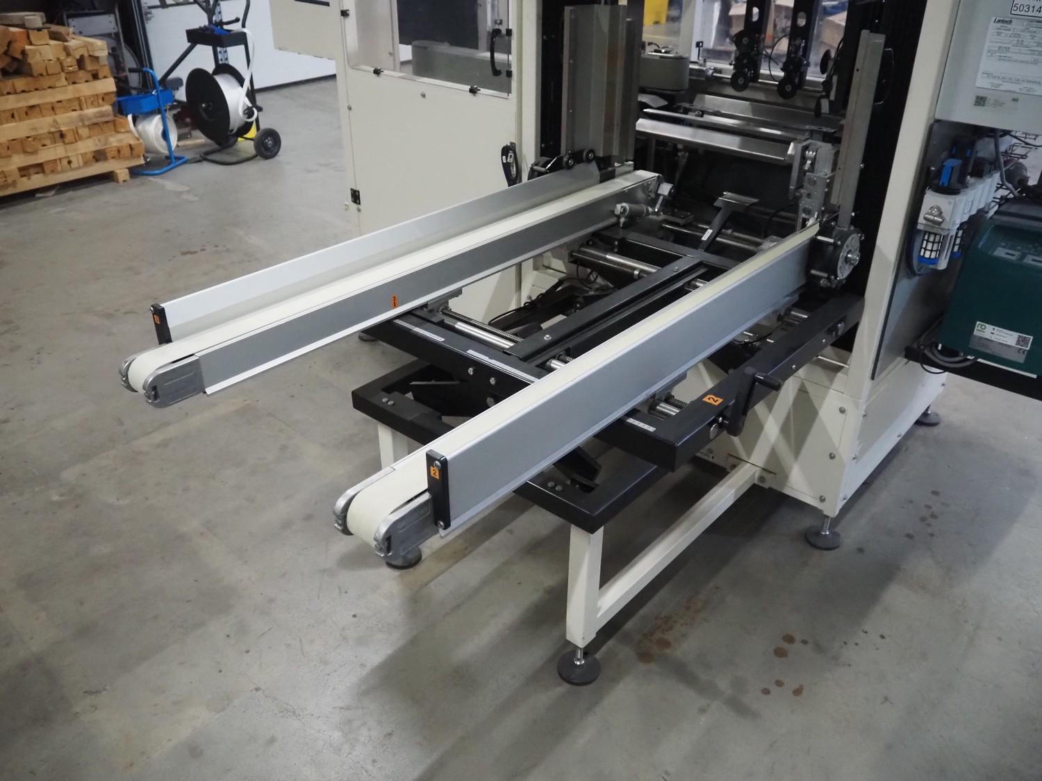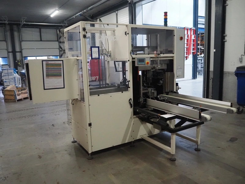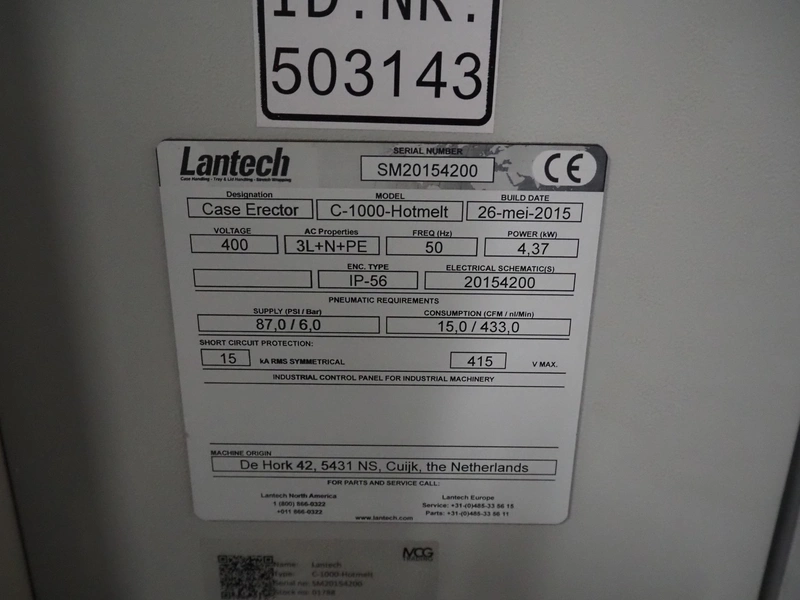Lantech case erector, model: C-1000-Hotmelt, serial number: SM20154200, year of construction: 26 may 2015, 400 V, 3 Ph,50 Hz, 4.37 kW, air supply: 87.0 PSI / 6.0 Bar, Robatech glue unit, type: Concept C 5/2, plastic infeed belts, belt width: (2x) 65 mm, total dimensions: 3000 mm x 2300 mm x 2650 mm.