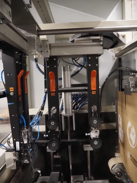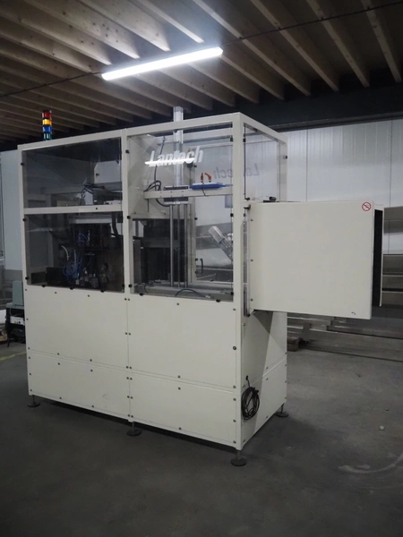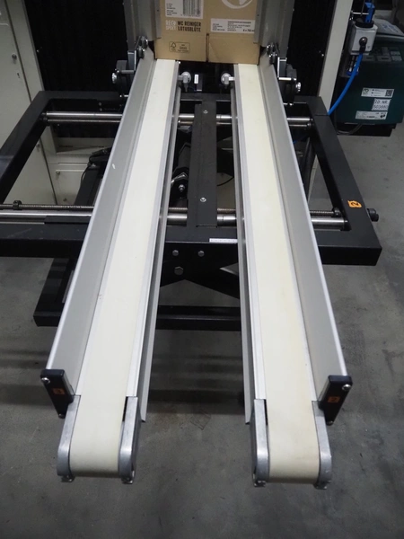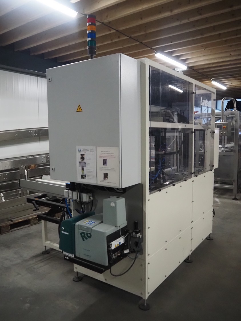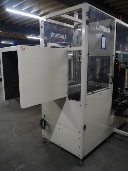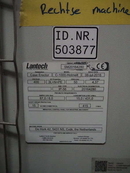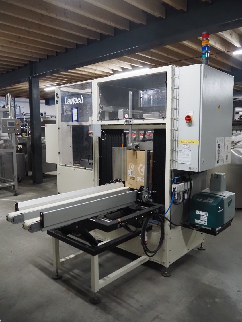 Lantech carton erecter, model C-1000-Hotmelt, serial number: SM20164280, year of construction: 06-jul-2016, 400 V, 3 Ph, 50 Hz, 4.37 kW, Robatech glue unit, type: Concept C 5/2, serial number: 11111103-001, year of construction: 2016, plastic belts, belt width: 65 mm, dimensions plano: 680 mm x 450 mm, total dimensions: 2400 mm x 2300 mm x 2600 mm.