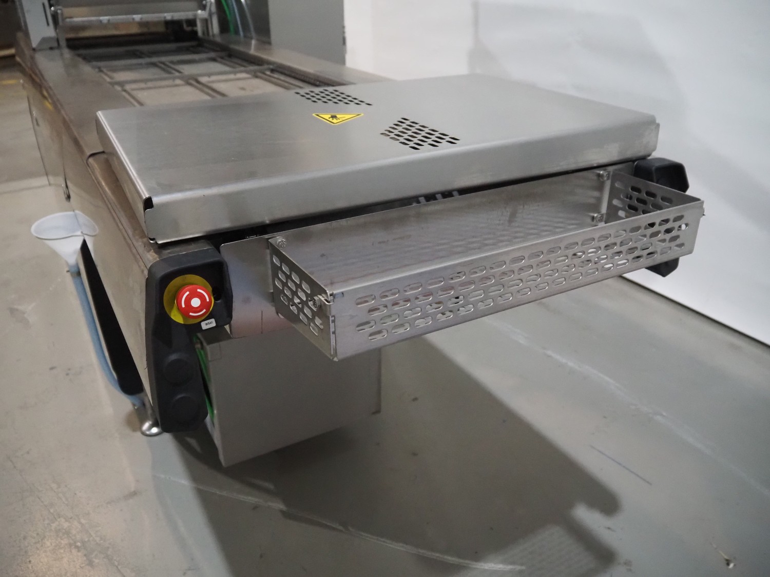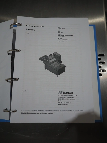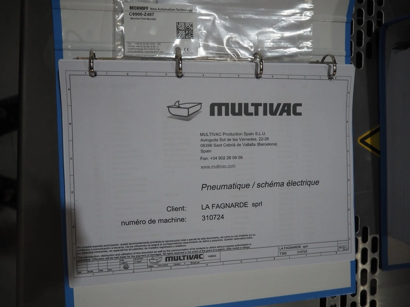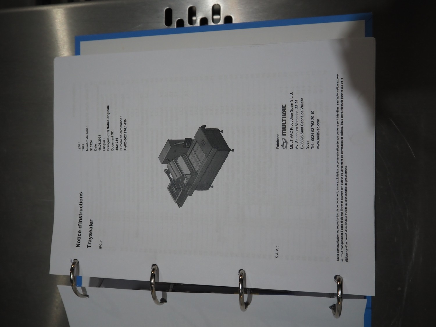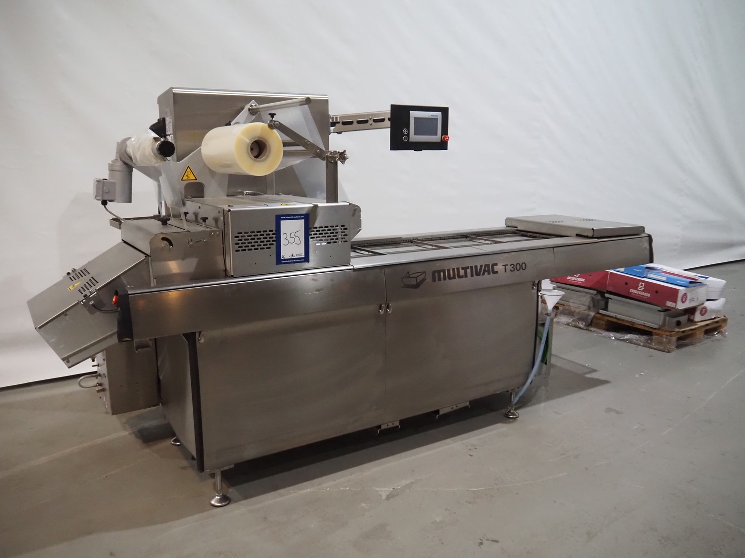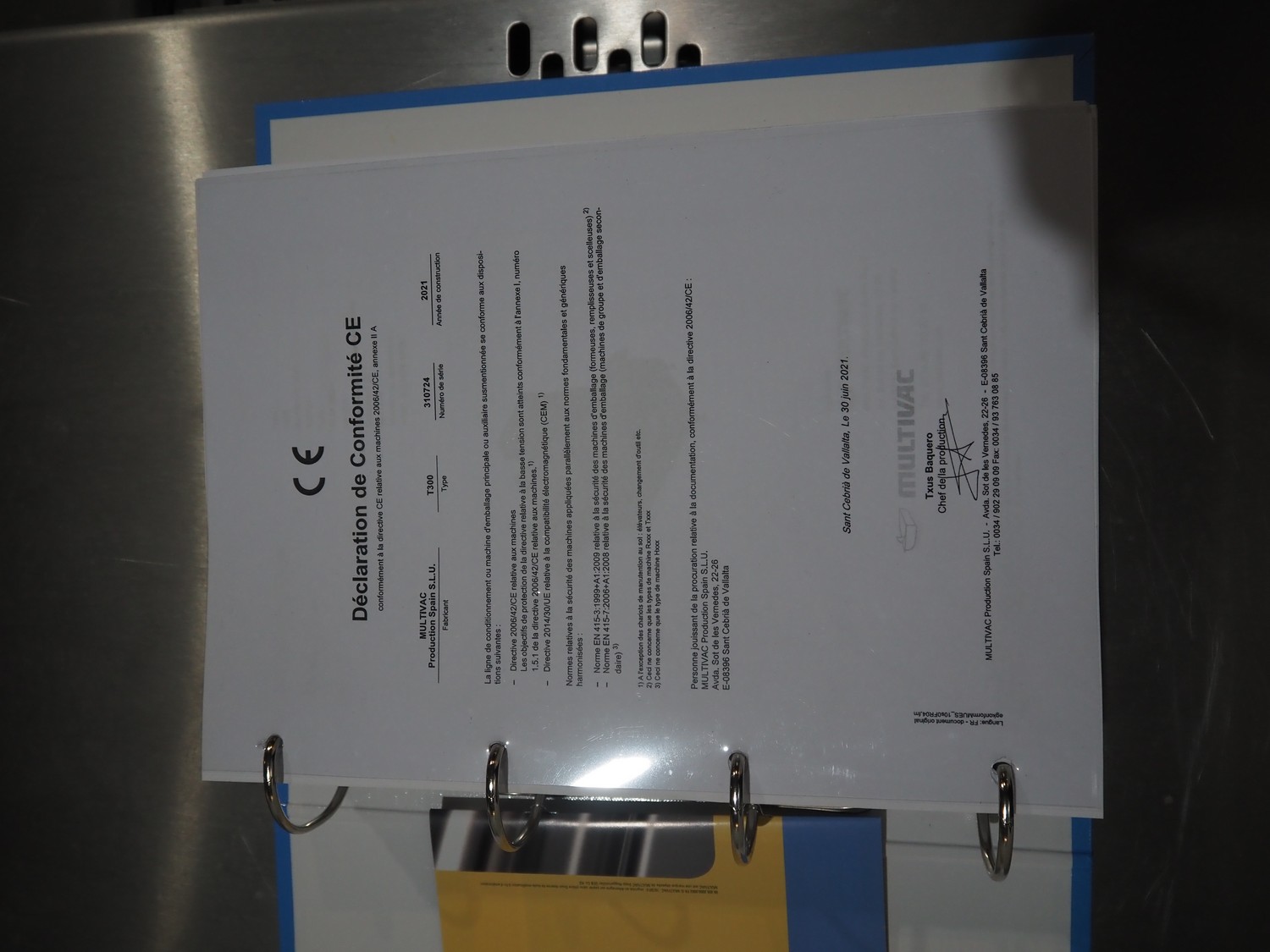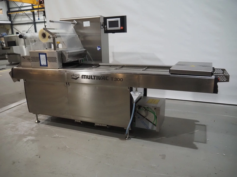 Multivac traysealer, type: T300, serial number: 310724, year of construction: 2021, 400/230 V, 3 Ph, 50 Hz, 34.7 A, 8.8 kW, Busch vacuum pump, capacity: 100 m³ per hour, dimensions dyes: 247 mm x 314 mm, 230 mm x 145 mm, 175 mm x 228 mm and 256 mm x 175 (for skin packing), dimensions: 3200 mm x 1100 mm x 1700 mm.