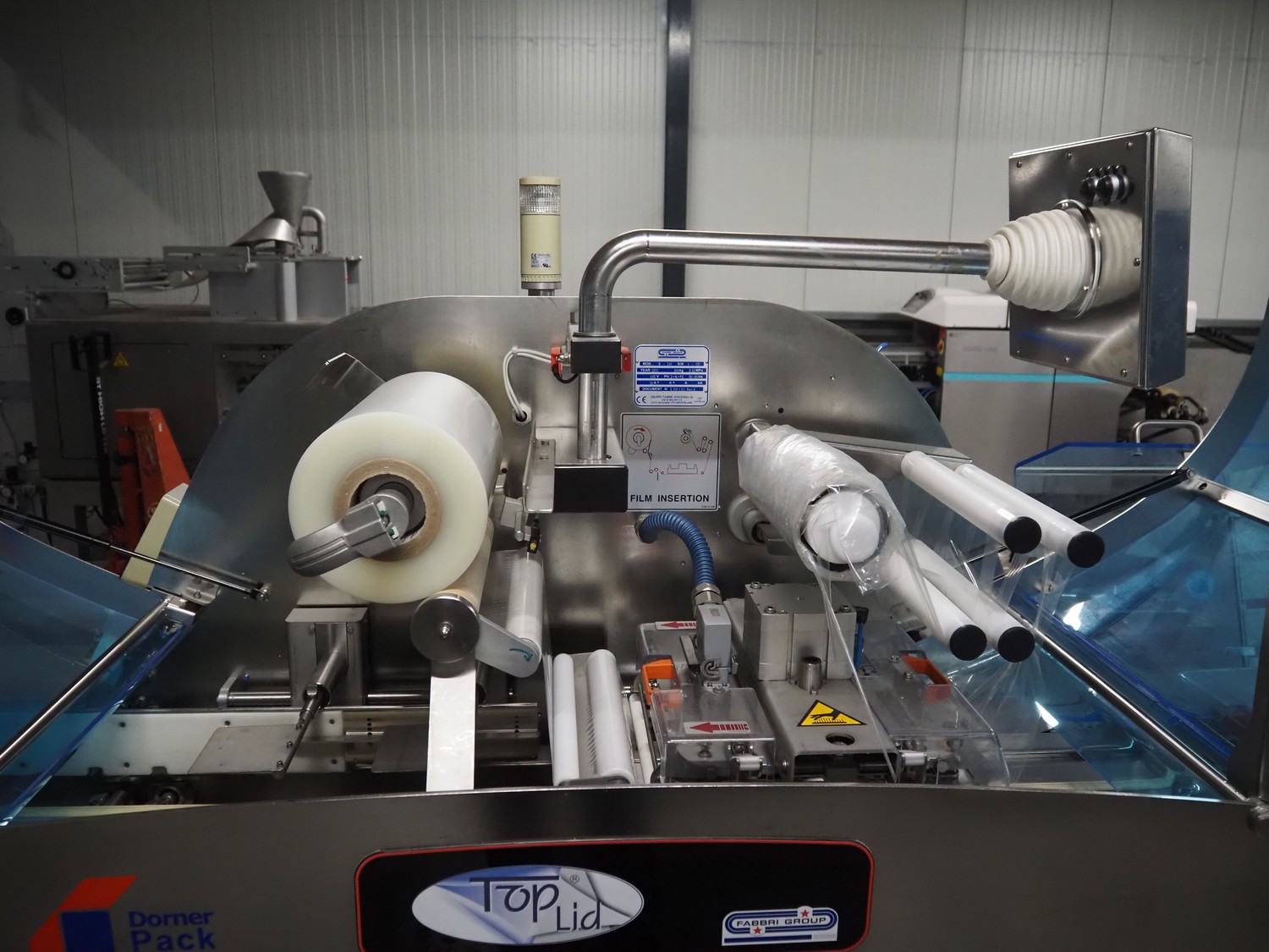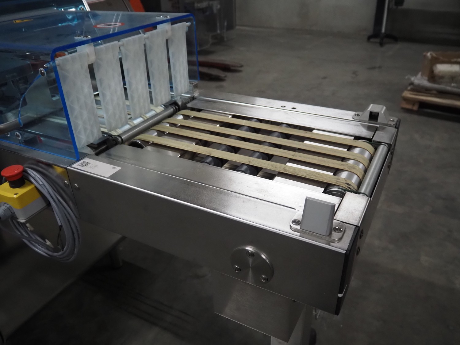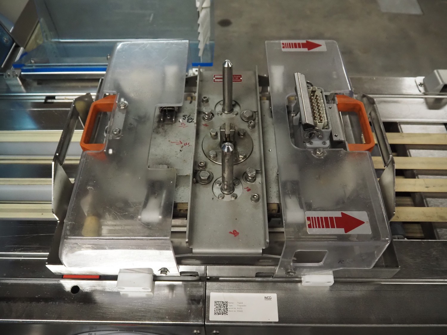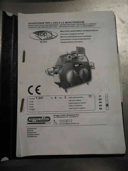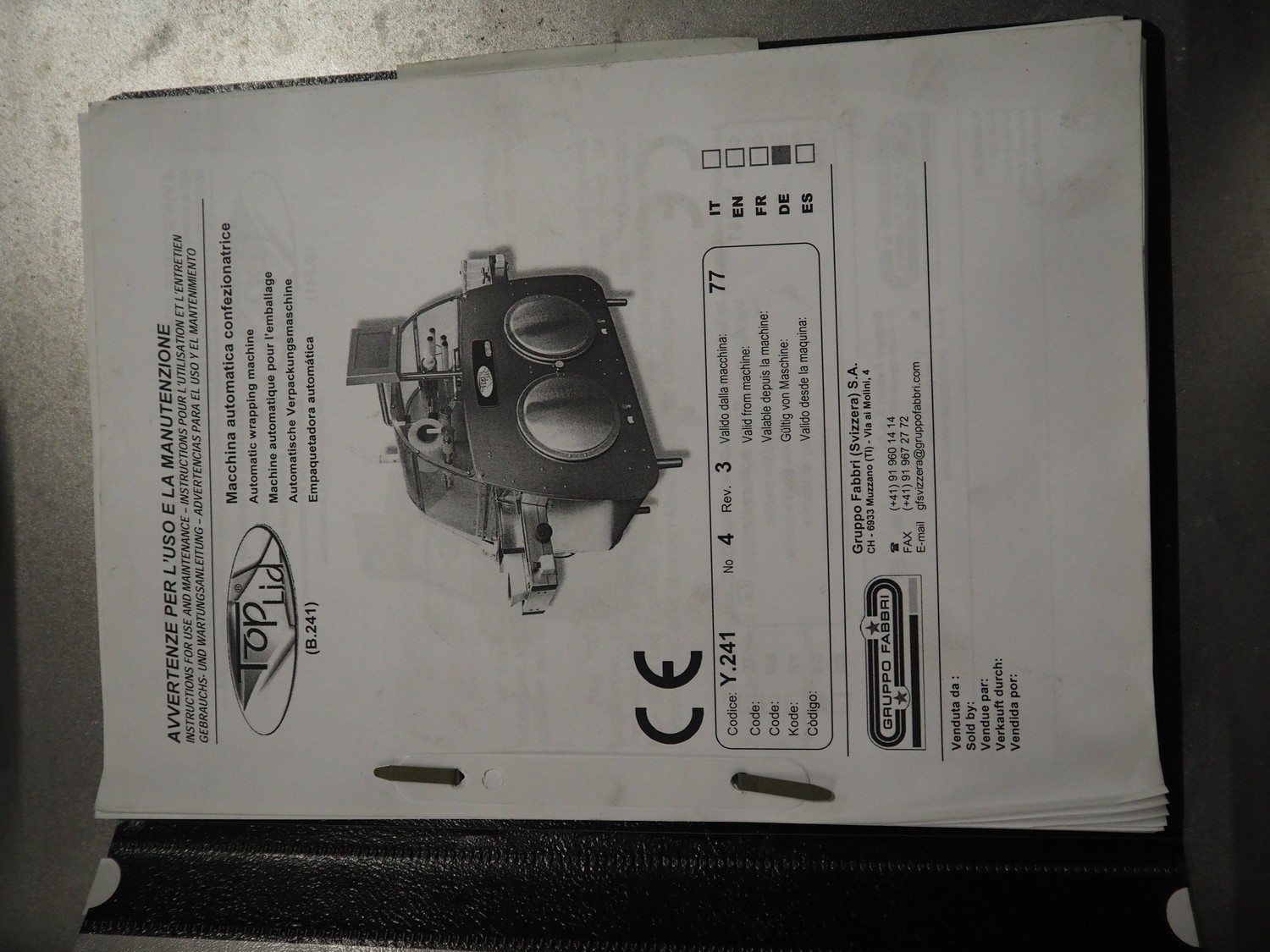Gruppo Fabbri SA traysealer, model: B-241, serial number: 4-251, year of construction: 2012, 400 V, 3 Ph, 50-60 Hz, 10 A, weight: 610 kg, plastic string belt, belt width: 175 mm, dimensions dye: 300 mm x 240 mm, film width: 330 mm, total dimensions: 3830 mm x 950 mm x 1770 mm.