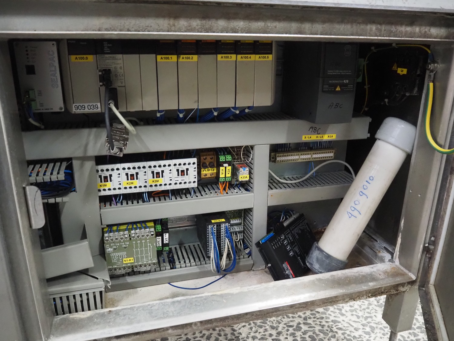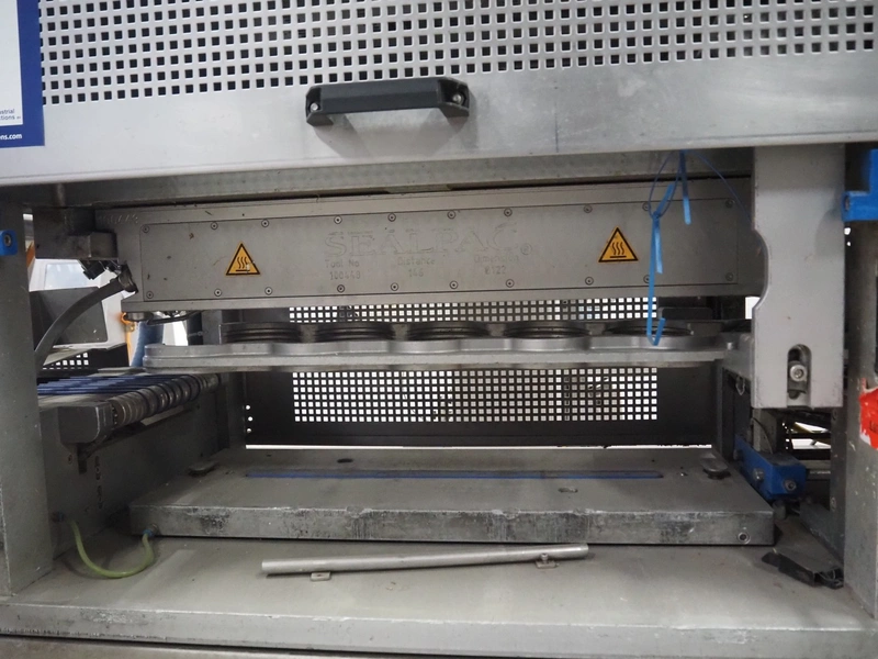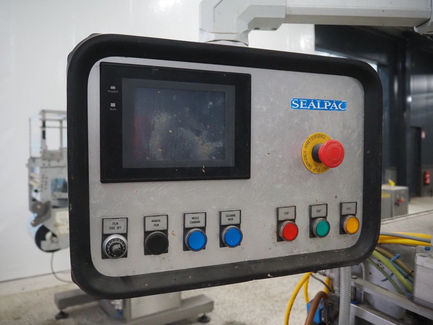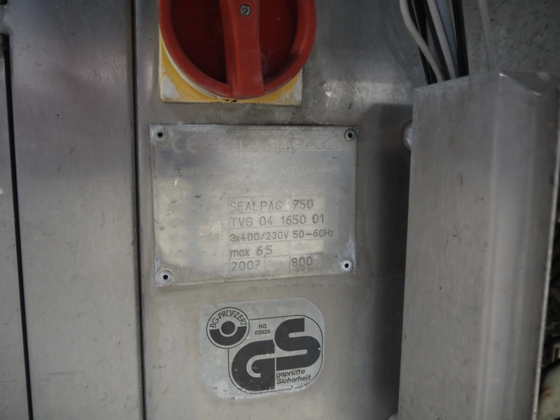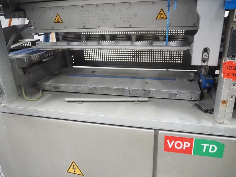 Sealpac traysealer, type: Sealpac 750, serial number: TVS 04 1650 01, year of construction: 2007, 3x400/230 V, 50-60 Hz, 6.5 kW, dye: (5x) Ø 122 mm, total dimensions: 3200 mm x 800 mm x 2000 mm. Incomplete, technical condition unknown.