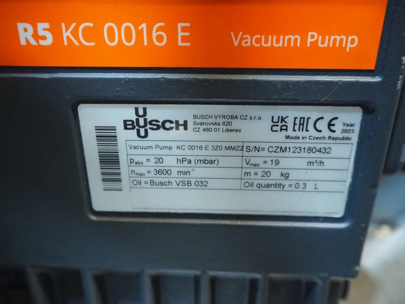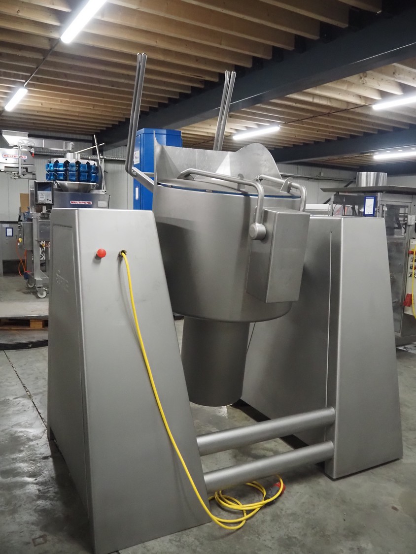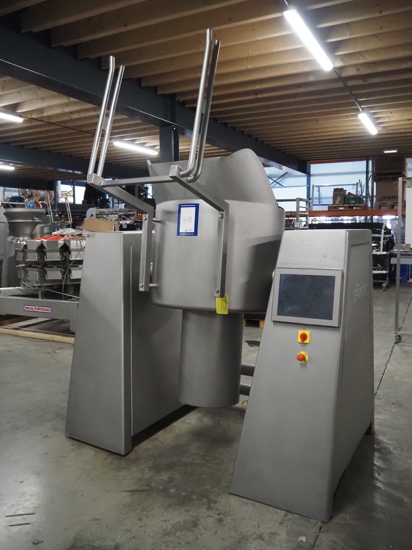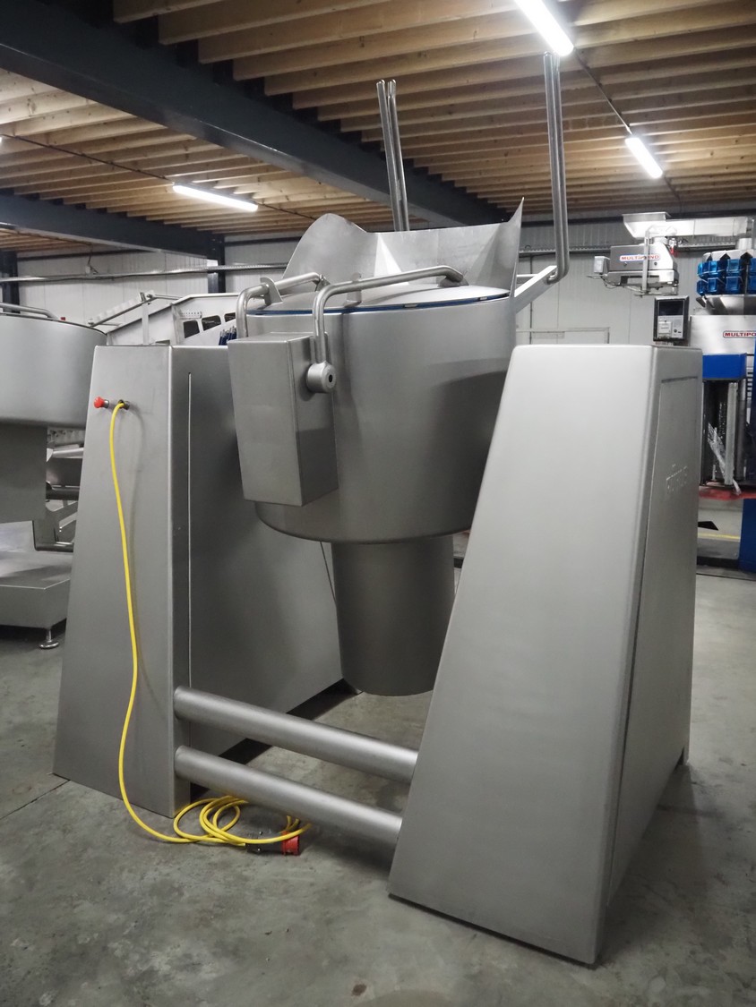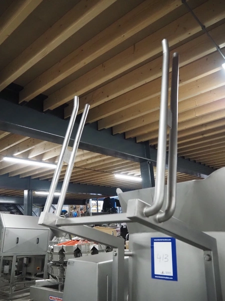Rühle cooled vacuum tumbler with double lifter for 200 liter meat bins, Busch vacuum pump, type: KC 0016 E 3Z0 MMZZ, capacity: 16 m³ per hour, Rivacold cooling compressor, year of construction: 2025, total dimensions: 1900 mm x 1600 mm x 2400 mm.