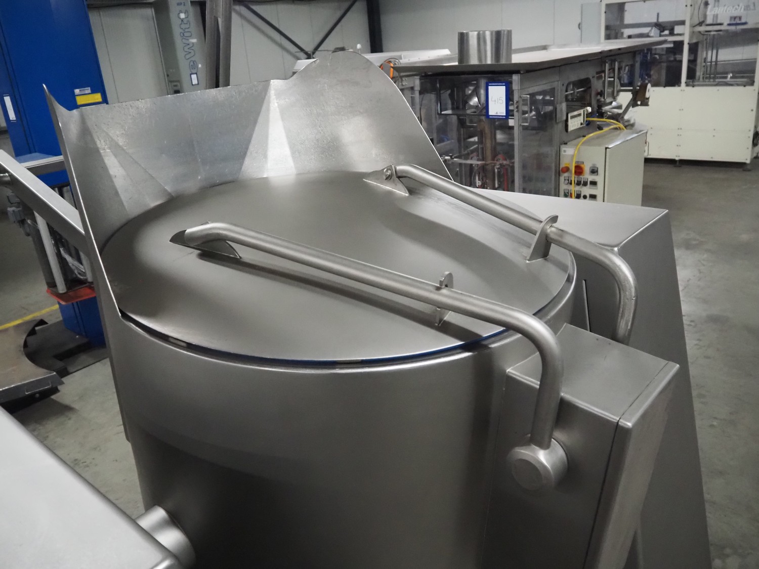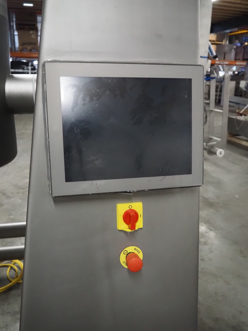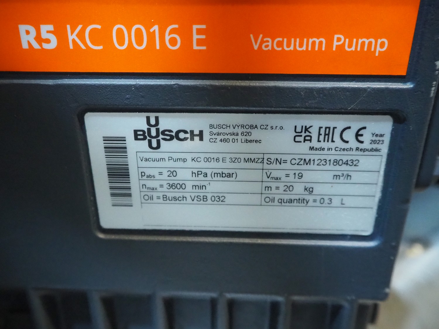 Rühle cooled vacuum tumbler with double lifter for 200 liter meat bins, Busch vacuum pump, type: KC 0016 E 3Z0 MMZZ, capacity: 16 m³ per hour, Rivacold cooling compressor, year of construction: 2025, total dimensions: 1900 mm x 1600 mm x 2400 mm.