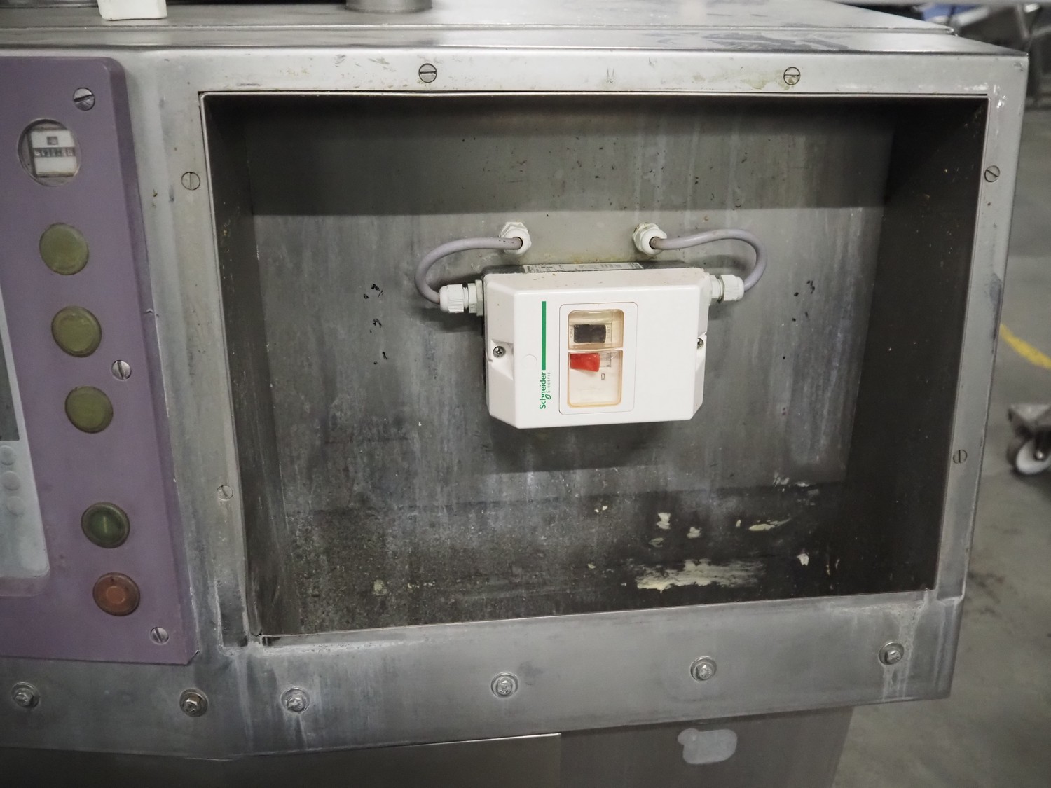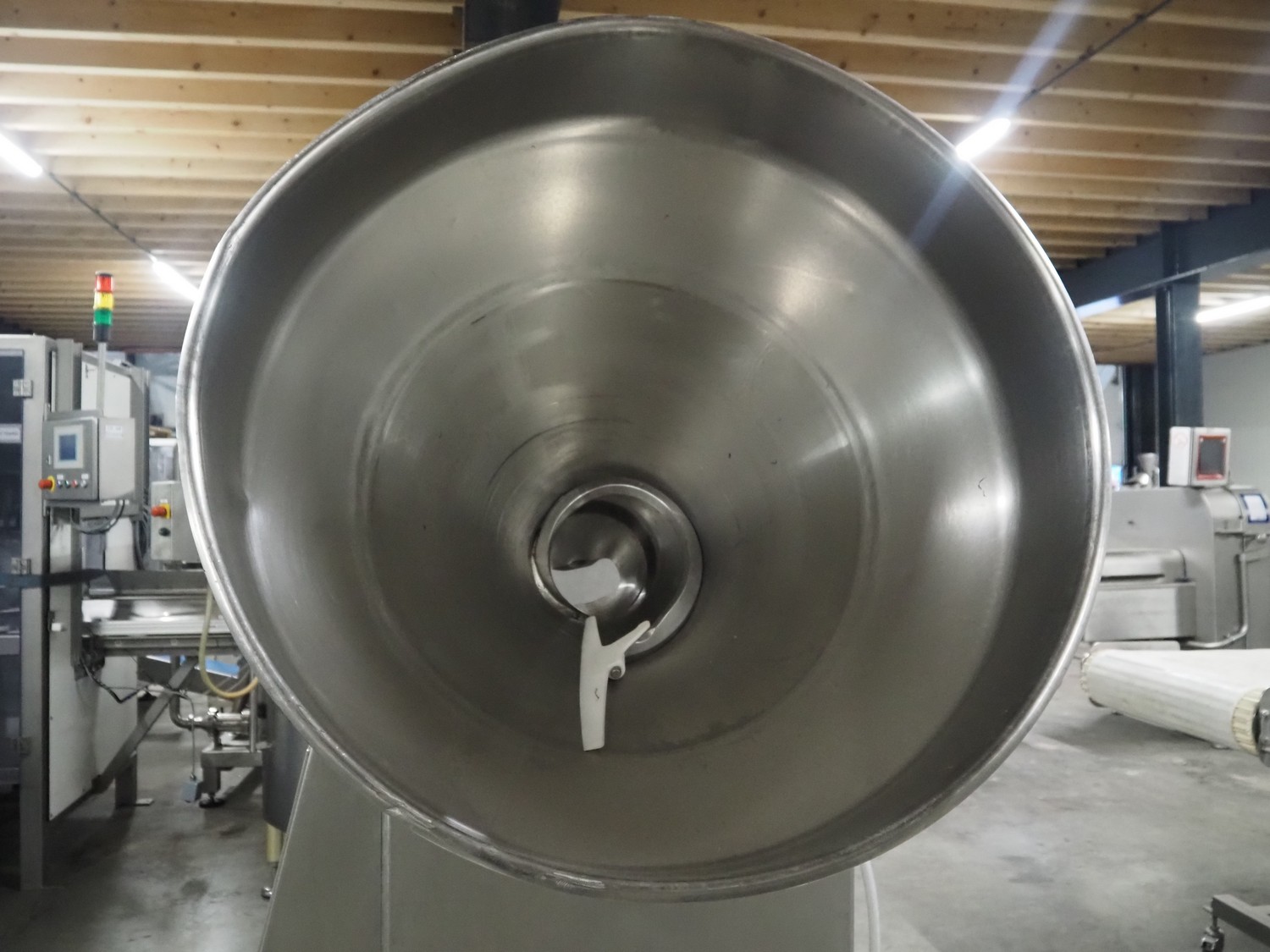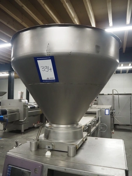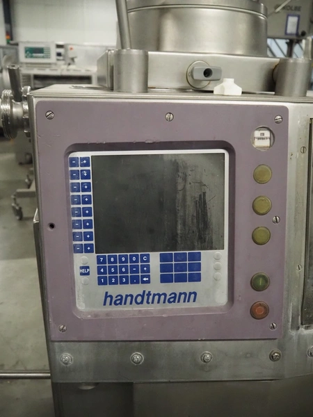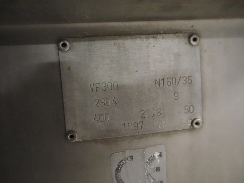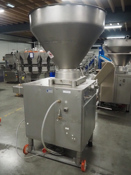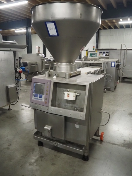 Handtmann mobile vacuum filling machine, type: VF300, number: 2804, year of construction: 1997, 400 V, 50 Hz, 21.8 A, 9 kW, dimensions: 1150 mm x 950 mm x 2050 mm. Incomplete.