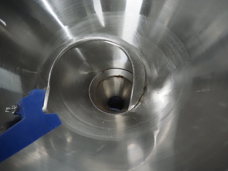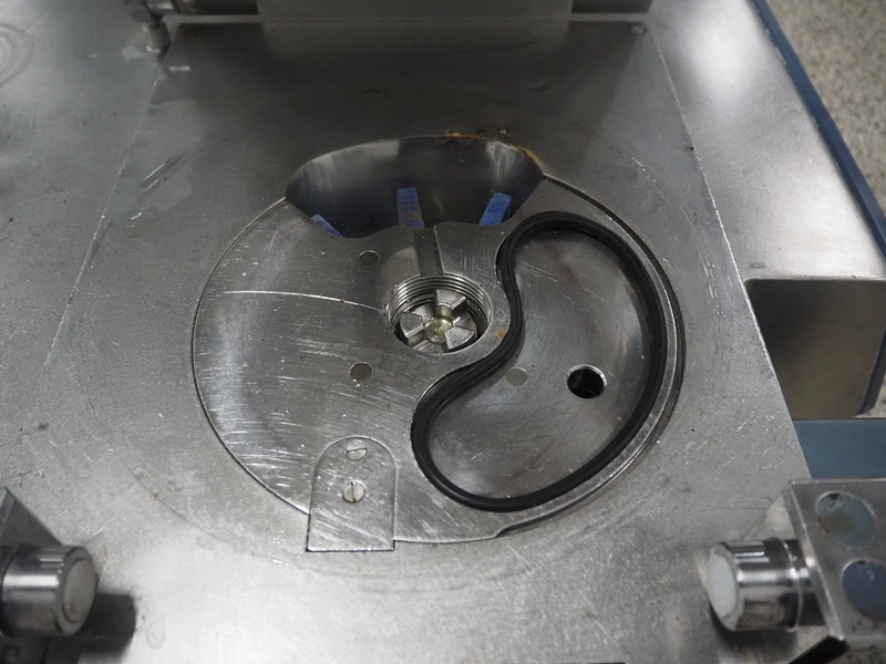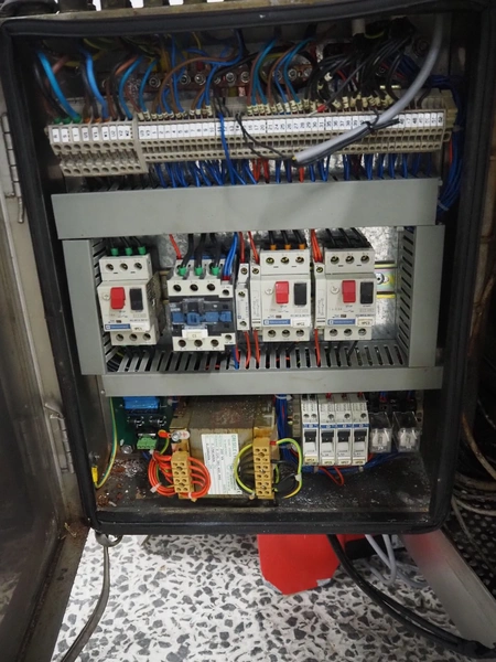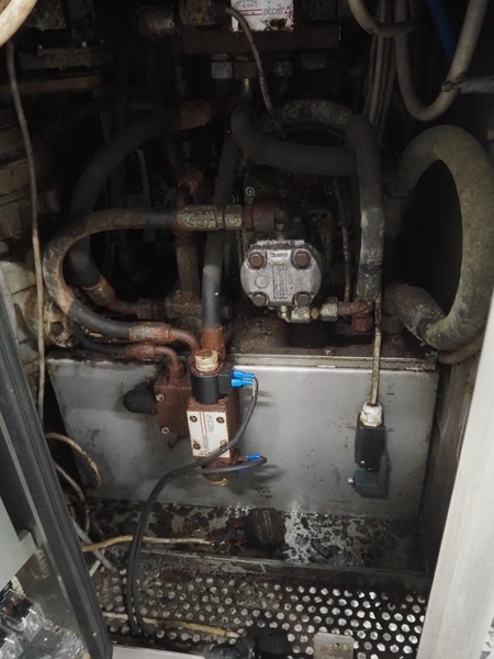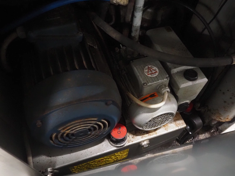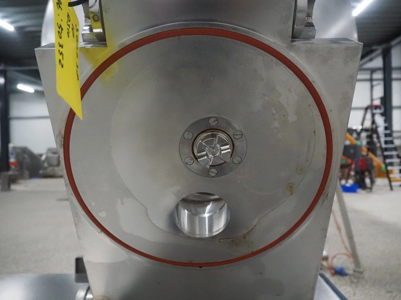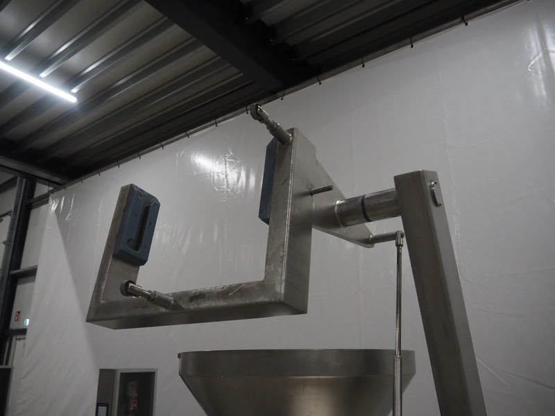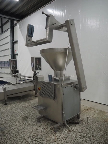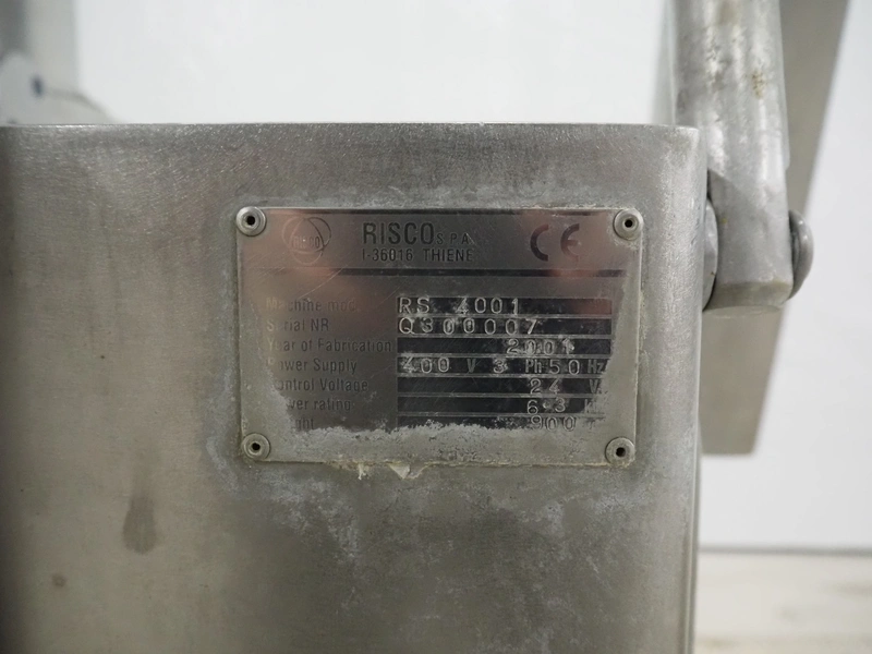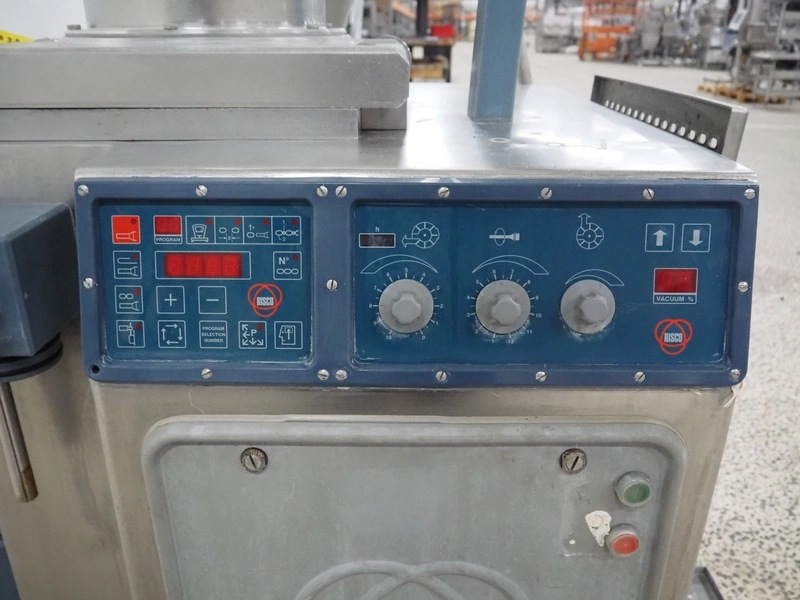 Risco S.P.A. vacuum filling machine with lifter for 200 liter meat bins, model: RS 4001, serial number: Q300007, year of construction: 2001, 400 V, 3 Ph, 50 Hz, 6.3 kW, Busch vacuum pump, dimensions: 1350 mm x 1350 mm x 2650 mm.