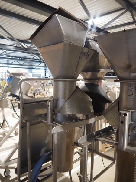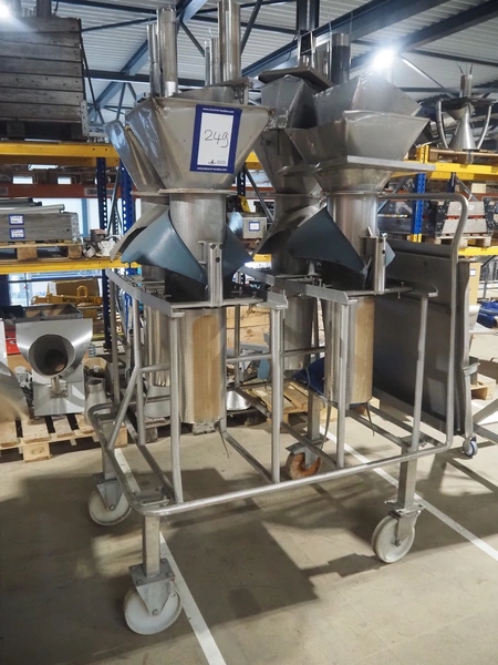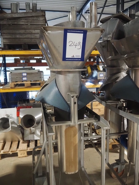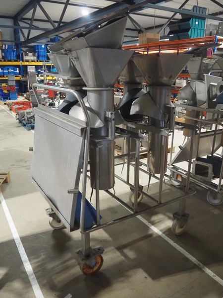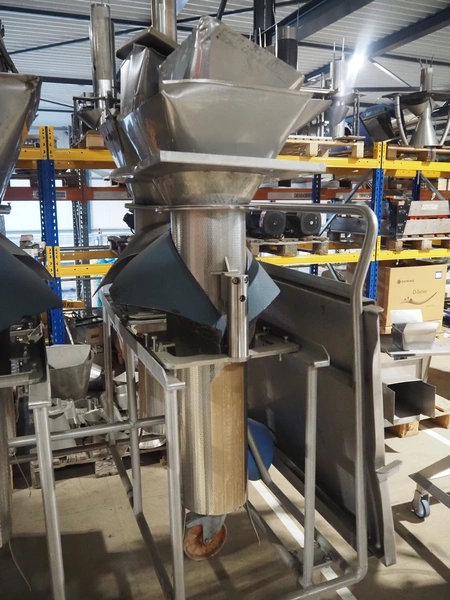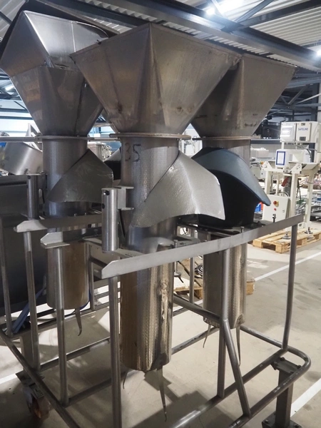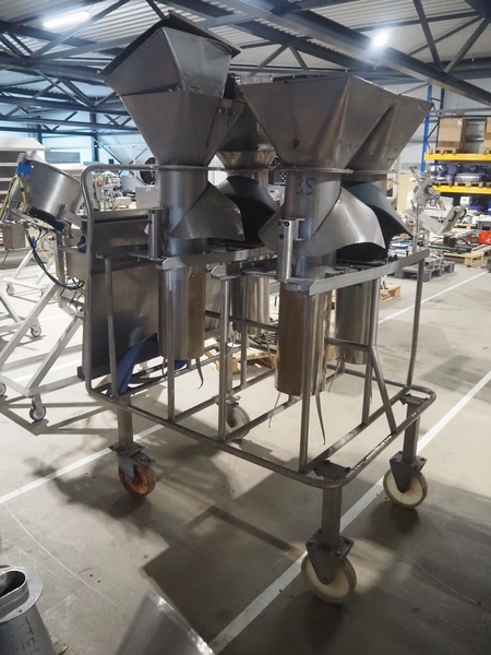 S/s trolley with 4 s/s filling pipes for GEA SX 400 vertical bag form, fill, and sealing machine, pipe dimensions: (4x) Ø 185 mm x 1050 mm, total dimensions: 1300 mm x 1000 mm x 1900 mm.