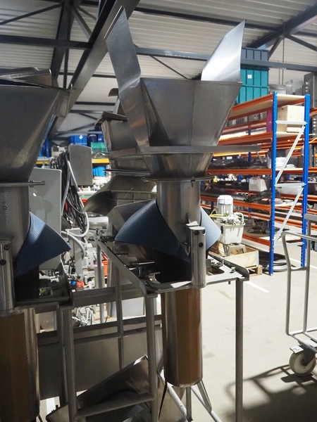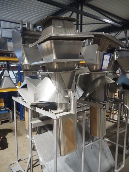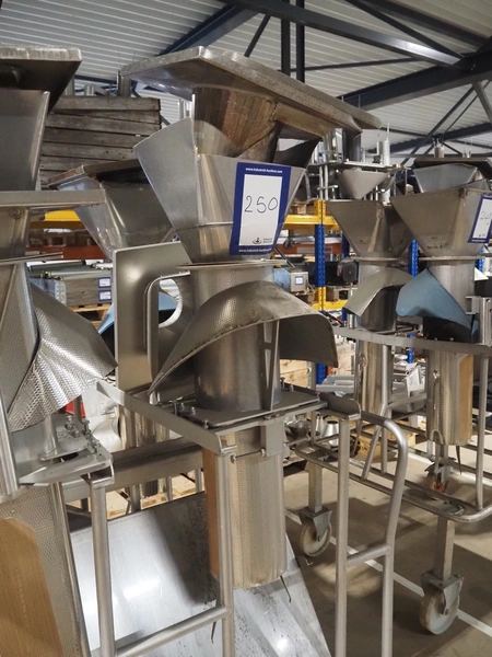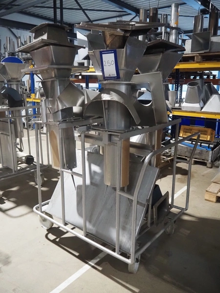 S/s trolley with 4 s/s filling pipes for GEA SX 400 vertical bag form, fill, and sealing machine, pipe dimensions: (2x) Ø 150 mm x 1000 mm, (1x) Ø 200 mm x 1000, (1x) 200 mm x 160 mm x 1000 mm, total dimensions: 1300 mm x 1000 mm x 1900 mm.
