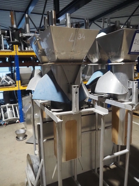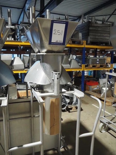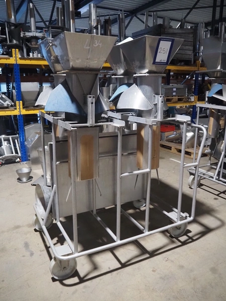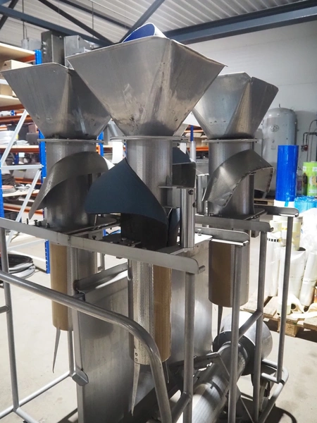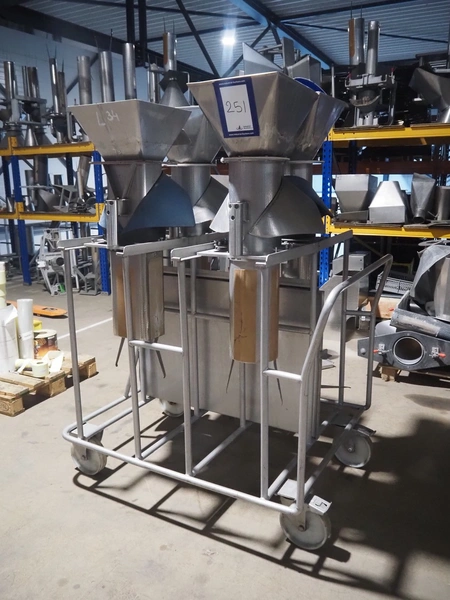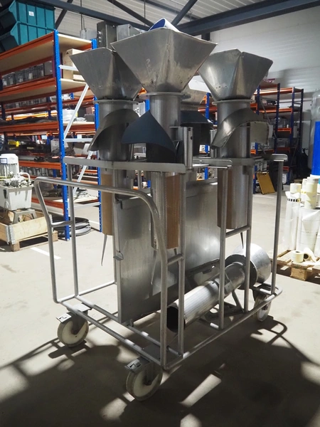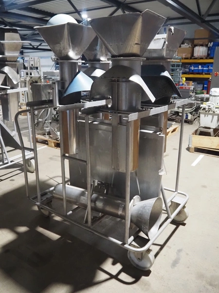 S/s trolley with 4 s/s filling pipes for GEA SX 400 vertical bag form, fill, and sealing machine, pipe dimensions: (2x) Ø 200 mm x 1000 mm, (1x) Ø 150 mm x 1000, (1x) 210 mm x 160 mm x 1000 mm, total dimensions: 1300 mm x 1000 mm x 1900 mm.