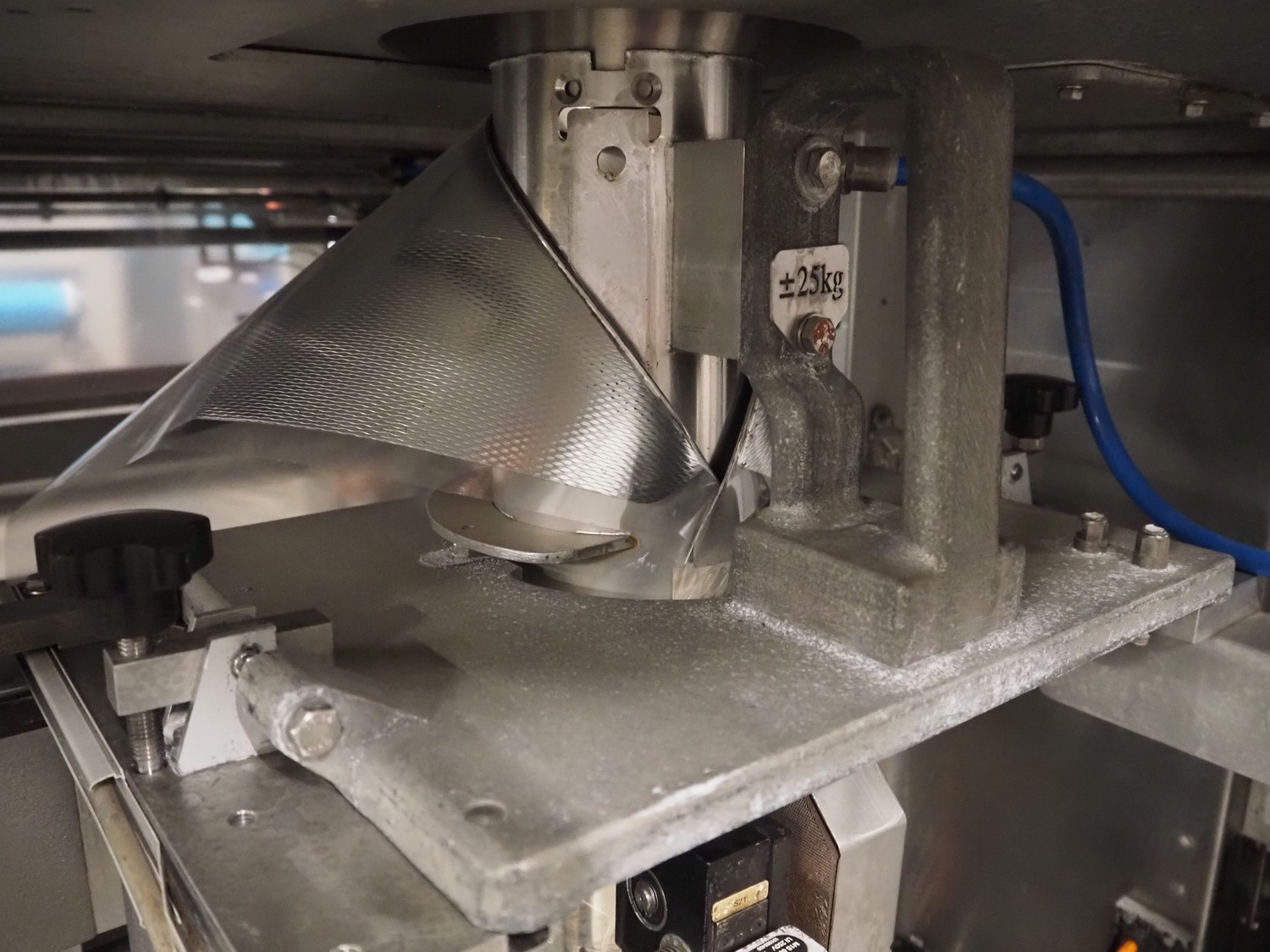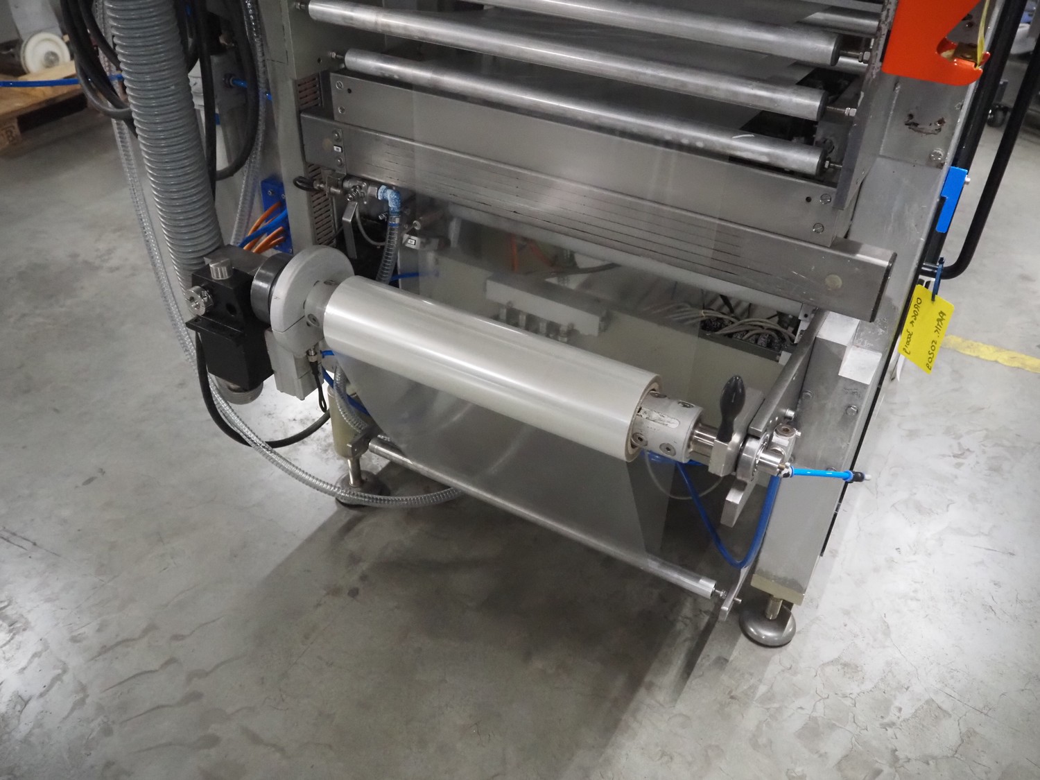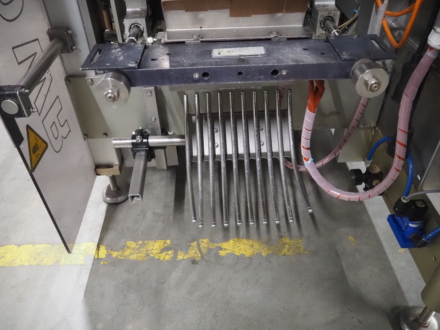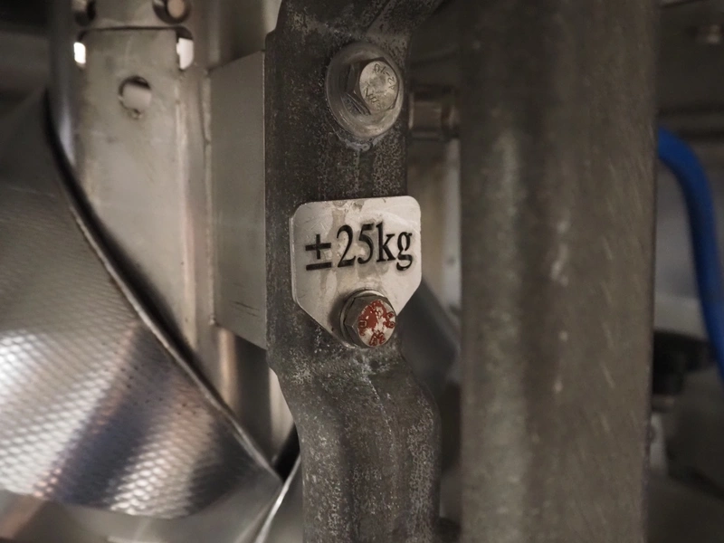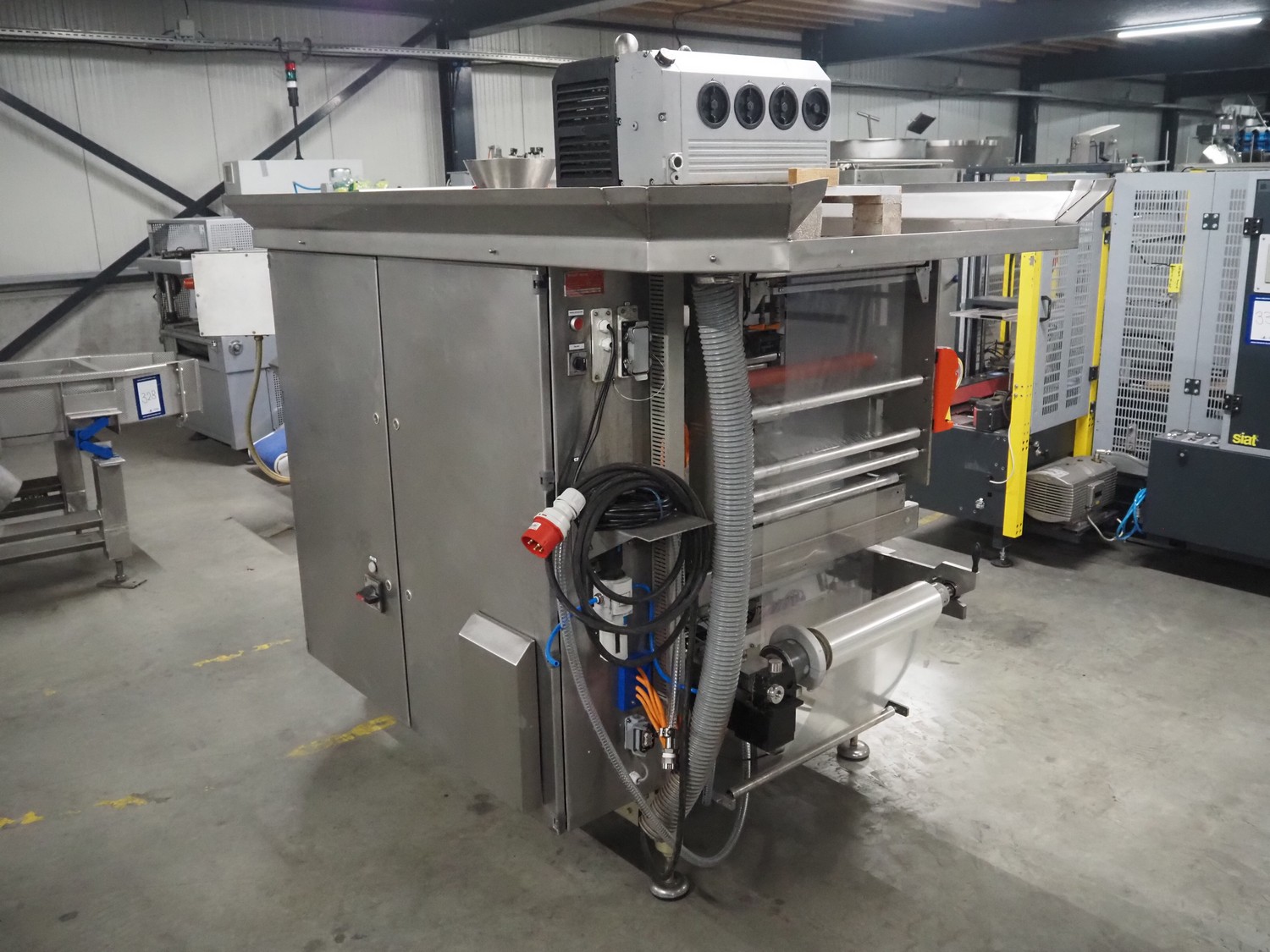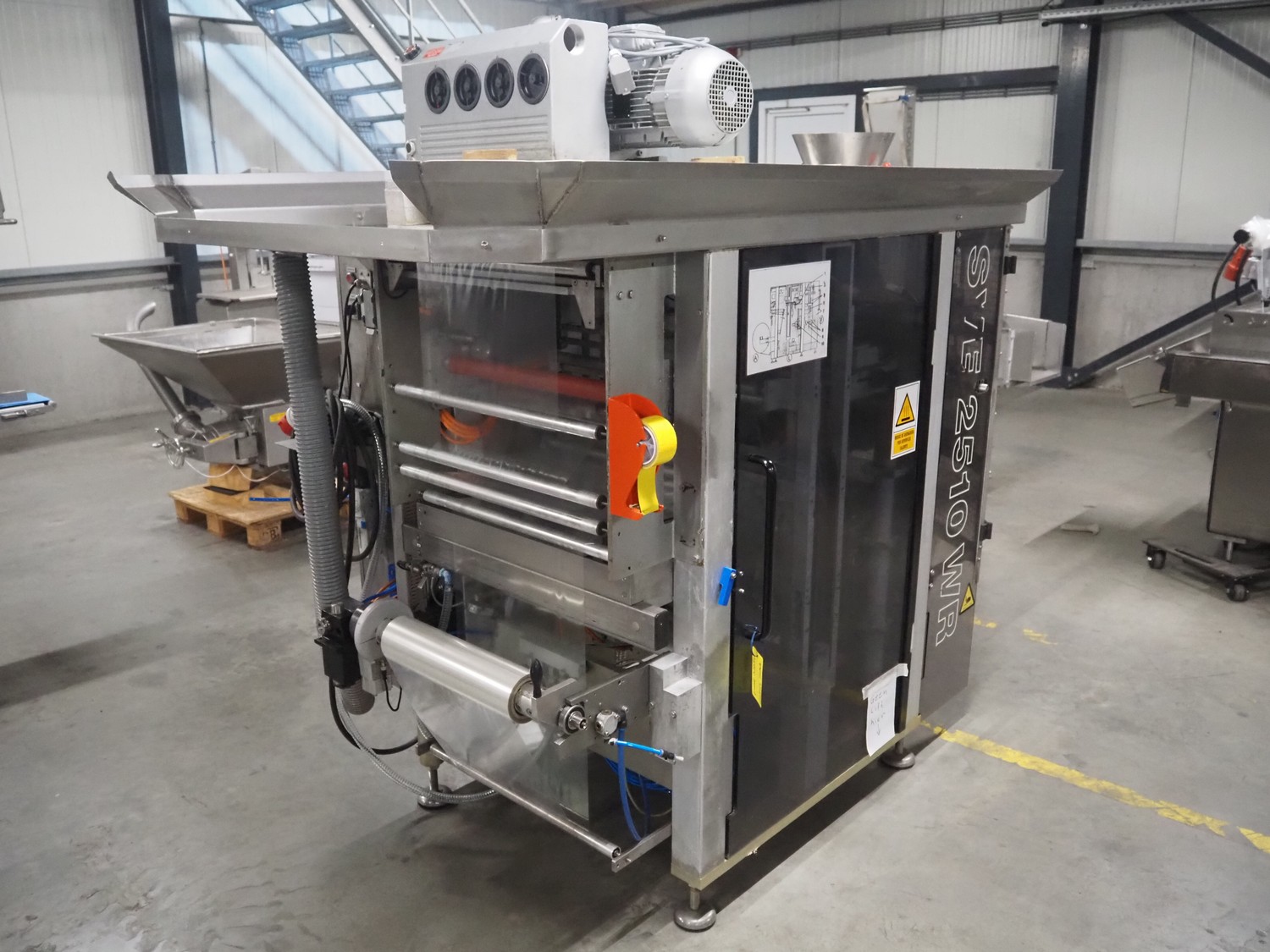 Bosch vertical bag form-, fill- and seal machine, type: SVE 2510 WR, number: 808689MS7533N, year of construction: 2006, film width: 443, diameter filling pipe: 115 mm, vertical seal length: 350 mm, horizontal seal length: 285 mm, total dimensions: 2550 mm x 1500 mm x 1800 mm. Including Garden Denver vacuum pump, type: V-VC 150 (20), capacity: 150 m³ per hour, dimensions: 800 mm x 450 mm x 300 mm.