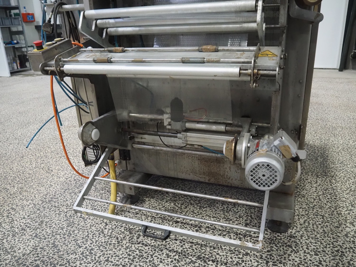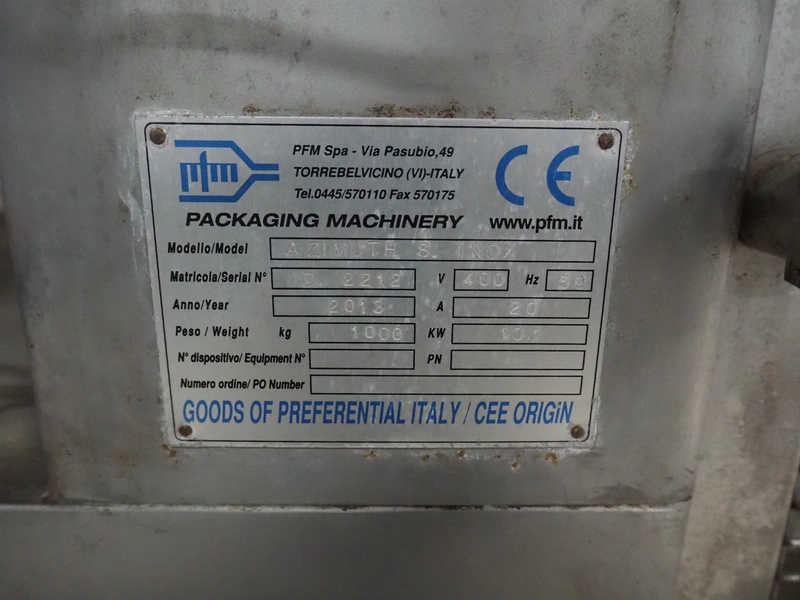 PFM packaging machinery vertical bag form-, fill-, and seal machine, model: A ZIMYTH S INOX, serial number: 2212, year of construction: 2013, 400 V, 50 Hz, 20 A, 10.1 kW, weight: 1000 kg, vertical seal length: 500 mm, horizontal seal length: 350 kg, total dimensions: 2150 mm x 1550 mm x 2140 mm. Technical condition unknown.