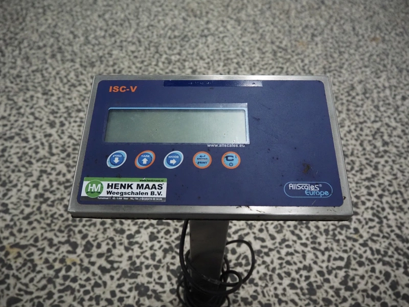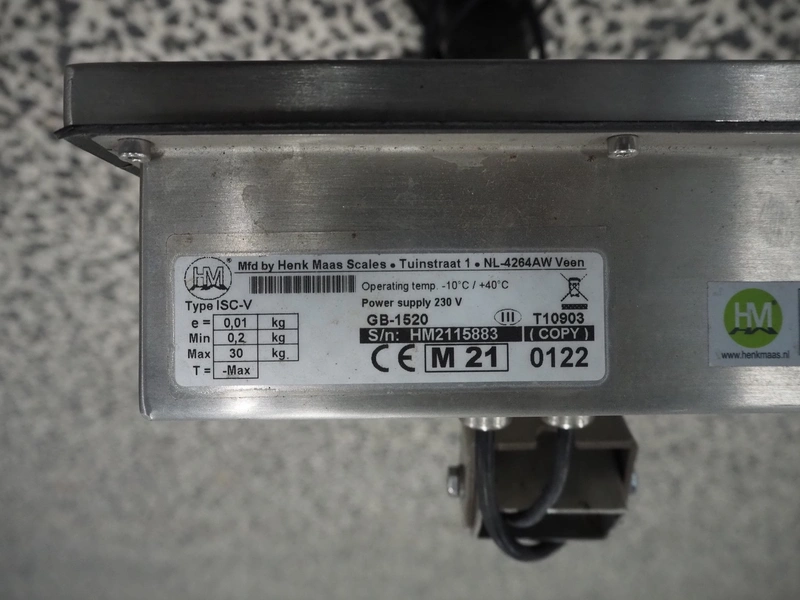 Henk Maas Scales weighing scale, type: ISC-V, serial number: HM2115883, 230 V, maximum capacity: 30 kg, minimum capacity: 0.2 kg, e= 0.01 kg, scale dimensions: 400 mm x 300 mm, total dimensions: 500 mm x 300 mm x 450 mm.