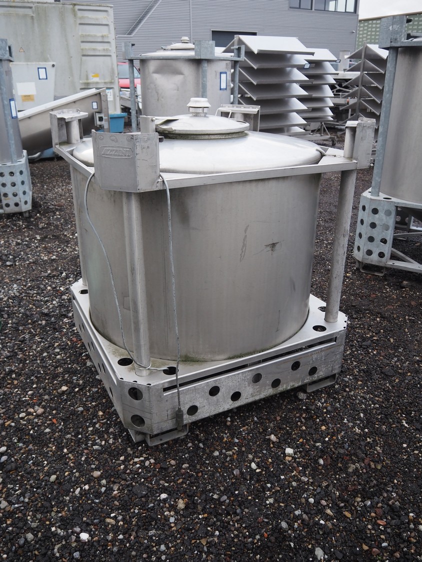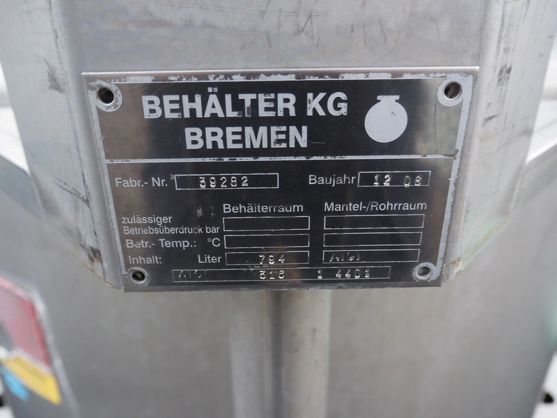 Behälter kg - Bremen s/s tank on steel frame, fabrication number: 39282, year of construction: 12.06, volume: 794 liter, dimensions frame: 1150 mm x 1150 mm x 1300 mm.