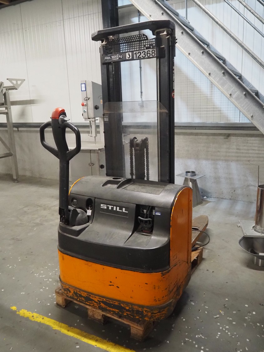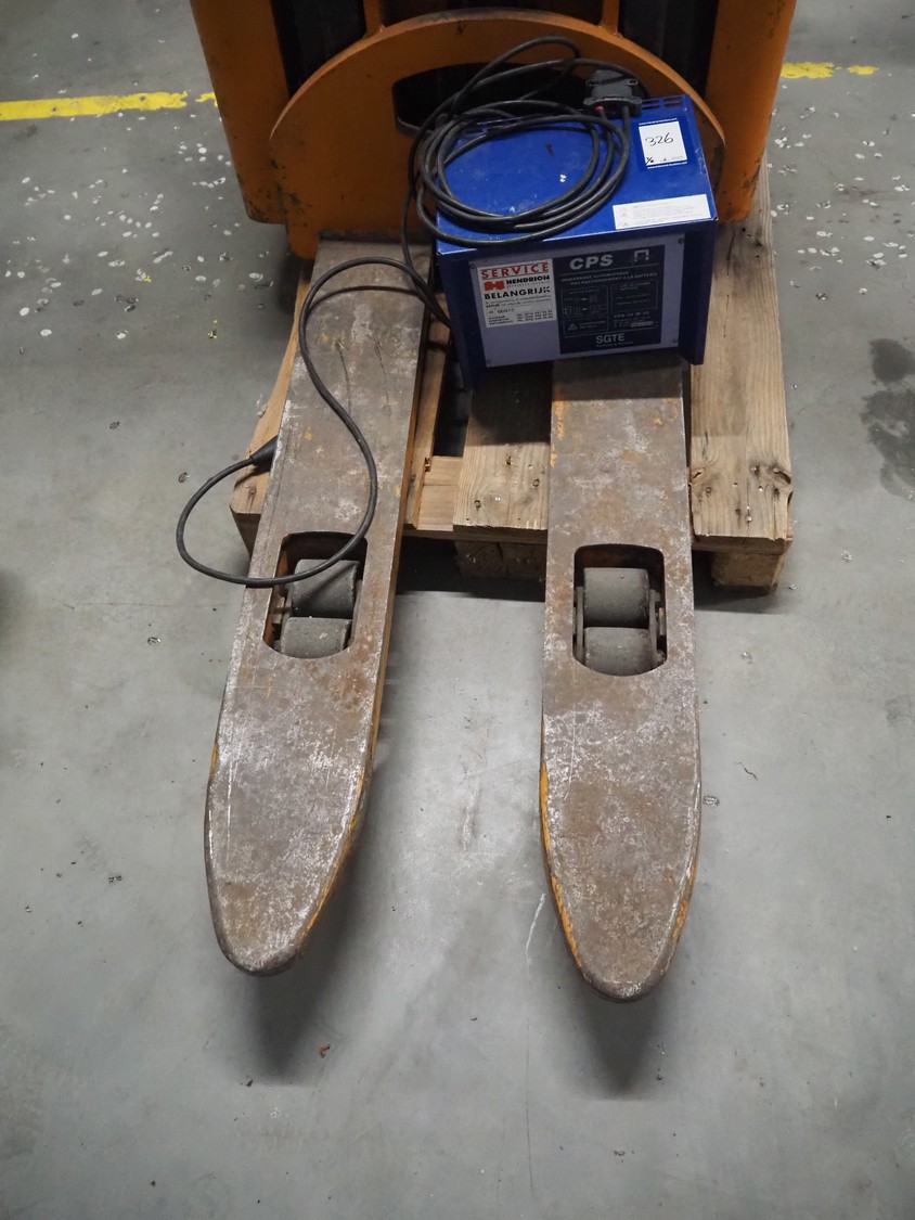 Still electrical pallet lifter, model: Electra stacker, fabrication number: 0240, year of construction: 2002, powered by 2 car batteries, fork length: 1150 mm, total dimensions: 1700 mm x 840 mm x 1940 mm.