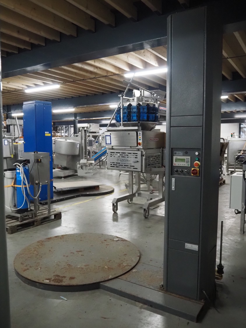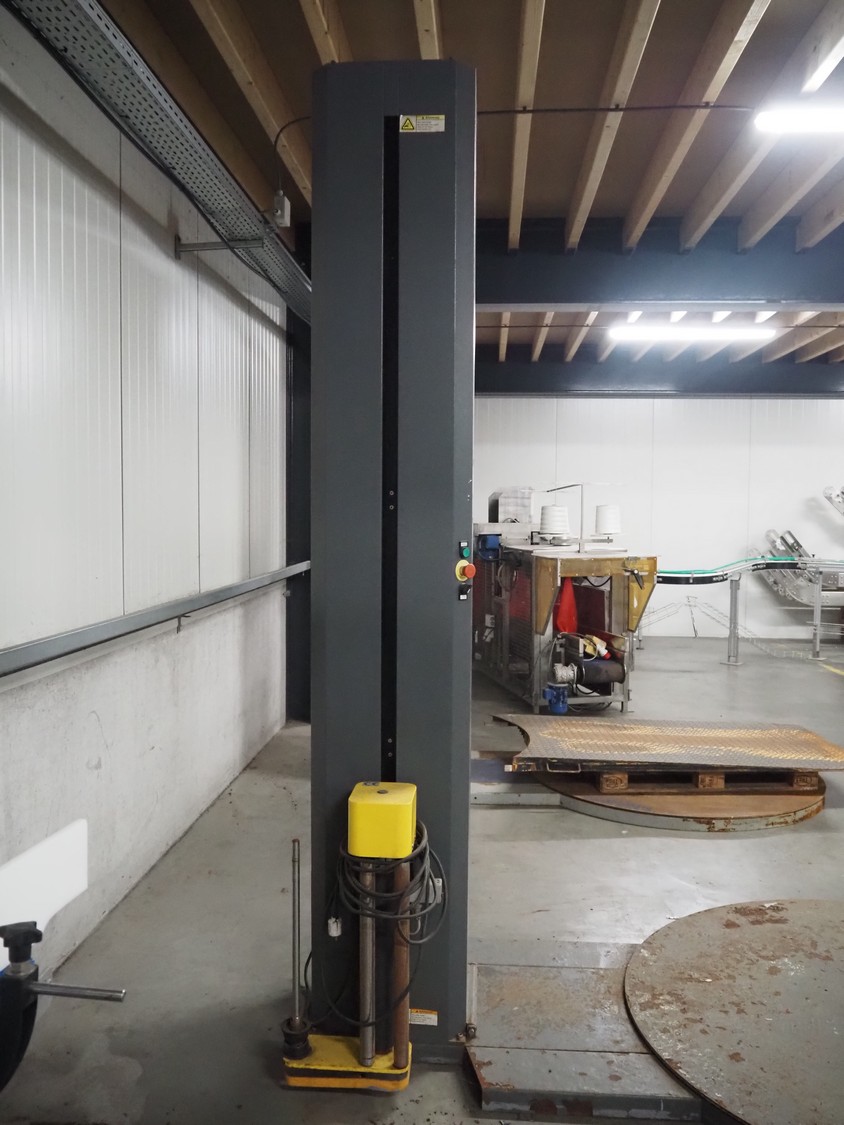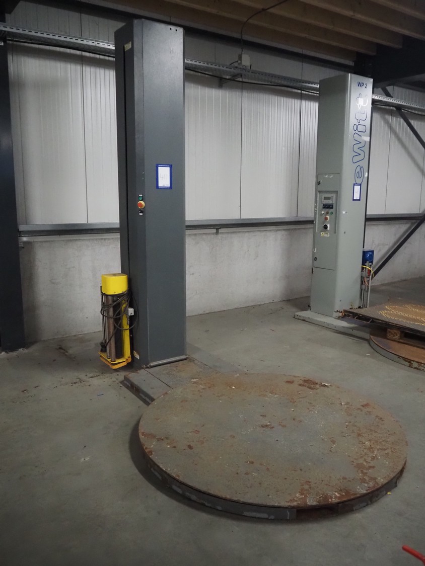 Meiwa pallet wrapper, type: WP1 EVC, serial number: E0701347, year of construction: 11/2007, 220 V, 60 Hz, 1000 W, steel platform, diameter platform: 1650 mm, total dimensions: 2650 mm x 1650 mm x 2820 mm.