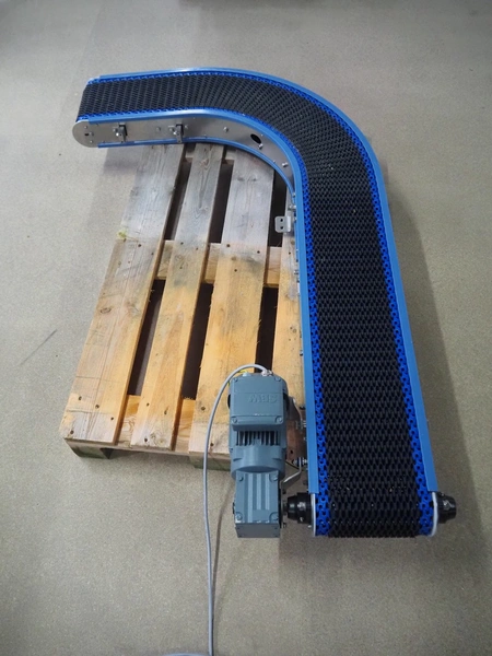 Hellings Machinebouw B.V. 90° curve conveyor, plastic mesh belt, belt width: 230 mm, total dimensions: 1600 mm x 1050 mm x 250 mm.