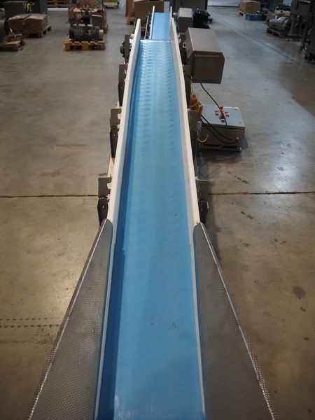 Elevating belt, s/s frame, plastic belt, belt width: 340 mm, elevating height: 960 mm, total dimensions: 770 mm x 2850 mm x 1090 mm.