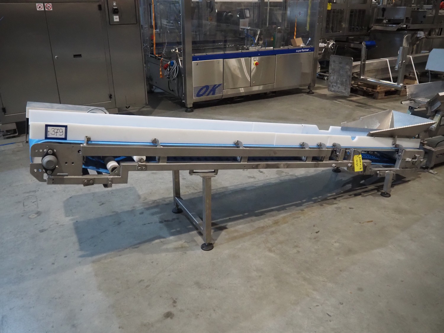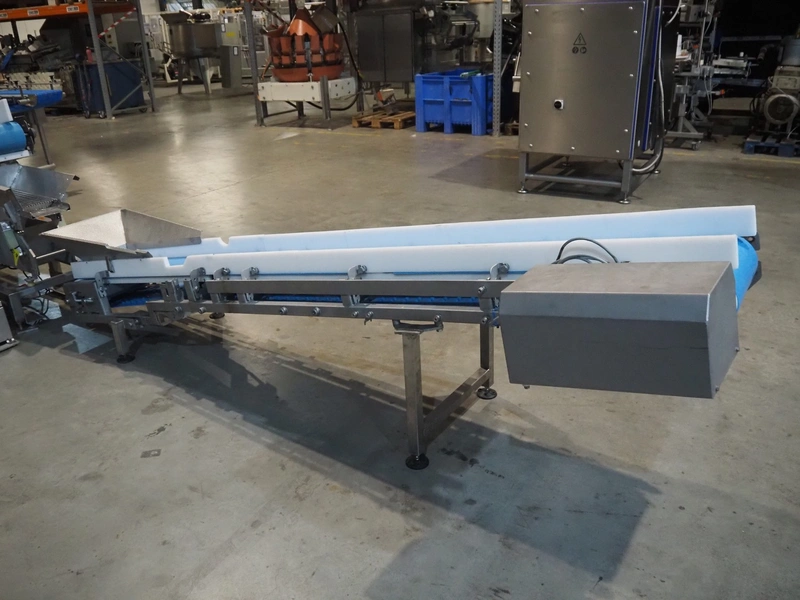 Elevating belt, s/s frame, plastic belt, belt width: 325 mm, elevating height: 800 mm, total dimensions: 3000 mm x 600 mm x 900 mm.
